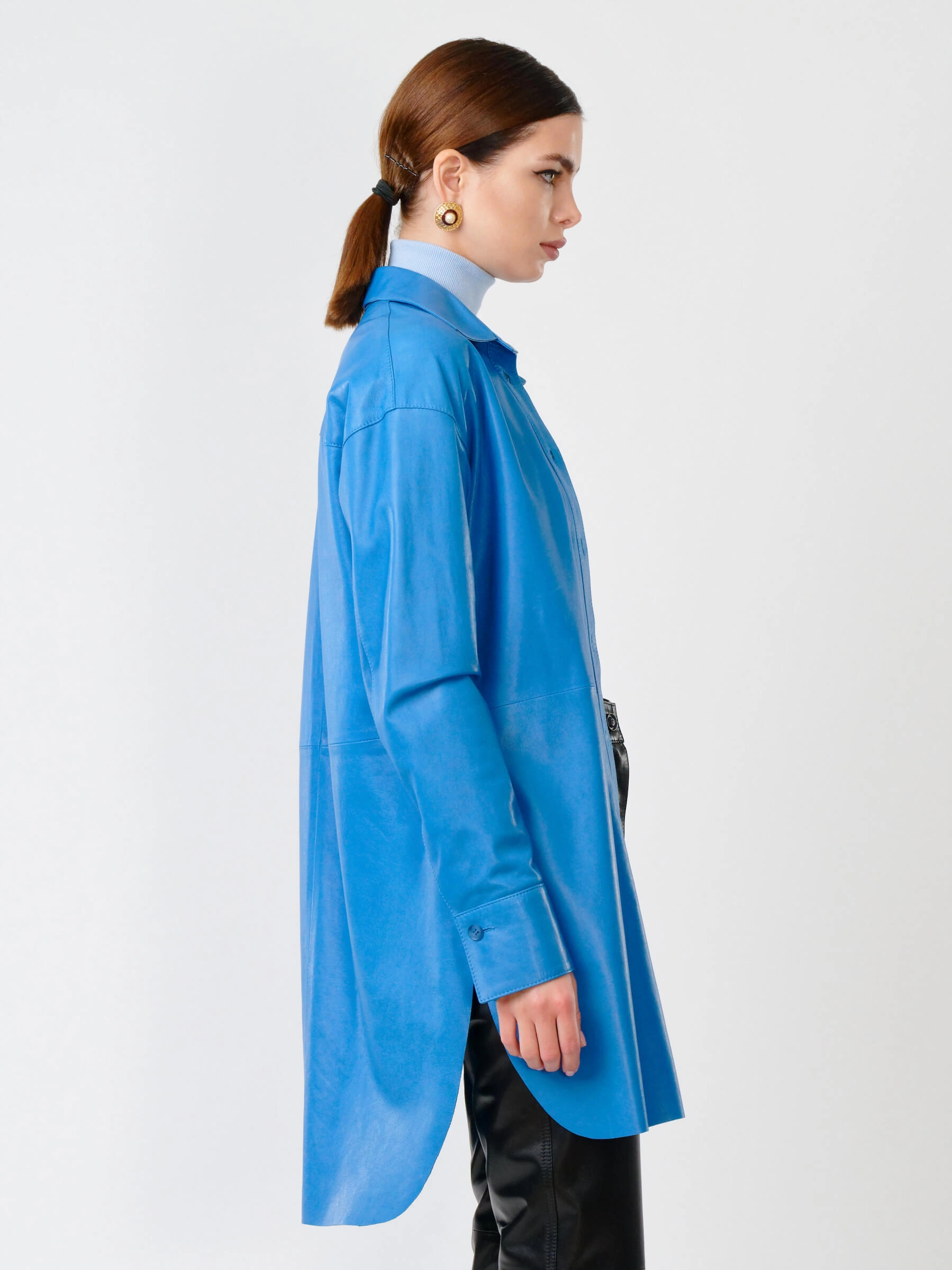 Товар женская кожаная рубашка с поясом из натуральной кожи 01_1, голубая, размер 46, артикул 90751 выполнен из натуральной кожи с застежкой пуговицы. Рассчитан на сезон: весна-лето. Длина изделия 94 см, силуэт свободный.