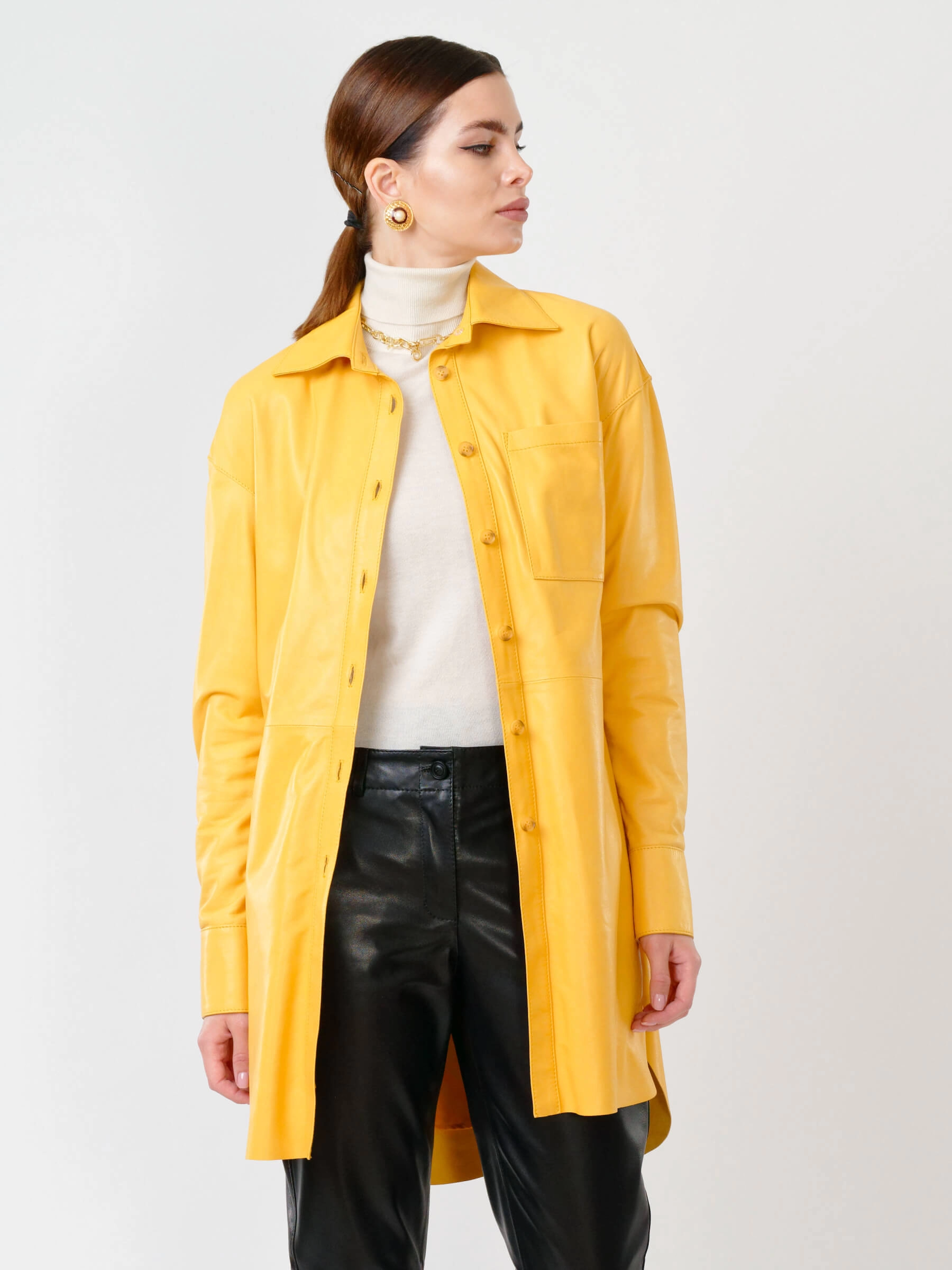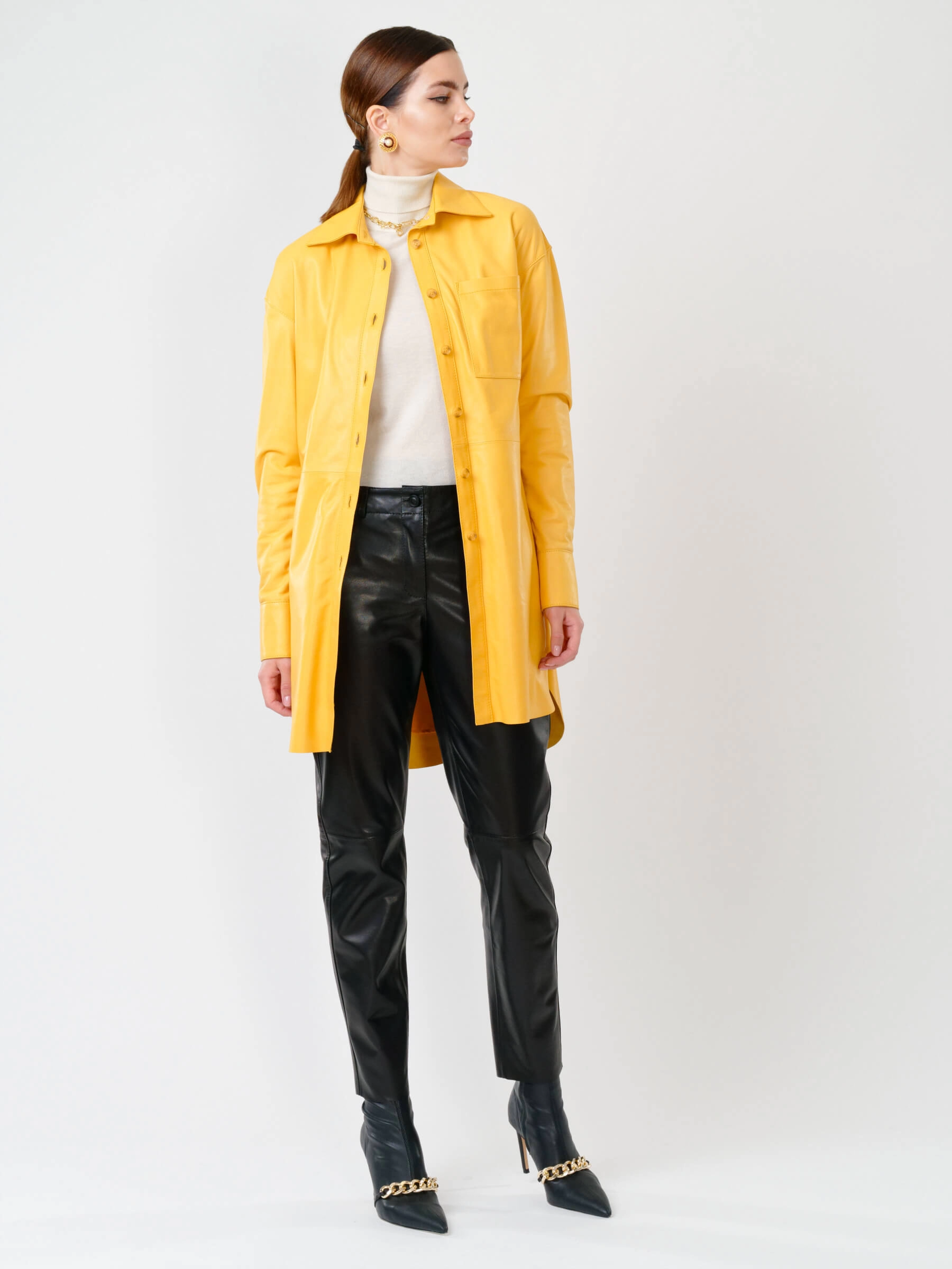 Женская рубашка из мягкой натуральной кожи в четырех цветах — идеальный баланс стиля и практичности. Прямой силуэт с застежкой на пуговицах оформлен изысканным отложным воротником и аккуратными манжетами, а функциональный нагрудный карман и изящные закругленные разрезы по бокам добавляют образу характер. Широкий кожаный пояс подчеркивает талию, позволяя варьировать образ от бунтарского с кожаными брюками и ботильонами до непринужденного с джинсами и кедами. Особую прелесть модели придает бархатистая фактура кожи, которая великолепно играет со светом, сохраняя при этом комфорт при носке. Универсальный оттенки, удобная посадка и продуманные детали делают эту рубашку must-have для ценительниц небанальных решений в повседневном гардеробе.