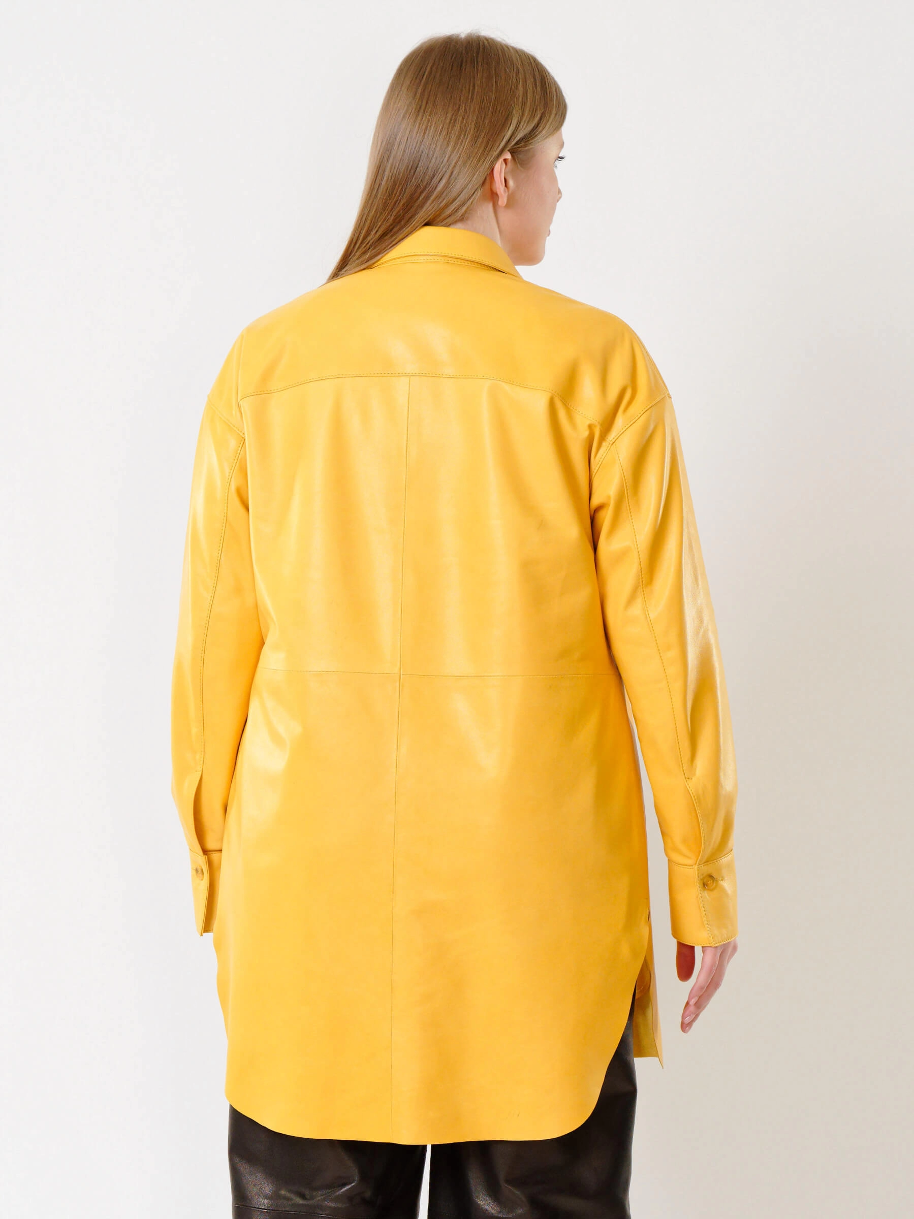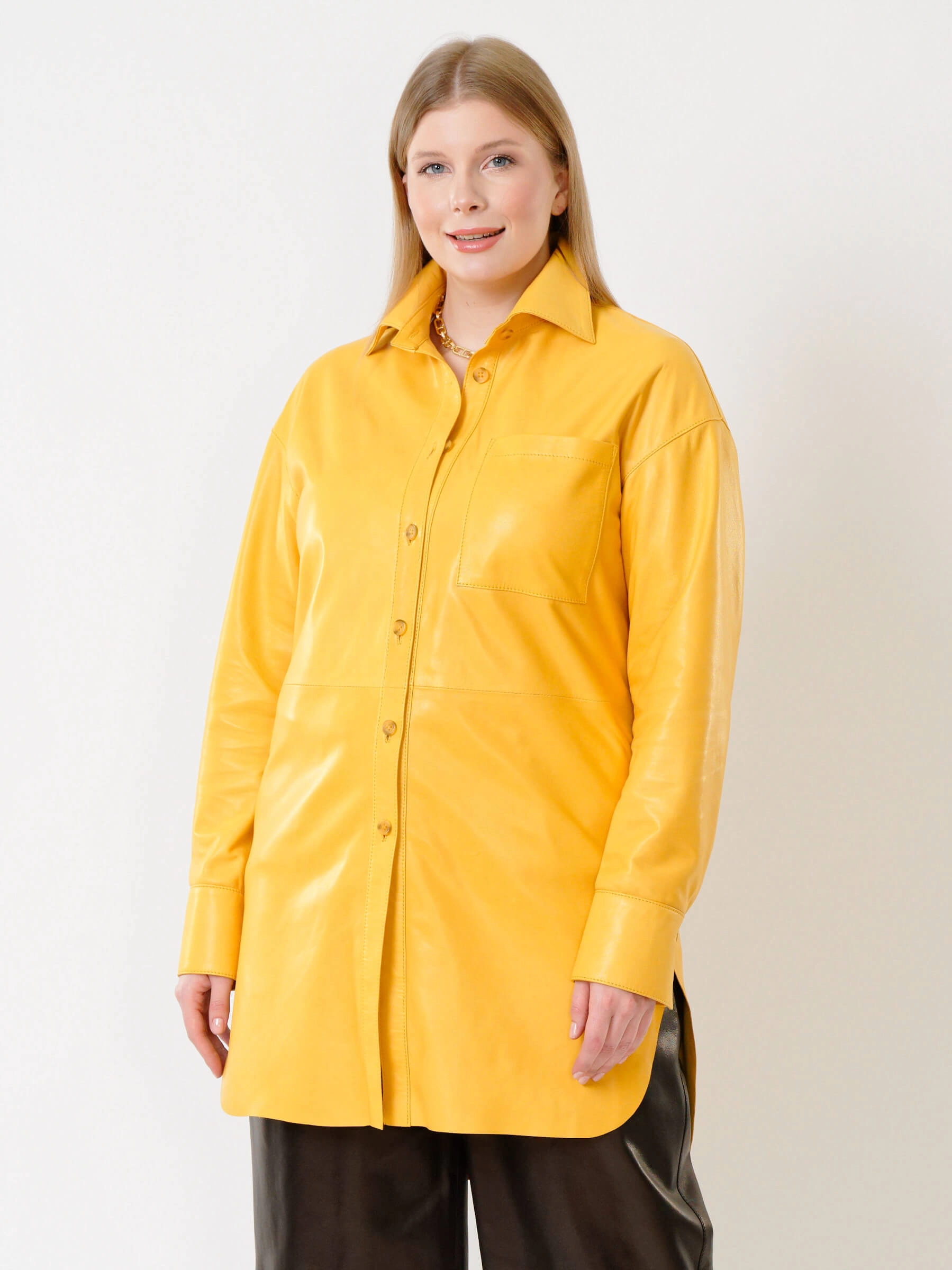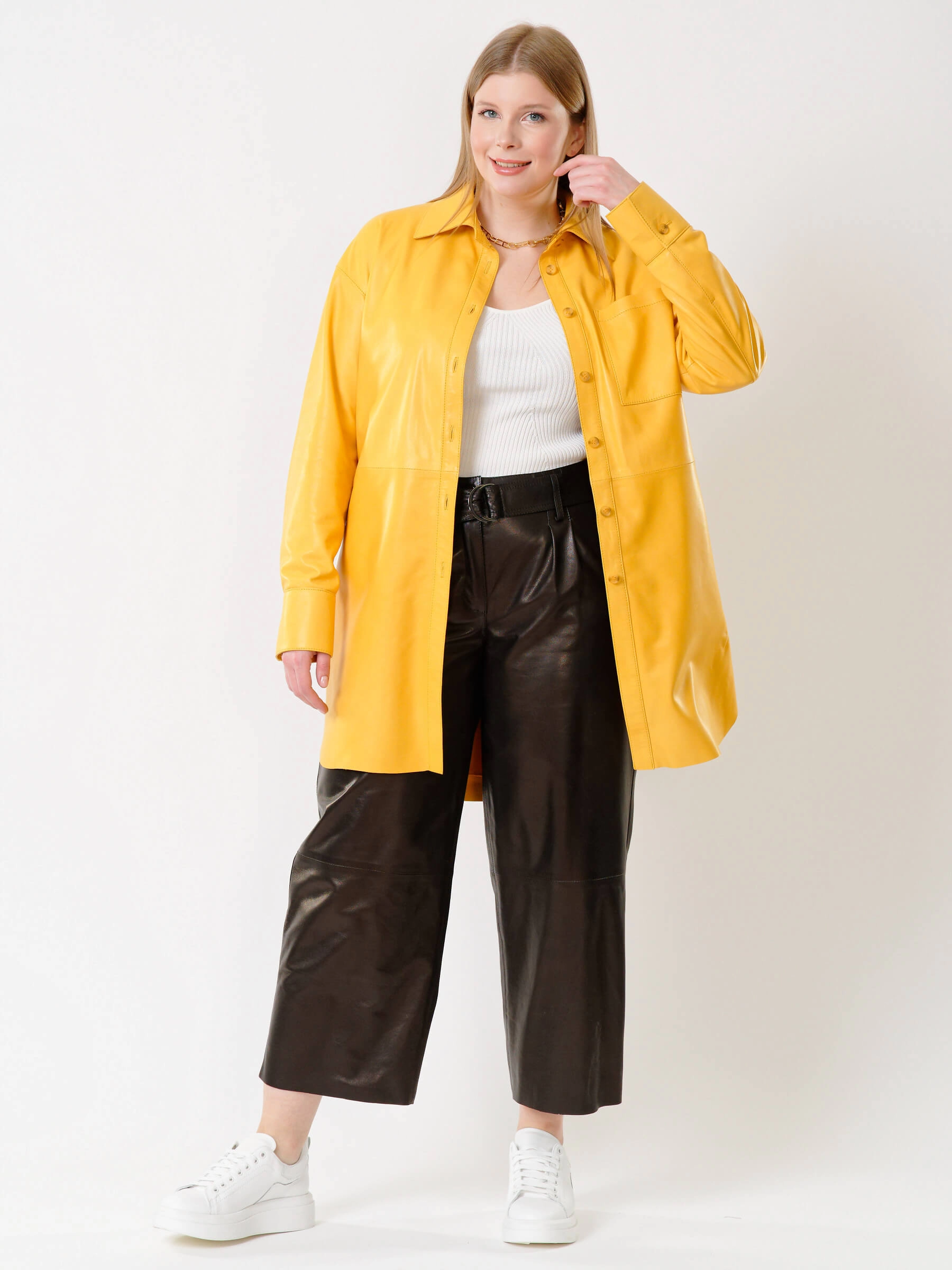 Товар кожаная женская рубашка с поясом из натуральной кожи 01_2, желтая, размер 48, артикул 91402 выполнен из натуральной кожи с застежкой пуговицы. Рассчитан на сезон: весна-лето. Длина изделия 94 см, силуэт свободный.