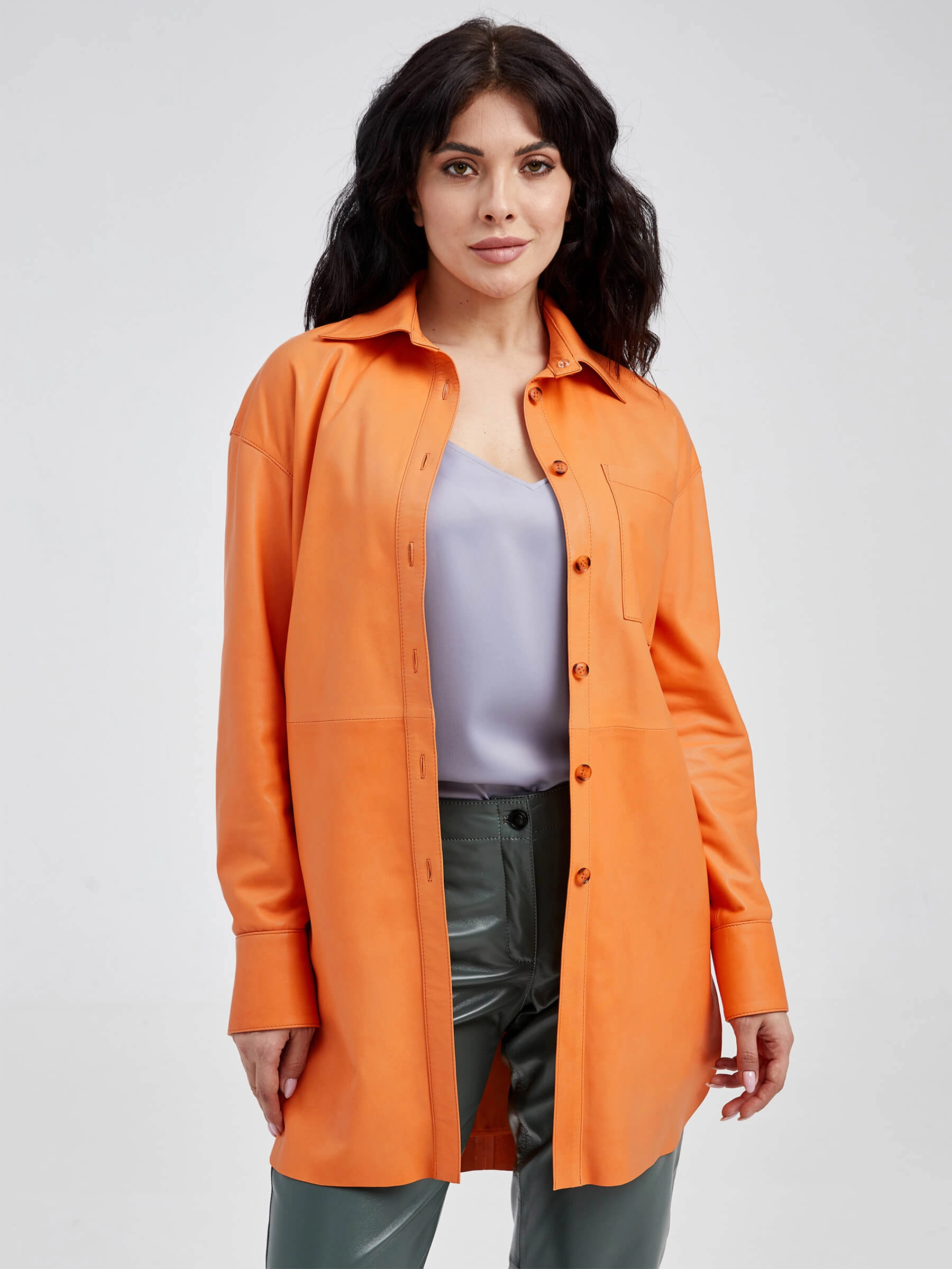 Женская рубашка из мягкой натуральной кожи в сочном оранжевом оттенке — воплощение яркого стиля и практичности. Прямой силуэт с застежкой на пуговицах оформлен элегантным отложным воротником и аккуратными манжетами, а функциональный нагрудный карман и стильные закругленные разрезы по бокам добавляют образу динамики. Широкий кожаный пояс подчеркивает талию, позволяя создавать разные образы — от дерзкого сочетания с кожаными брюками и ботильонами до непринужденного лука с джинсами и кедами. Бархатистая фактура кожи с мягким блеском эффектно играет на свету, подчеркивая насыщенный оранжевый оттенок, при этом обеспечивая комфорт при носке. Удобная посадка, продуманные детали и универсальность делают эту рубашку идеальным выбором для тех, кто любит смелые цветовые акценты и нестандартные решения в повседневном гардеробе. Яркий оранжевый тон придаст энергии вашему образу и станет стильным акцентом в любой сезон.