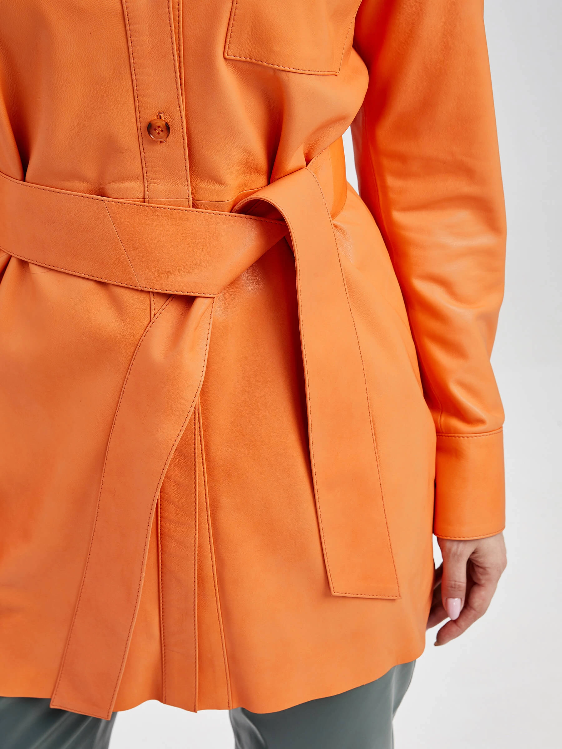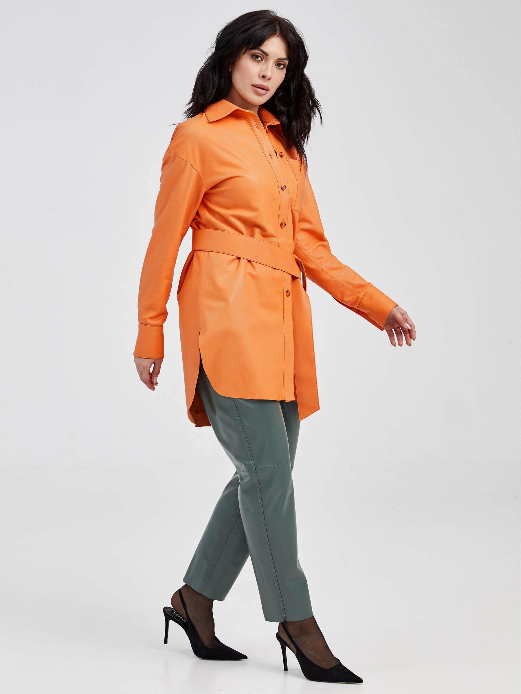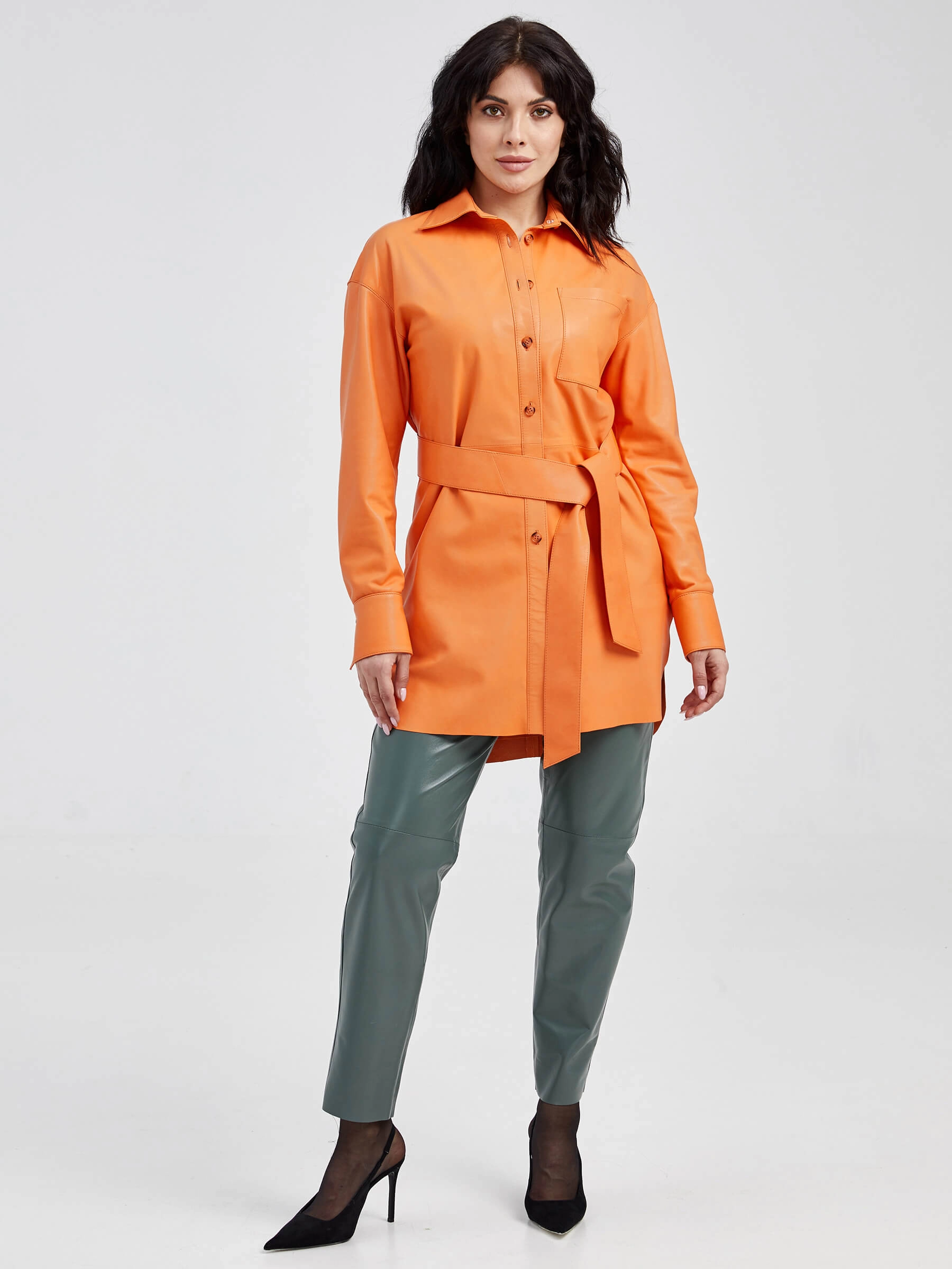 Товар женская кожаная рубашка с поясом из натуральной кожи 01_3, оранжевая, размер 46, артикул 90520 выполнен из натуральной кожи с застежкой пуговицы. Рассчитан на сезон: весна-лето. Длина изделия 94 см, силуэт свободный.