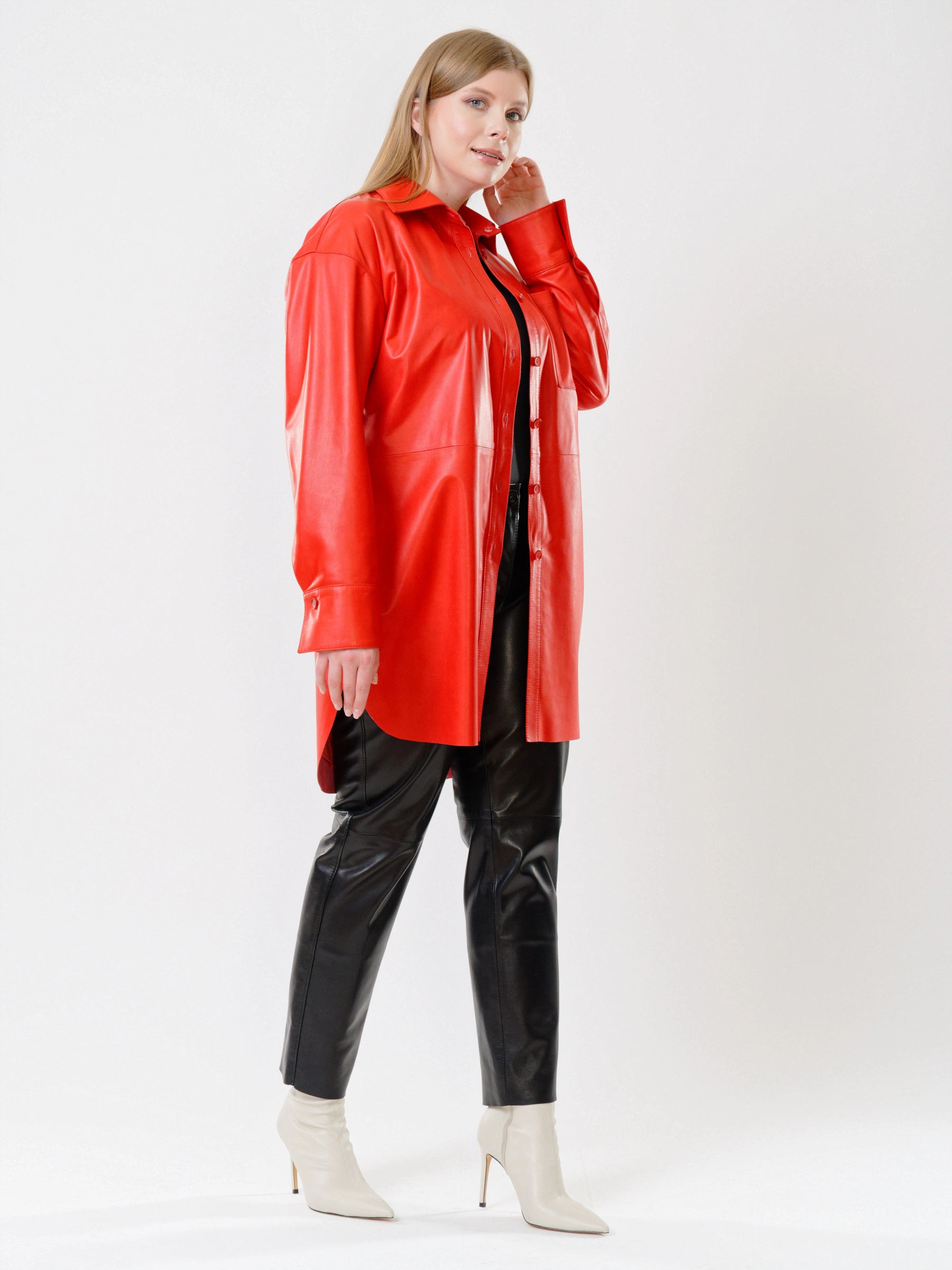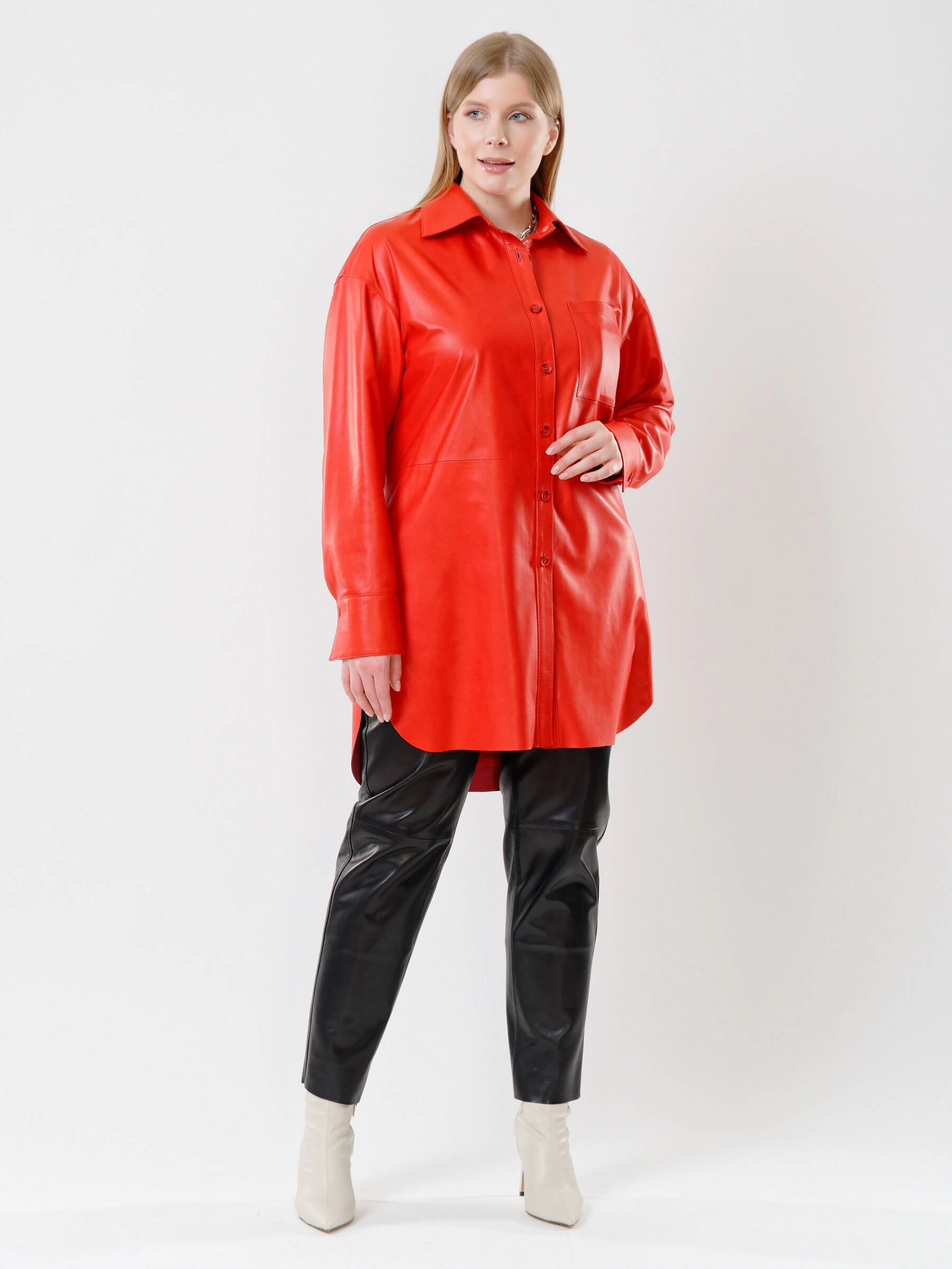 Яркая женская кожаная рубашка насыщенного цвета с прямым силуэтом станет стильным акцентом вашего образа. Модель с застежкой на пуговицах дополнена классическим отложным воротником, манжетами на рукавах и практичным нагрудным карманом. Стильные закругленные боковые разрезы и широкий кожаный пояс добавляют образу динамики и индивидуальности. Эта рубашка – универсальная основа для создания разнообразных луков: сочетайте ее с кожаными брюками и каблуками для дерзкого вечернего образа или носите навыпуск с джинсами и кроссовками для повседневного шика. Благородная фактура натуральной кожи подчеркнет вашу индивидуальность и чувство стиля в любой ситуации.