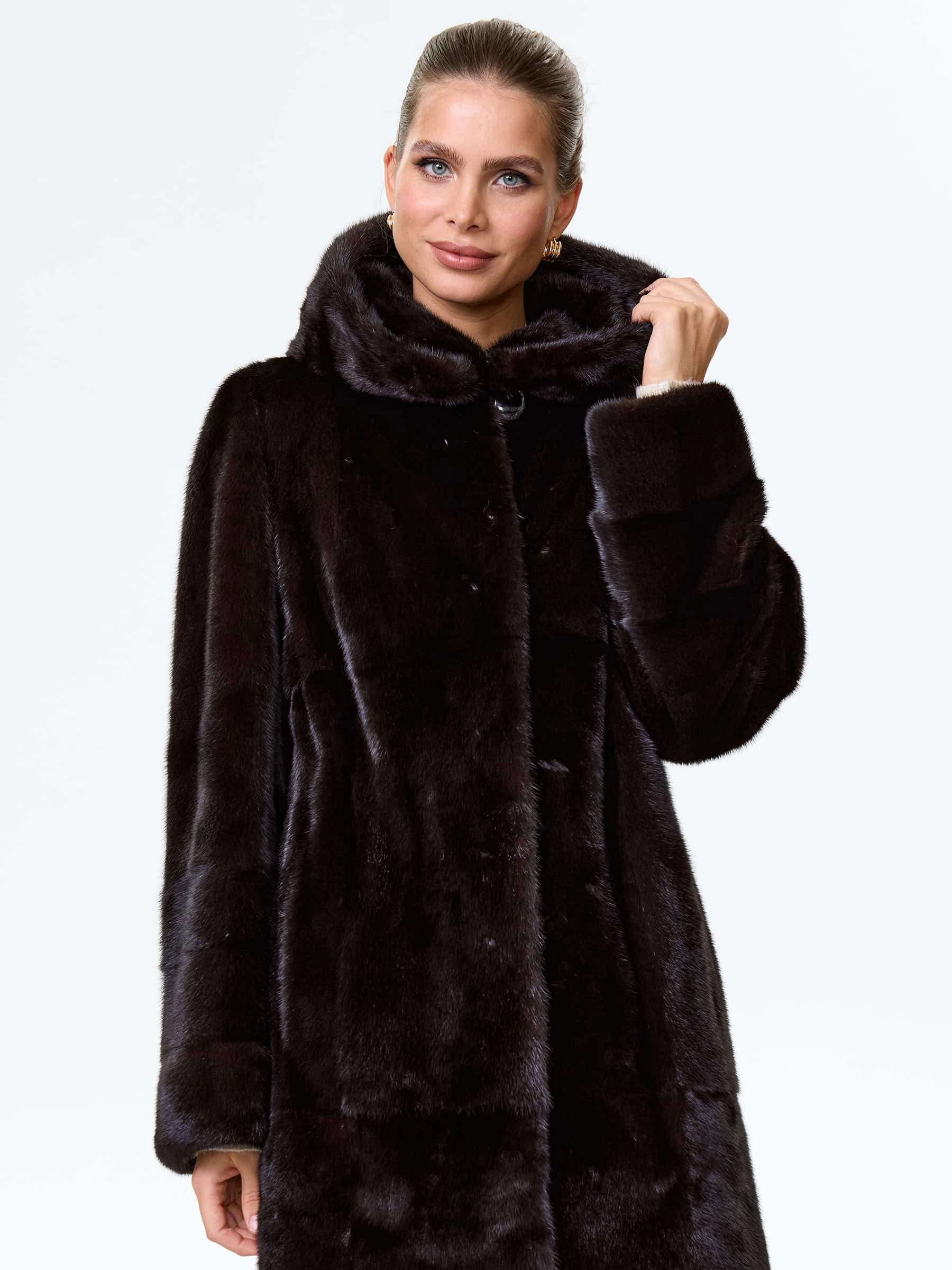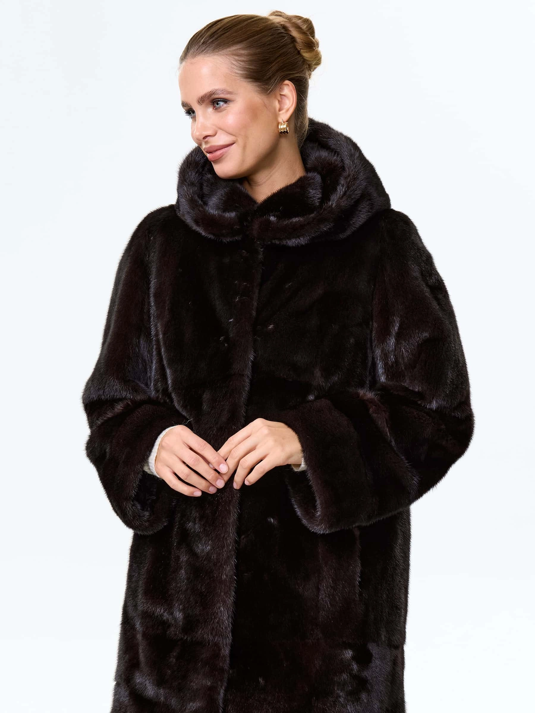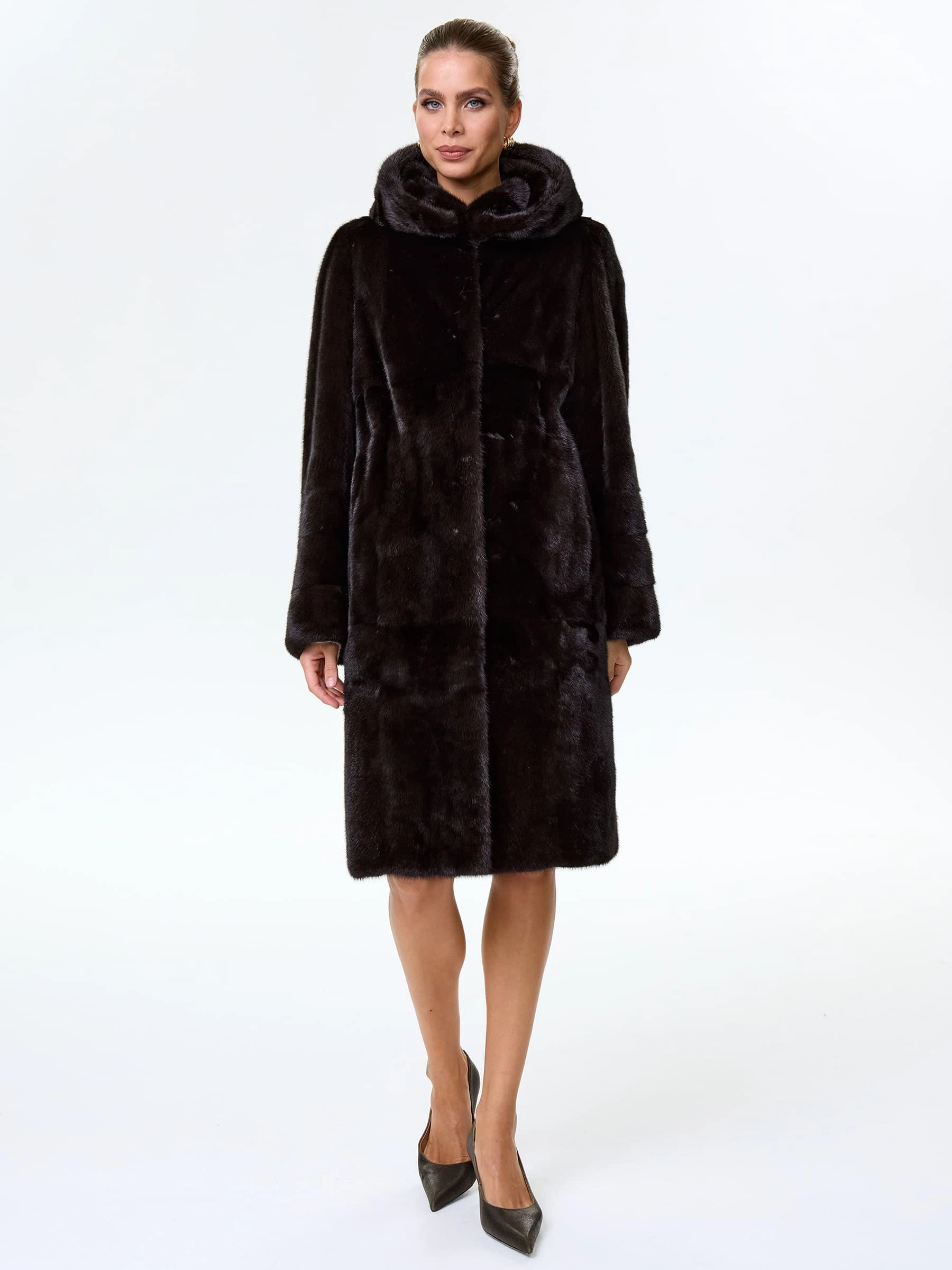 Товар шуба длинная из меха норки женская надежда(к), черная, размер 48, артикул 64530 выполнен из норка с застежкой клипсы. Рассчитан на сезон: зима. Длина изделия 102 см, силуэт прямой.
