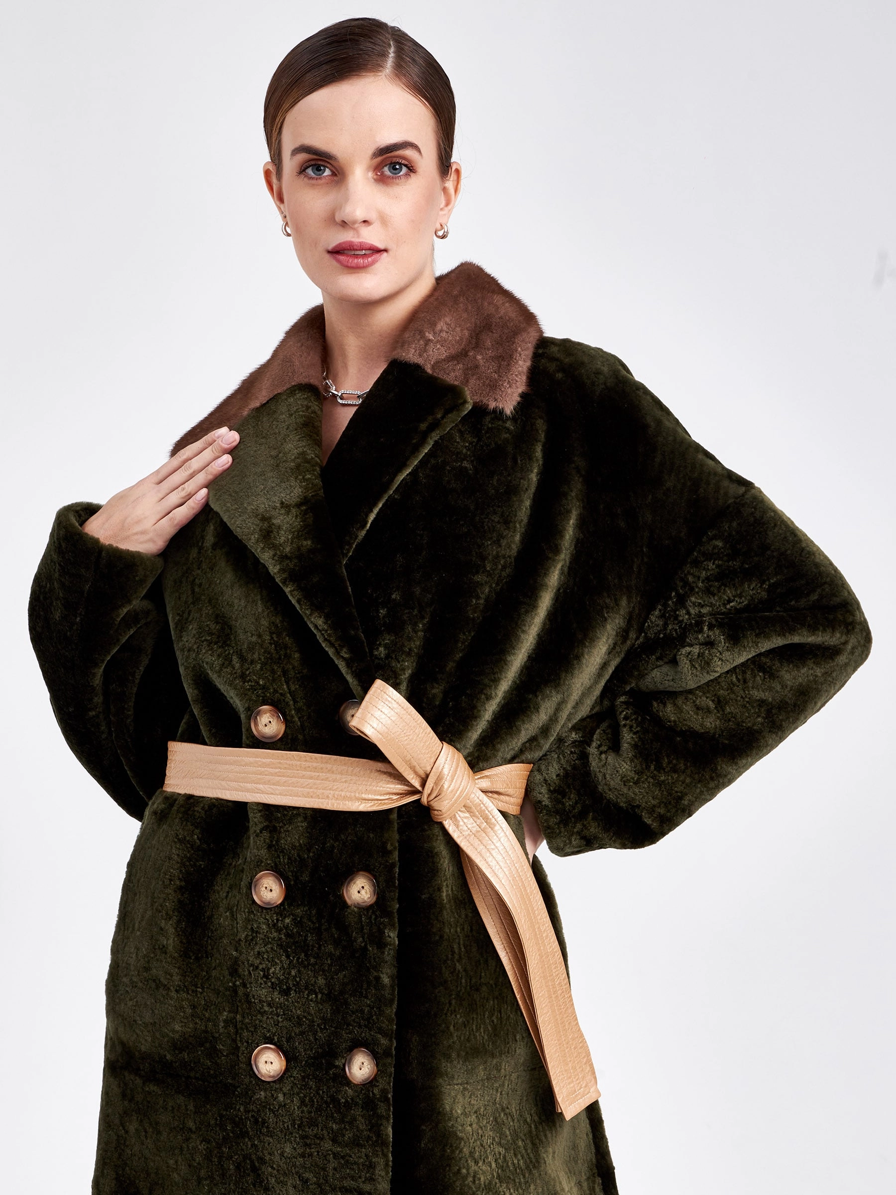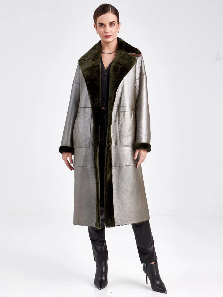 Двубортную модель с широкими лацканами прямого кроя выполнили из мягкой плотной овчины с гладкой фактурой в серебристом цвете с одной стороны и густым мехом хаки — с другой. За счет материала и особенных швов изделие можно легко трансформировать в шубу. Застежка-пуговицы. Воротник- норка.Контрастный бежевый пояс из натуральной кожи послужил дополнением к изделию.