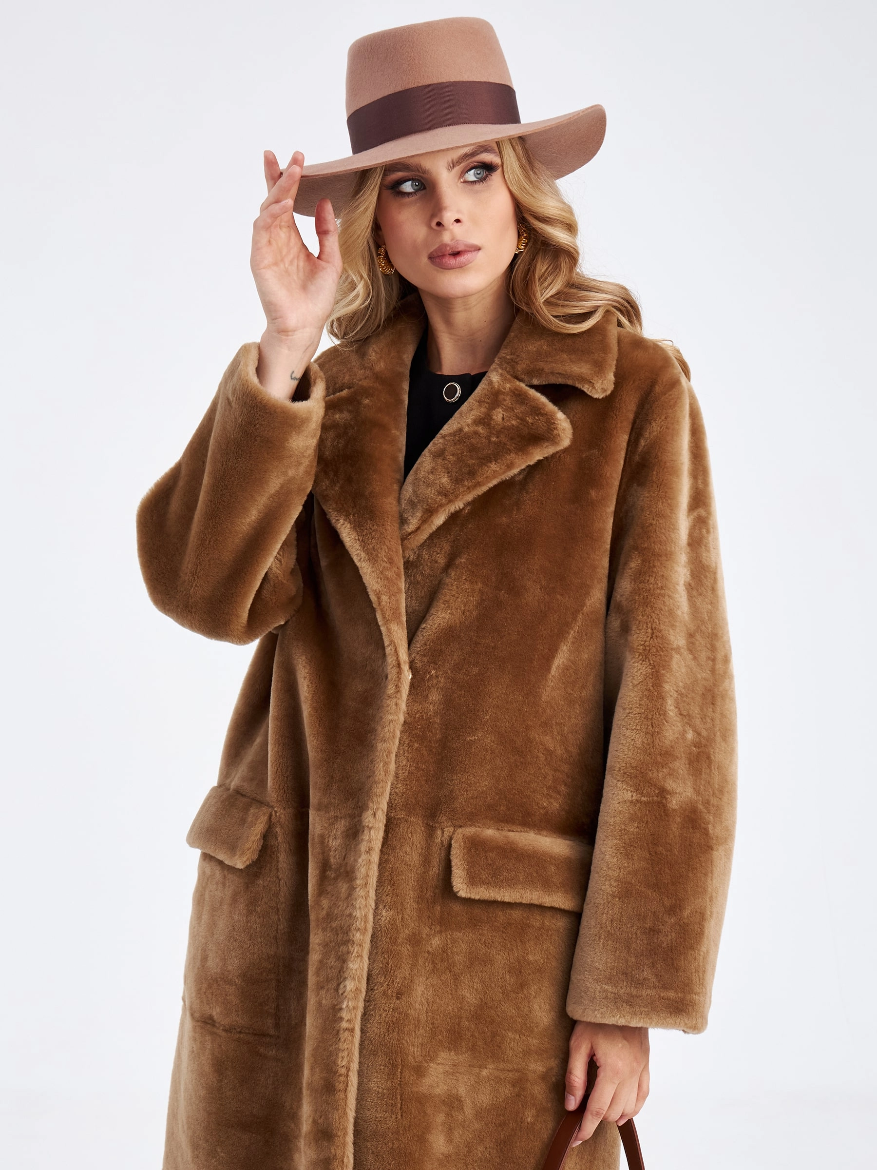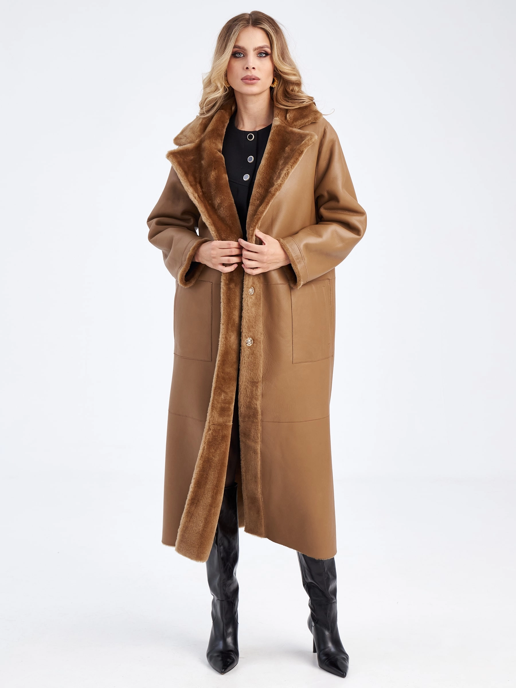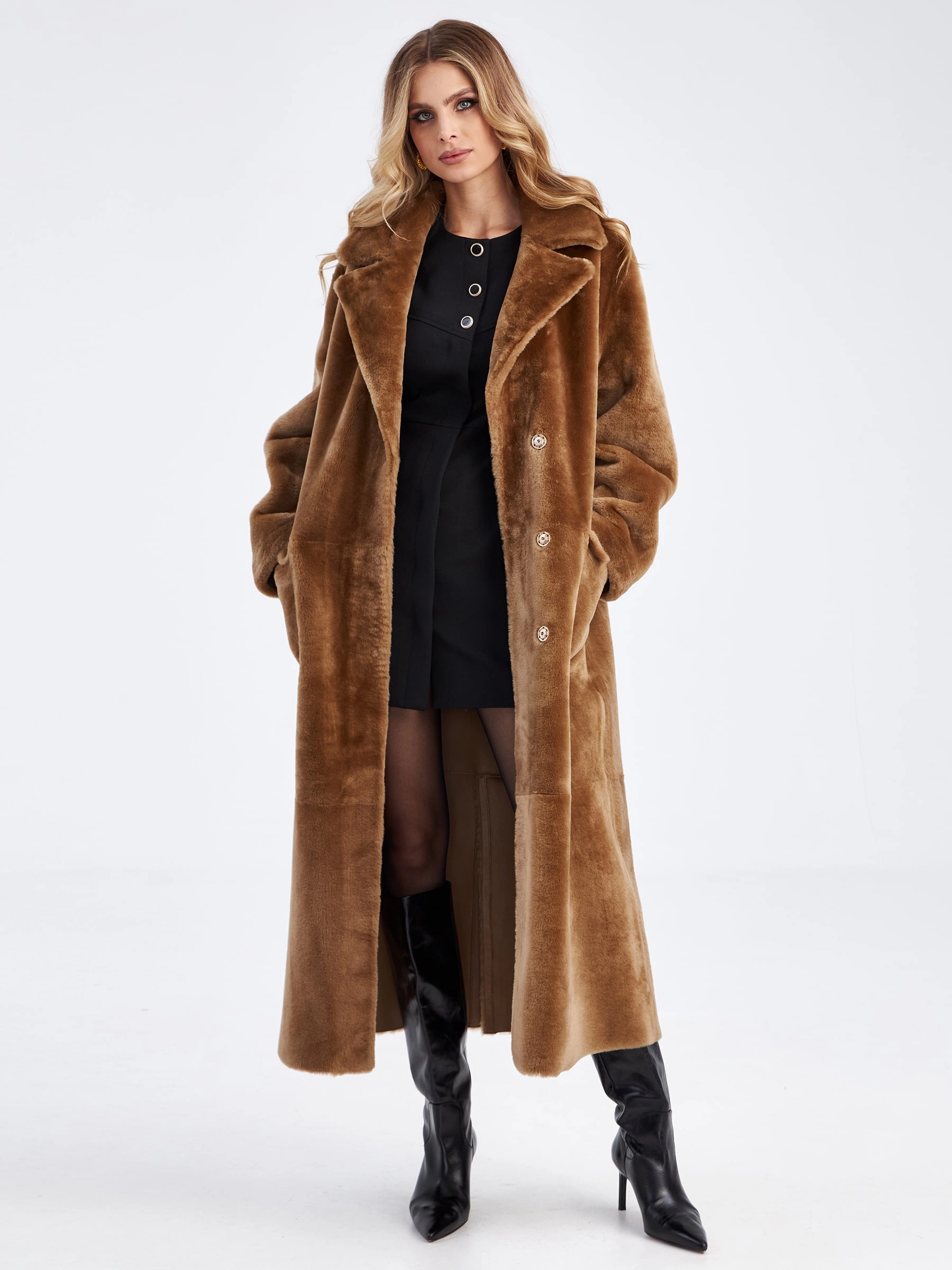 Товар женская двусторонняя шуба из меховой овчины премиум класса 2030, коричневая, размер 44, артикул 13720 выполнен из овчина "мерино" с застежкой кнопки. Рассчитан на сезон: осень-зима. Длина изделия 125 см, силуэт прямой.