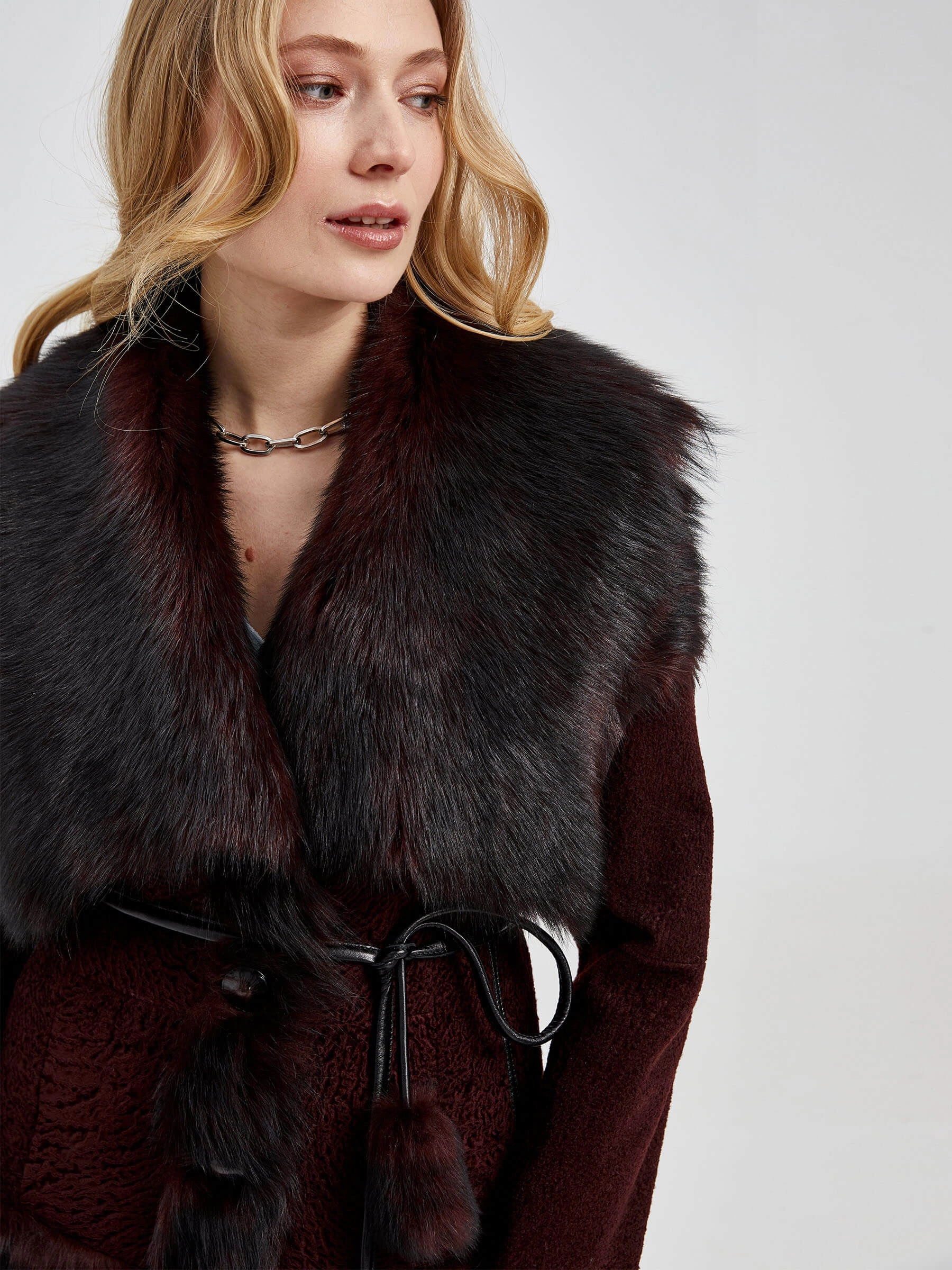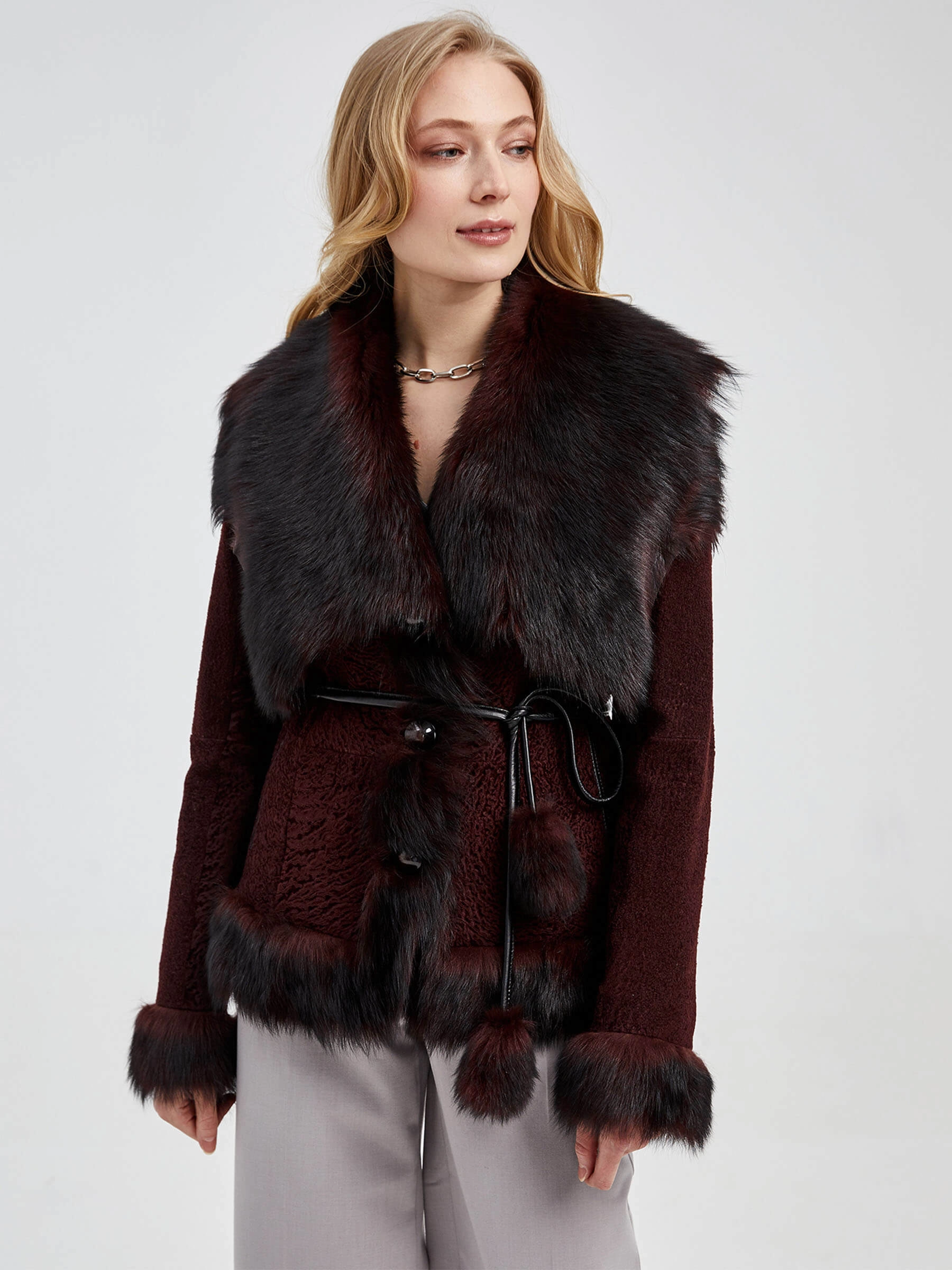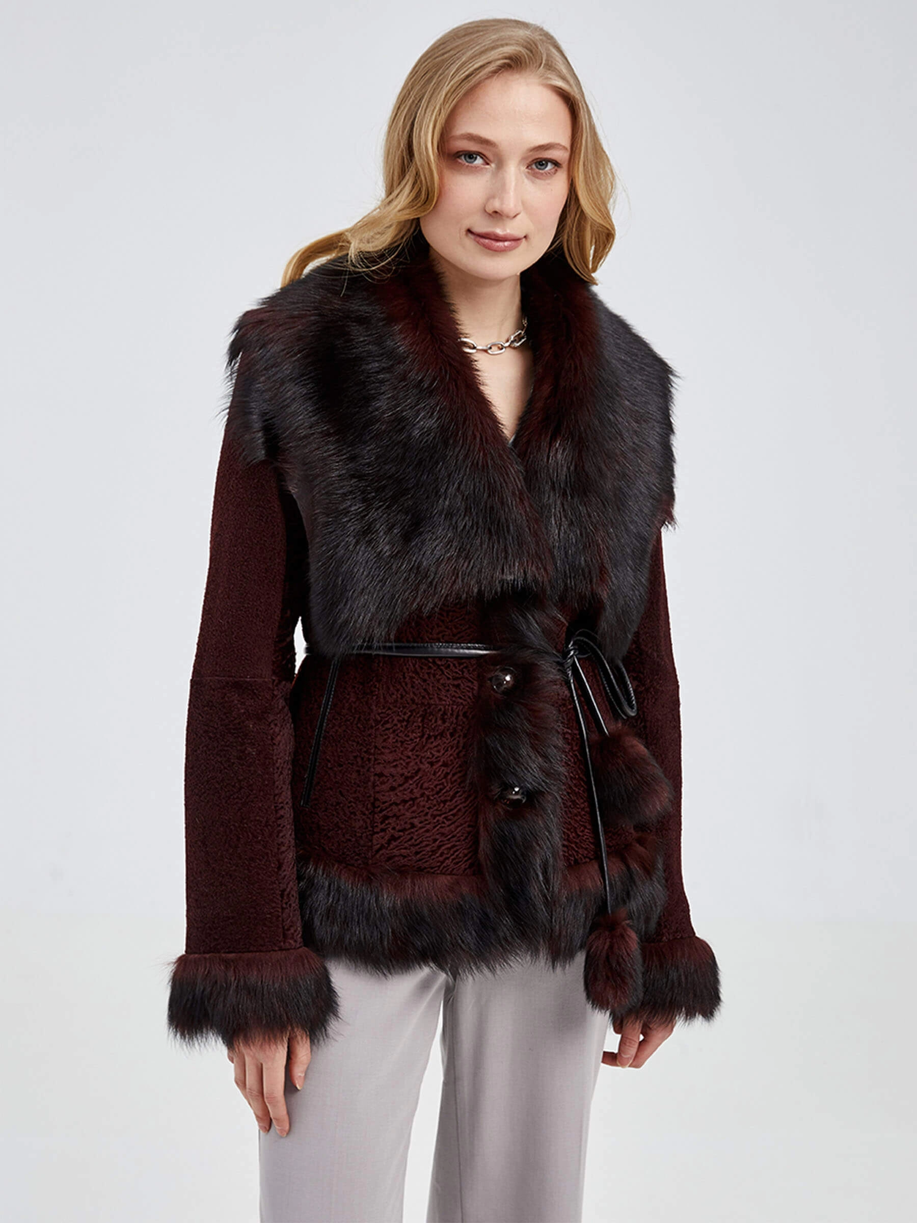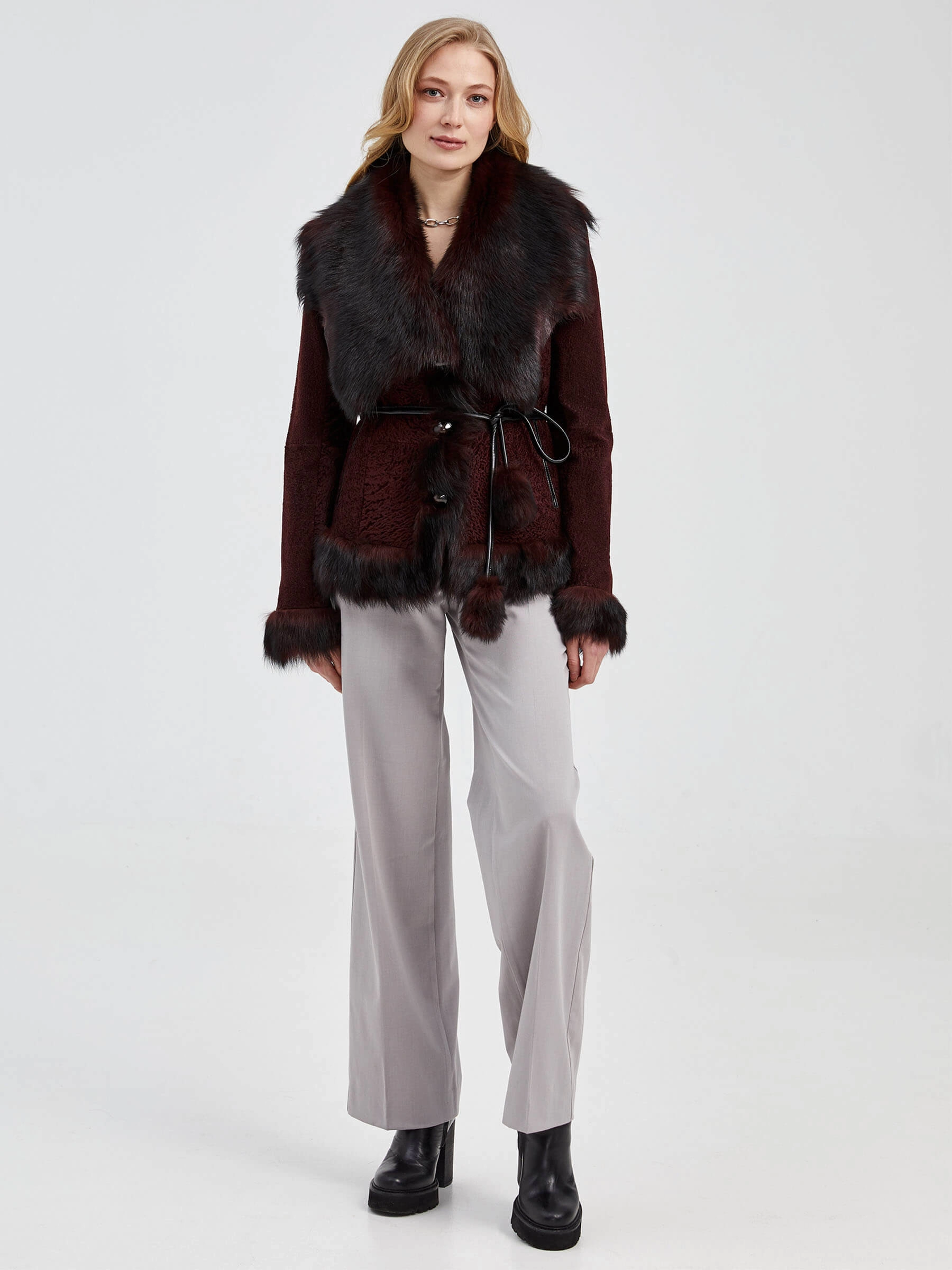Эффектная шуба из меха астраган. Нежнейший мех, близкий по восприятию к каракульче. Приталенный силуэт, отделка воротника и манжет-тосканская овчина. Модель дополнена узким кожаным поясом акцентрирующий внимание на талии.