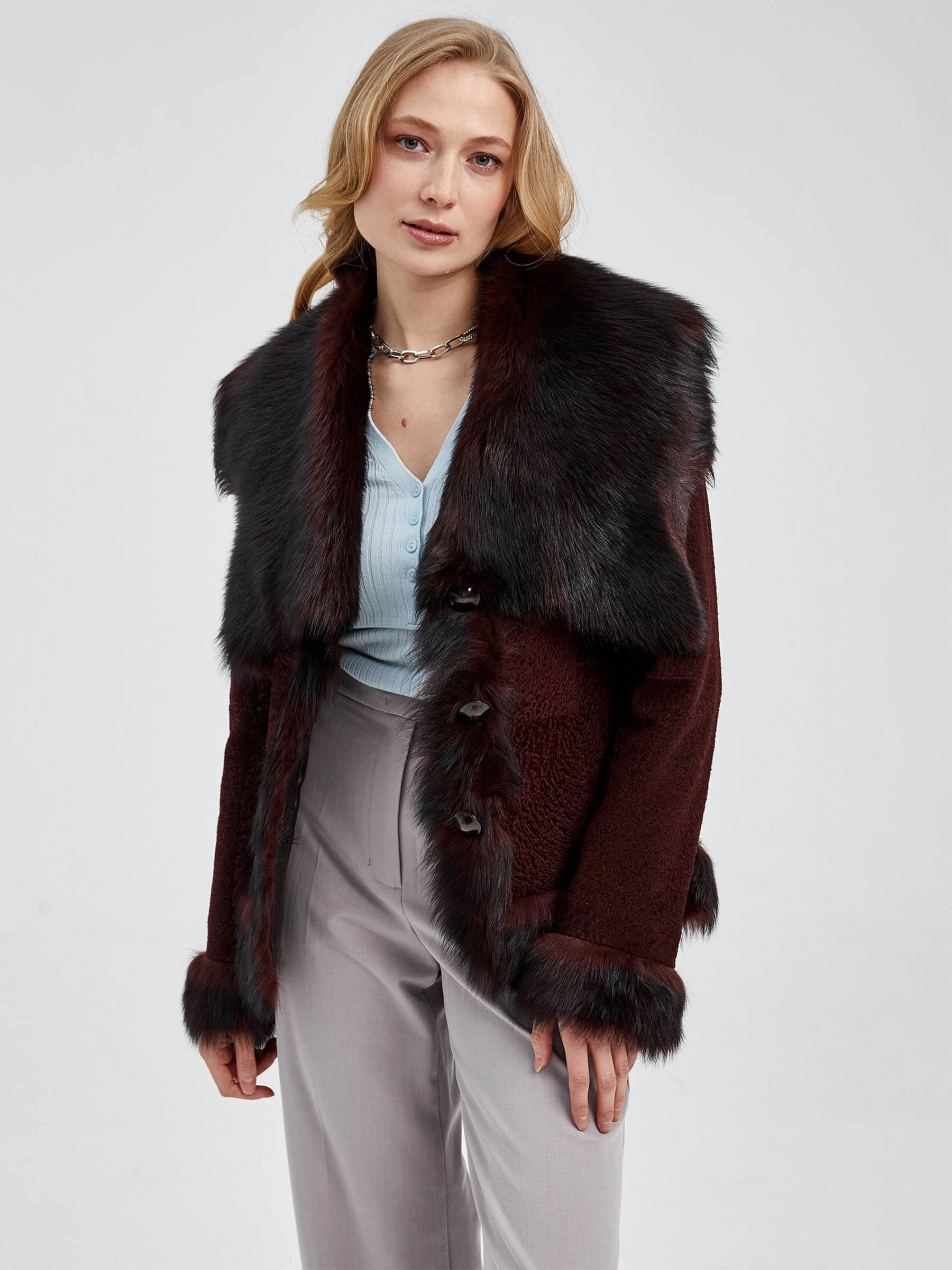 Товар короткая женская шуба из астрагана с отделкой из меха тосканы 10мех, коричневая, размер 42, артикул 13690 выполнен из астраган с застежкой пуговицы. Рассчитан на сезон: осень-зима. Длина изделия 65 см, силуэт приталенный .