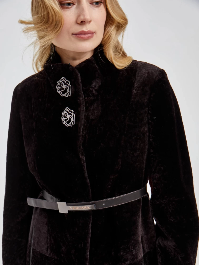 Очень лаконичное легкое пальто - сшито из нежнейшего меха новозеландского ягненка. Ничего лишнего, приталенный силуэт дополнен узким ремнем из натуральной кожи. Невысокий воротник-стойка украшен декором, полноценная длина рукава с регулирующим манжетом. Идеальная посадка по фигуре. Такое изделие станет удачным выбором в холодную погоду.