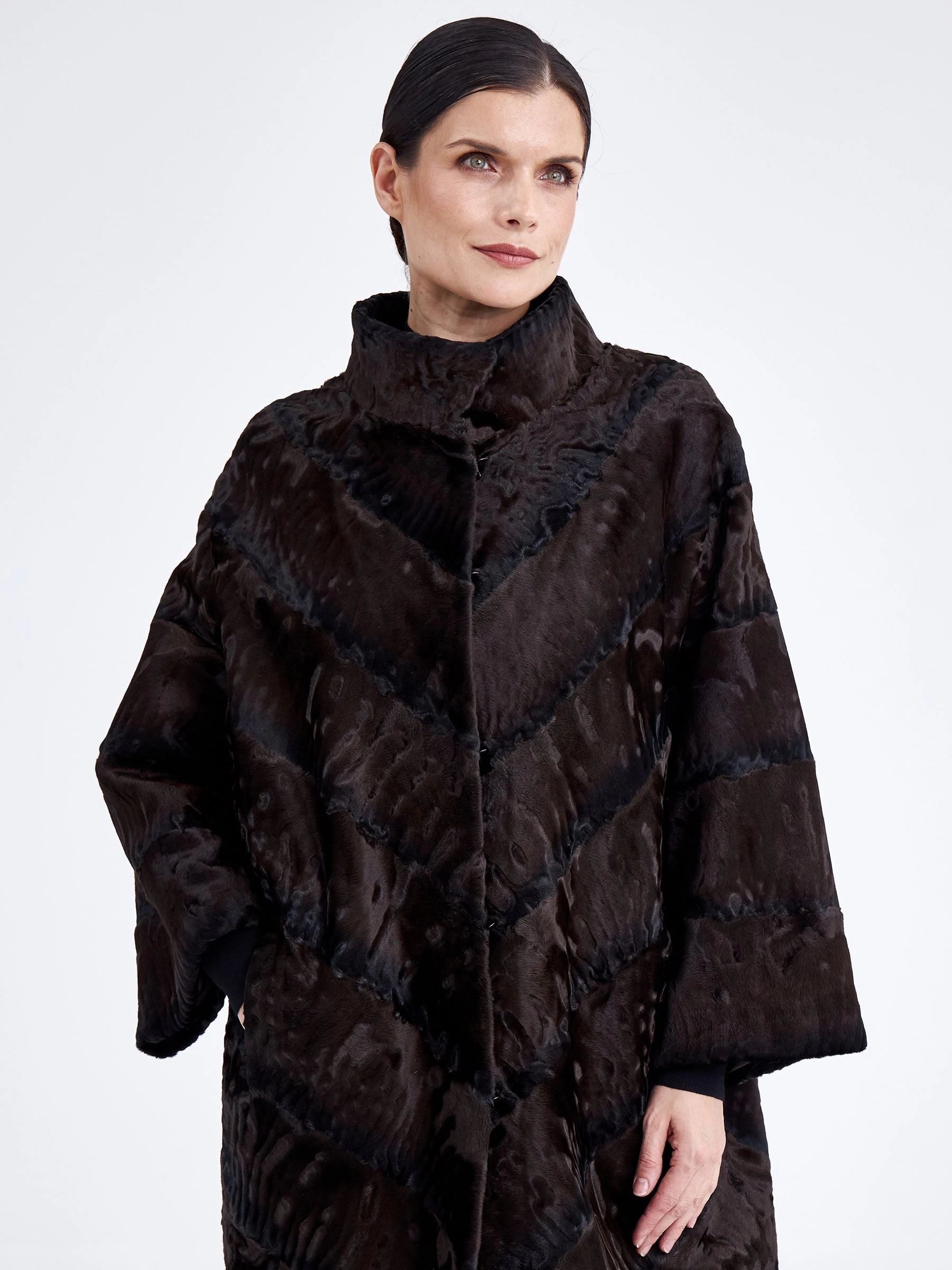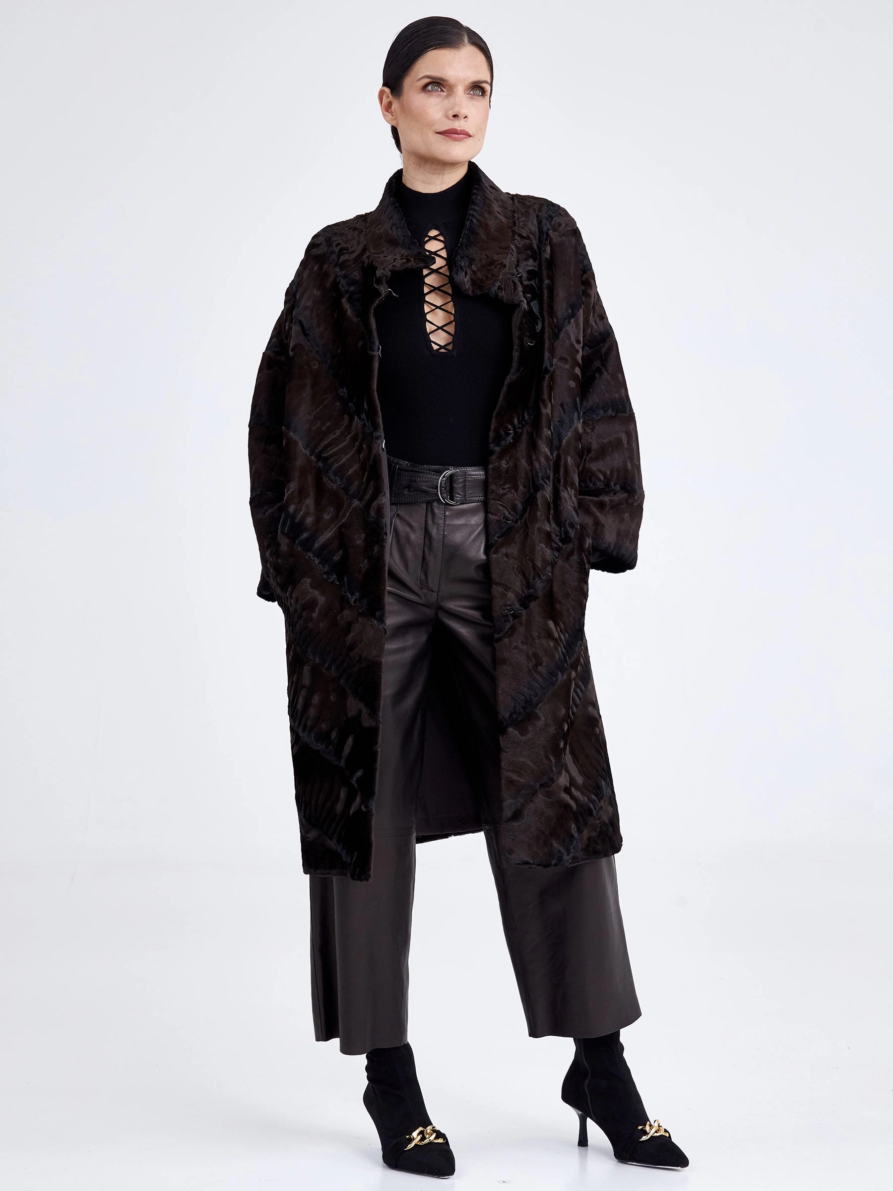 Эффектное пальто из нежного меха каракуля в благородном коричневом оттенке удачно сочетает в себе практичность, комфорт и элегантность. Изделие напоминает прекрасный узор из множества завитков, переливающихся на солнце. Прямой крой, невысокая стойка, отсутствие лишнего декора и длина свыше 90 см подчёркивают чистоту линий и премиальный статус модели. Совет стилиста: тёплый коричневый цвет каракуля идеально сочетается с базовыми нейтральными оттенками — носите шубу с однотонными комплектами в бежевой, кремовой или шоколадной гамме, дополнив образ высокими сапогами и минималистичной сумкой, чтобы подчеркнуть природную красоту и графичность завитков меха.