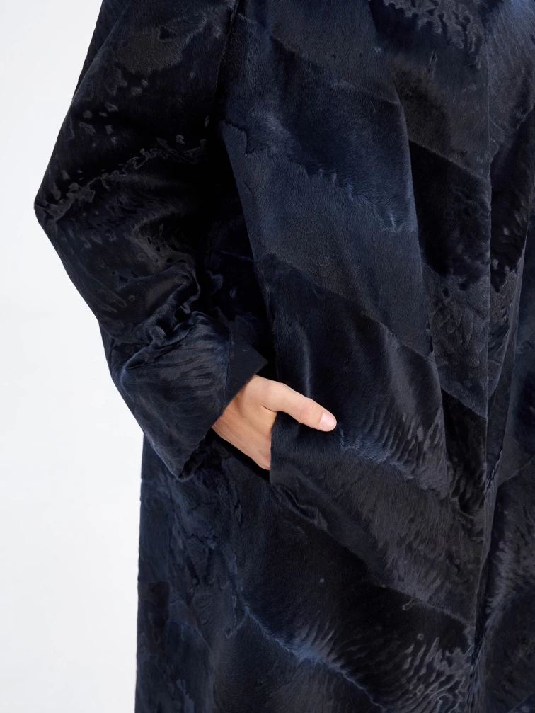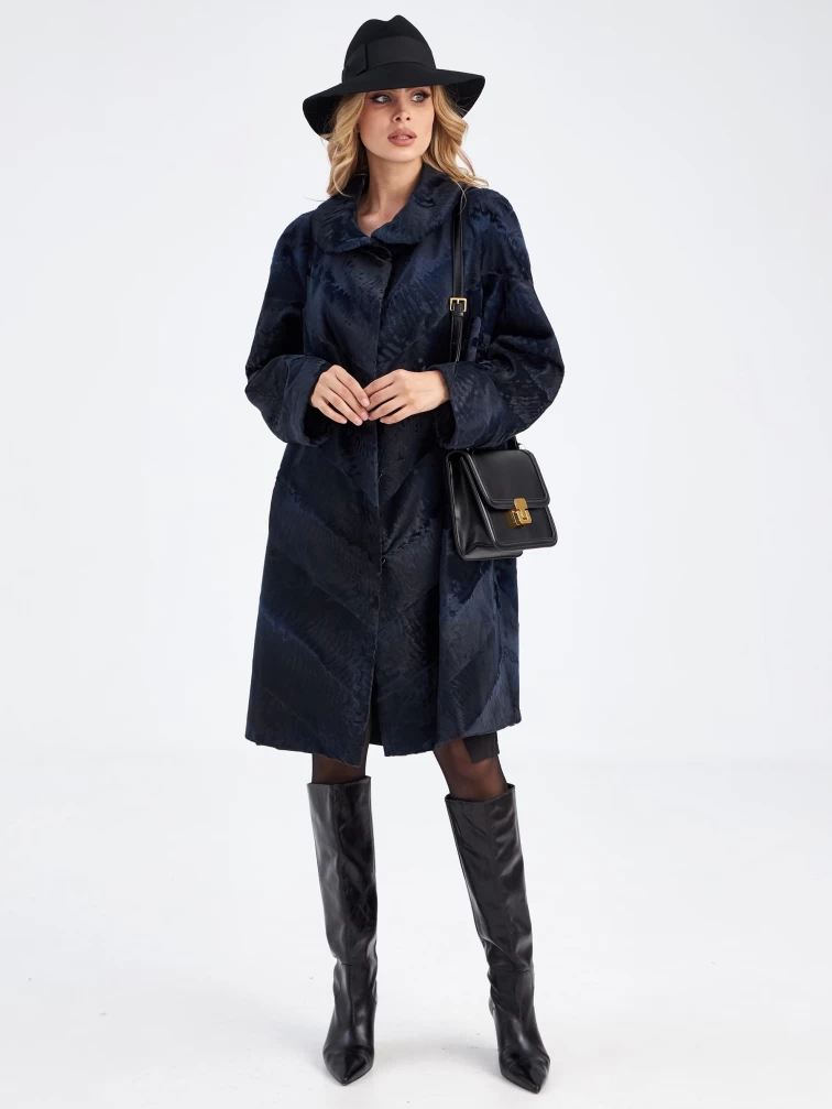 Товар шуба из меха каракуля женская елизавета-д(в), синяя, размер 56, артикул 33770 выполнен из каракульча с застежкой клипсы. Рассчитан на сезон: осень-зима. Длина изделия 117 см, силуэт расклешенный.