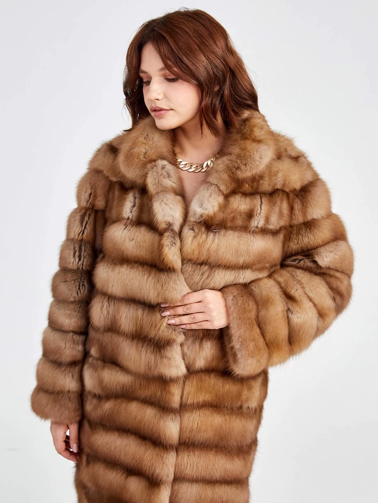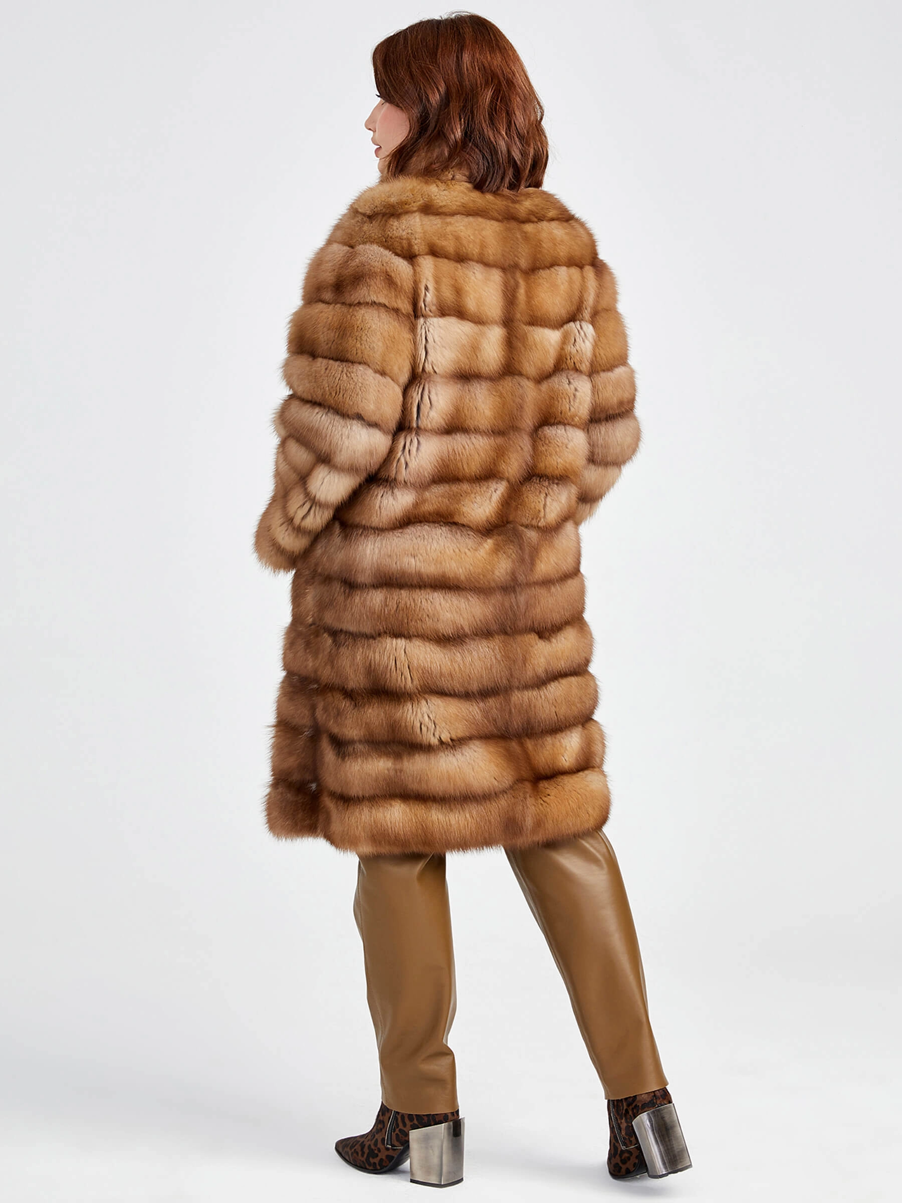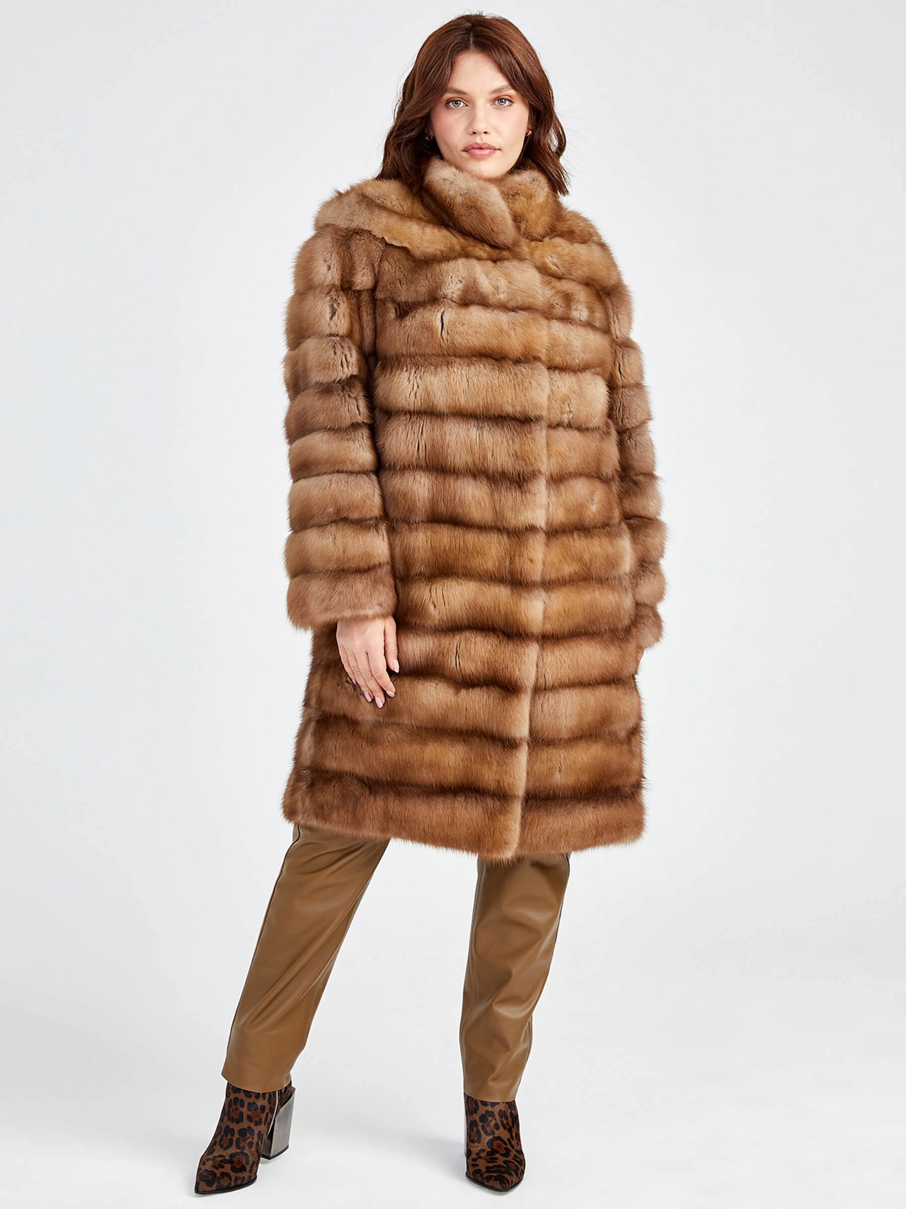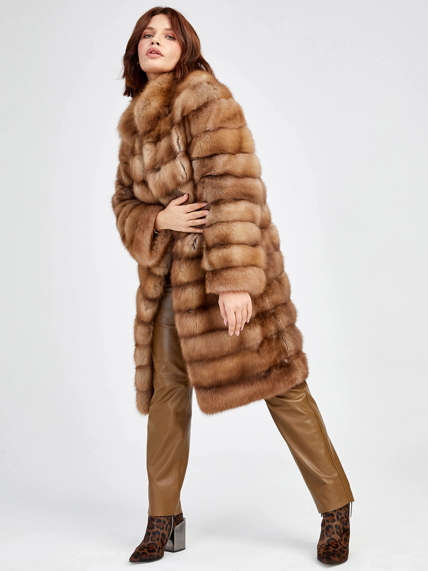Эффектное пальто из меха куницы. Воротник – стойка. Горизонтальная раскладка меха. Способность сохранять тепло за счет очень плотного густого подшерстка, мягкого и шелковистого на ощупь. Пальто невероятно легкое и комфортное! Безупречный подбор меха. Ювелирная работа наших портных. Премиальное качество.