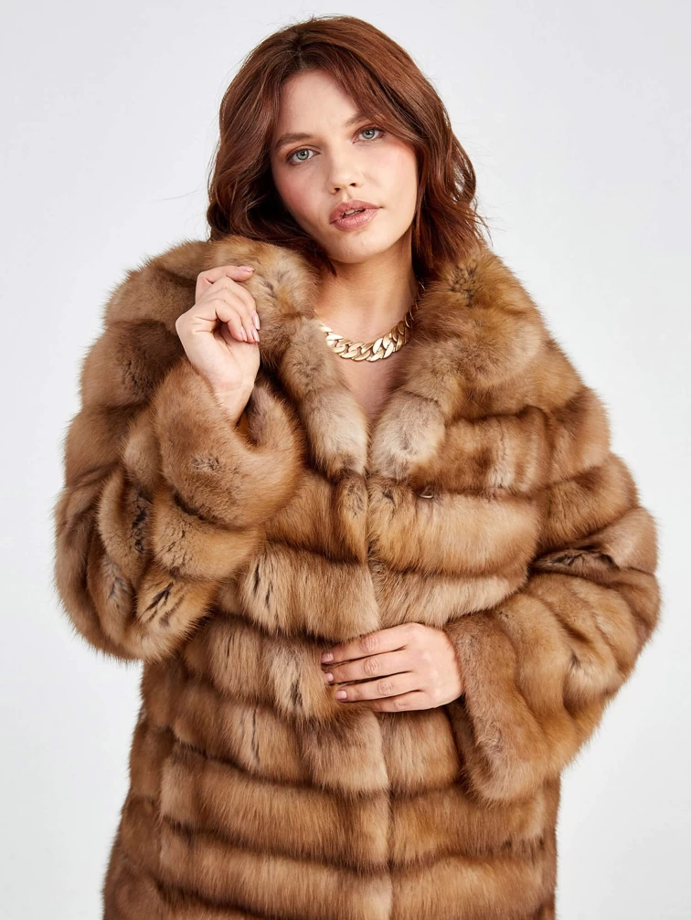 Шуба из меха куницы женская Лола -1, светло-коричневая, размер 44, артикул 19120