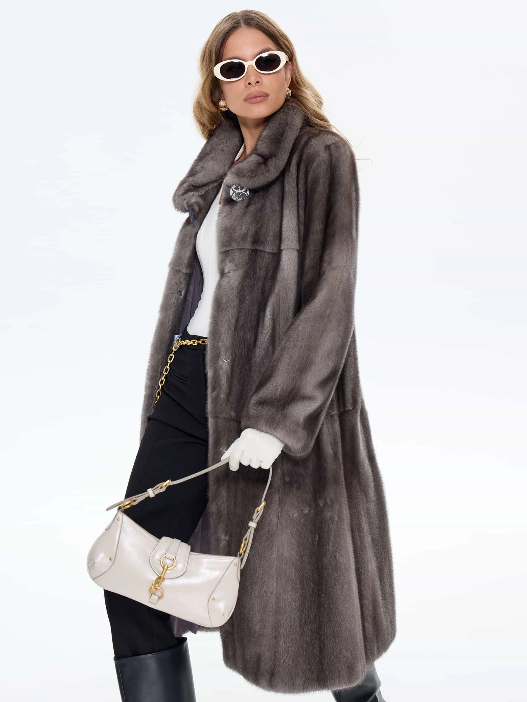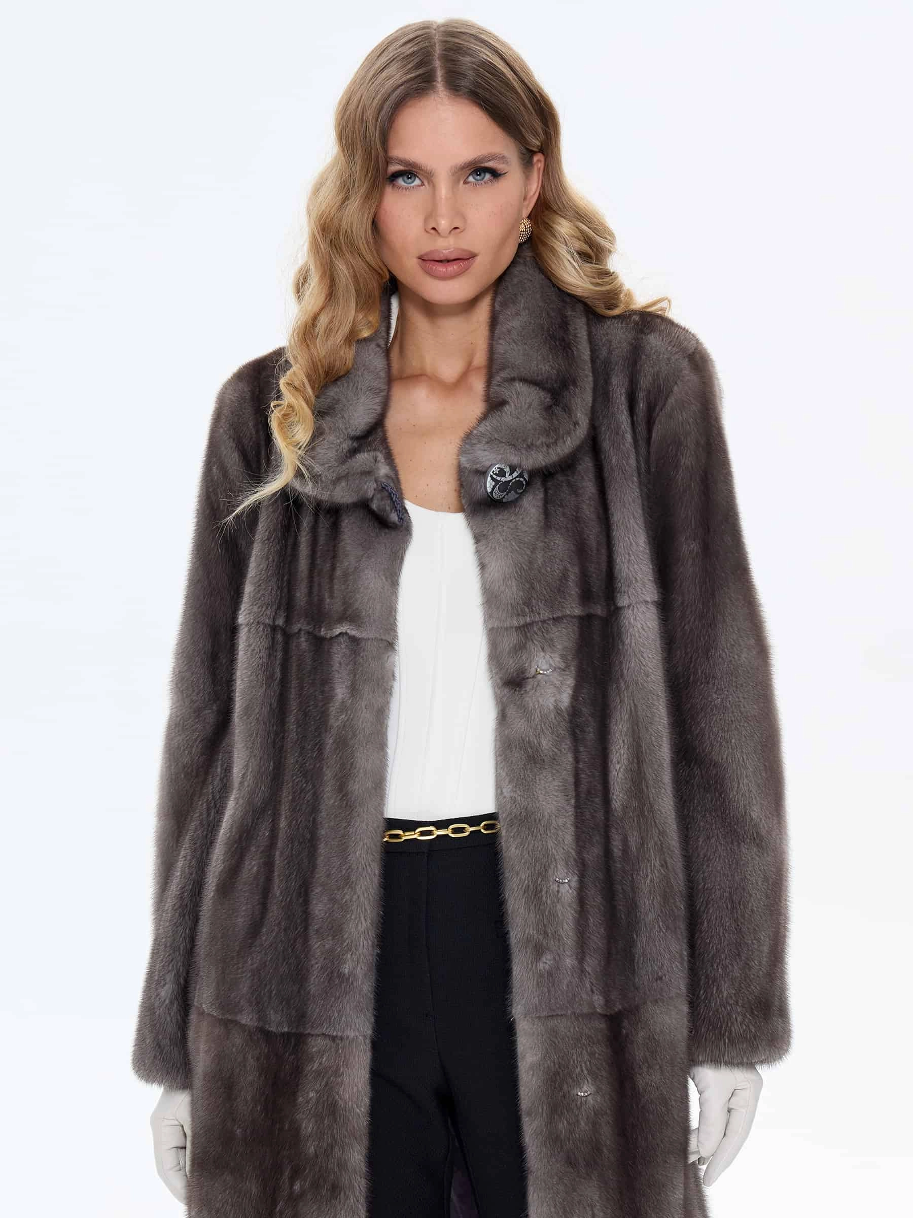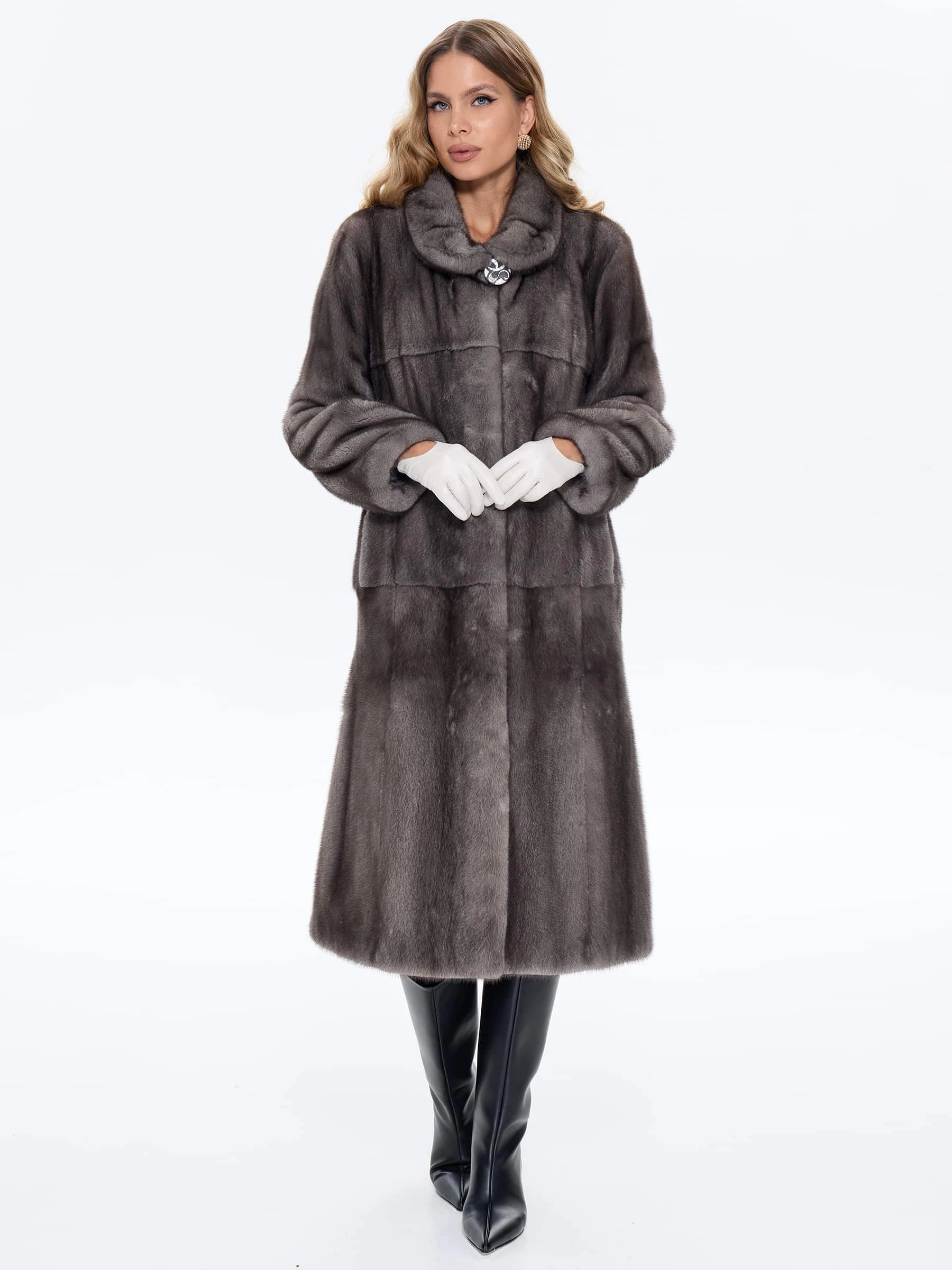 Для пошива длинной классической шубы мастера использовали нежный густой мех норки в темно-сером цвете, меняющем насыщенность при разном освещении. Полуприлегающий крой мягко подчеркивает талию, сохраняя свободу движений. Длина до щиколотки обеспечивает максимальную защиту от мороза. Лаконичный воротник-стойка надежно защищает шею от ветра. Изделие дополнено двумя удобными боковыми карманами. Застёжка на скрытых клипсах завершает образ. Модель сочетает вневременную роскошь с повседневным комфортом