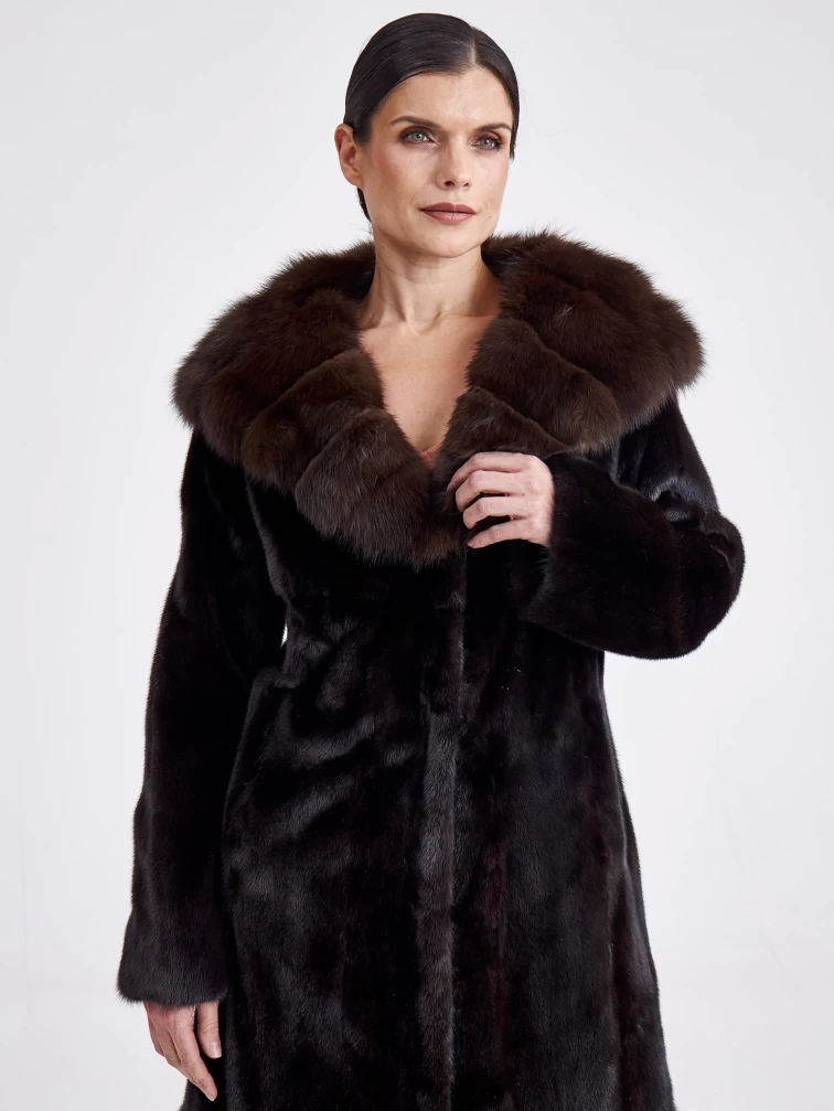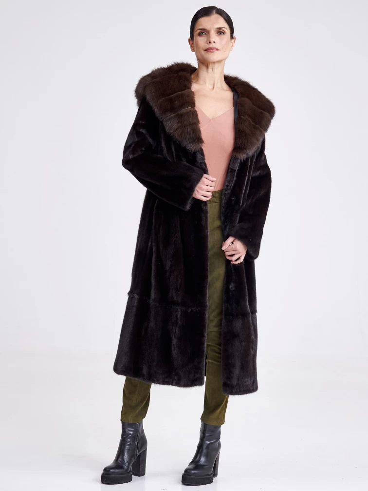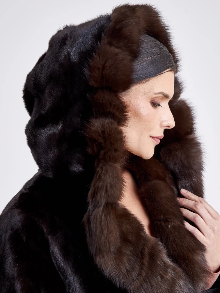 Товар шуба из меха норки с капюшоном женская 17231(кс), длинная, с отделкой капюшона из меха соболя, черная, размер 44, артикул 33280 выполнен из норка крашенной с застежкой клипсы. Рассчитан на сезон: зима. Длина изделия свыше 90 см, силуэт полуприлегающий.