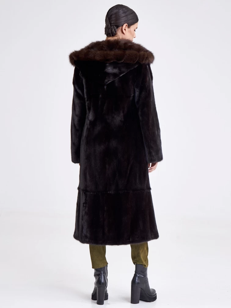 Шуба из меха норки с капюшоном женская 17231(кс), длинная, с отделкой капюшона из меха соболя, черная, размер 44, артикул 33280