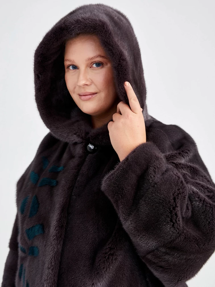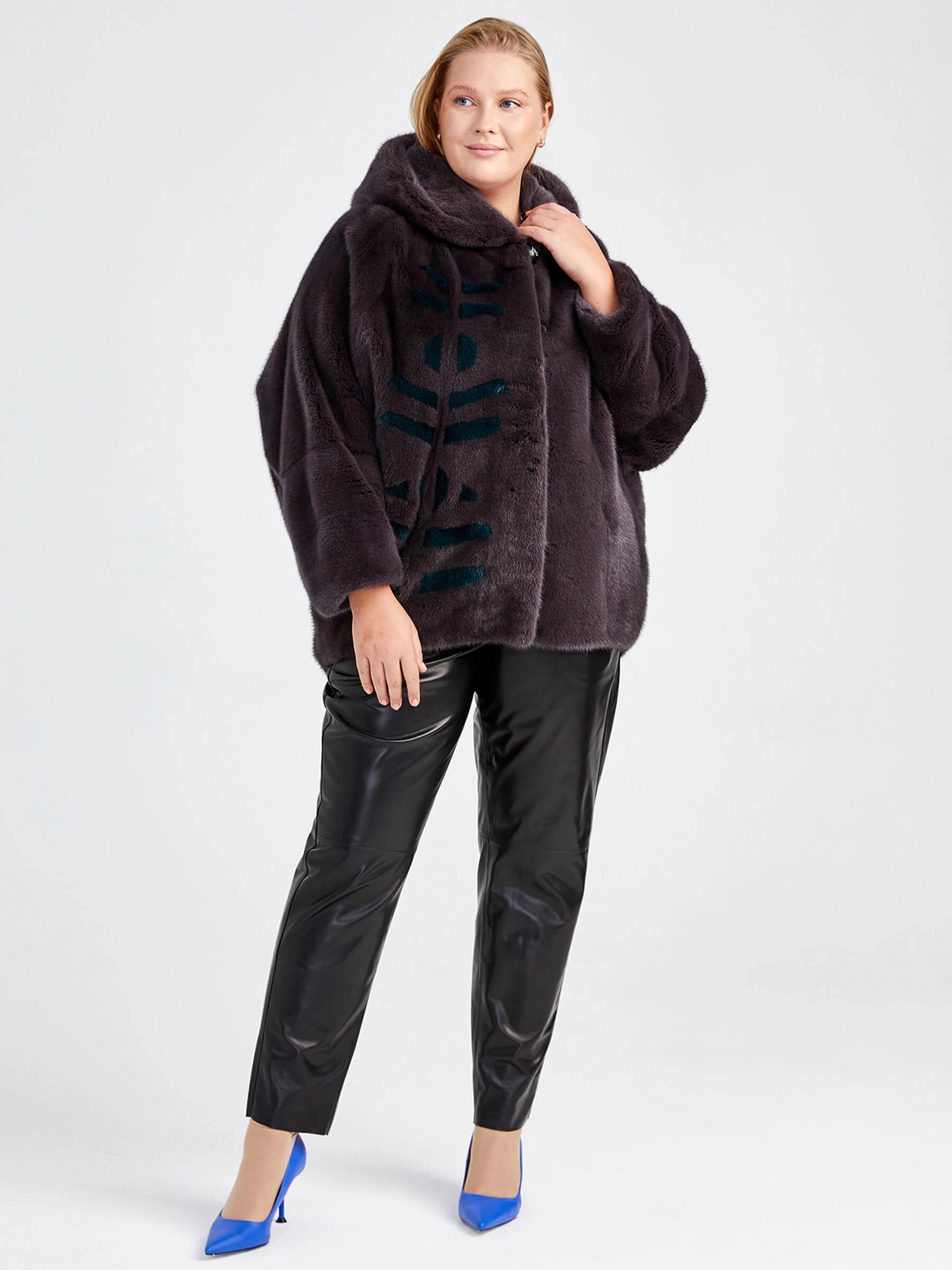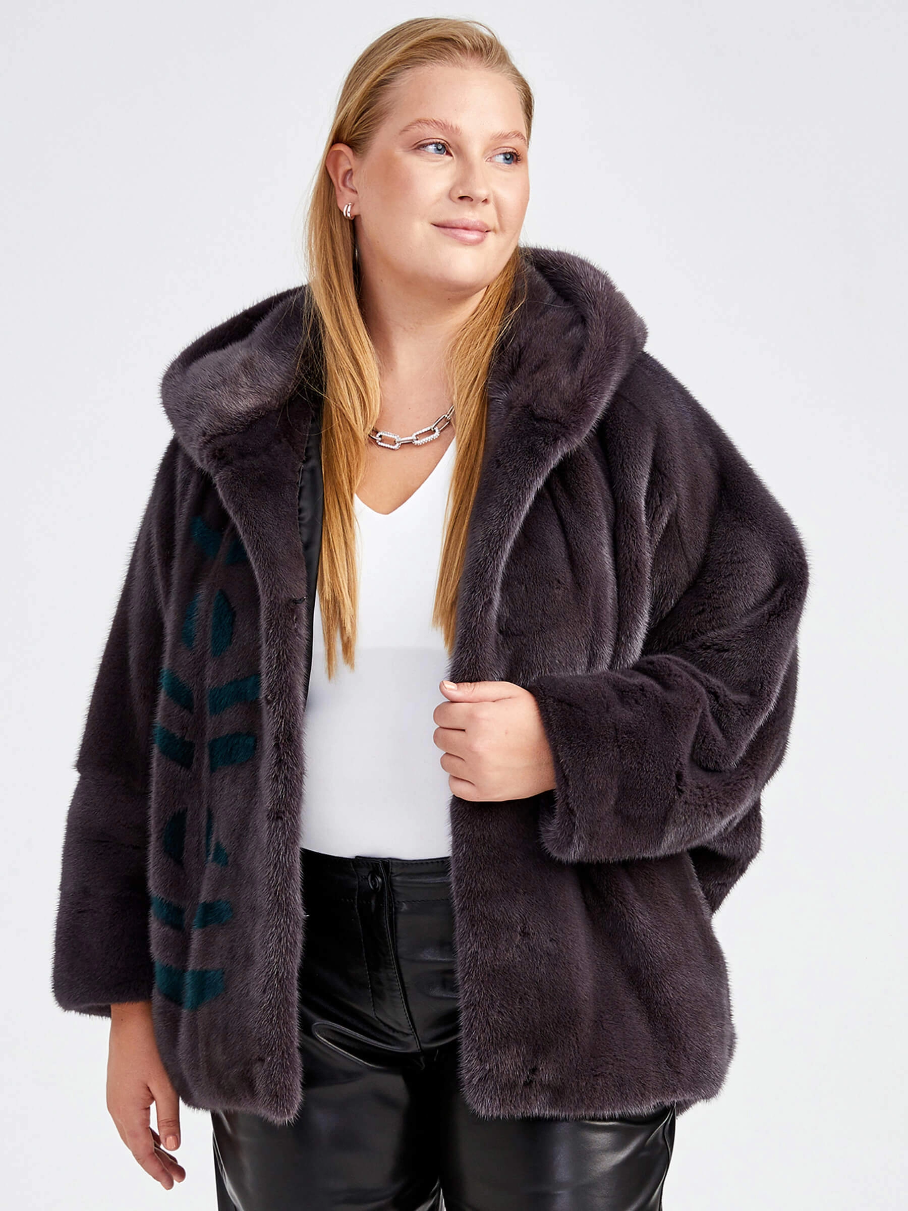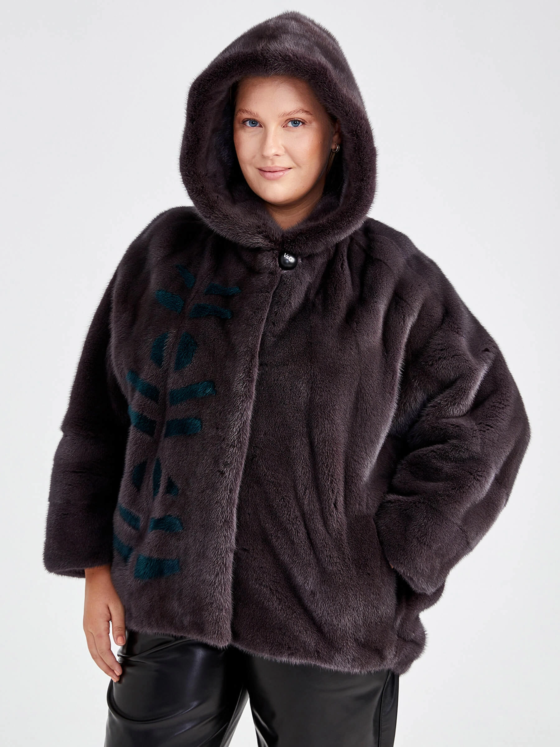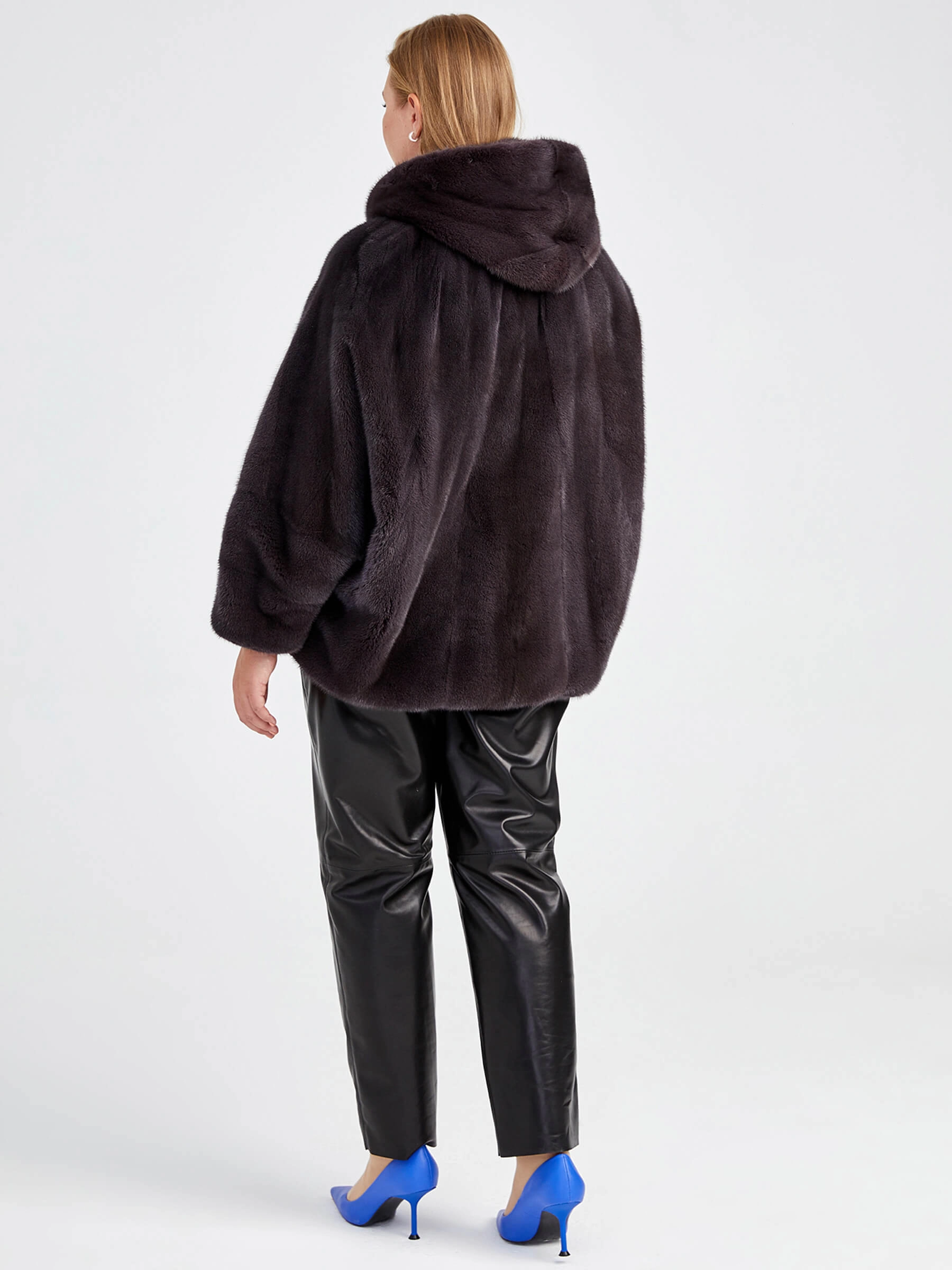 Удобный, объемный капюшон короткой шубы из меха норки с широким рукавом. Качественная фурнитура и подкладка. Комфортная посадка на любой тип фигур.