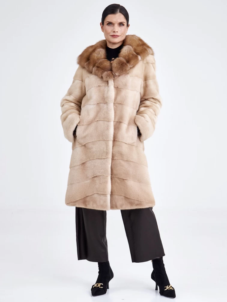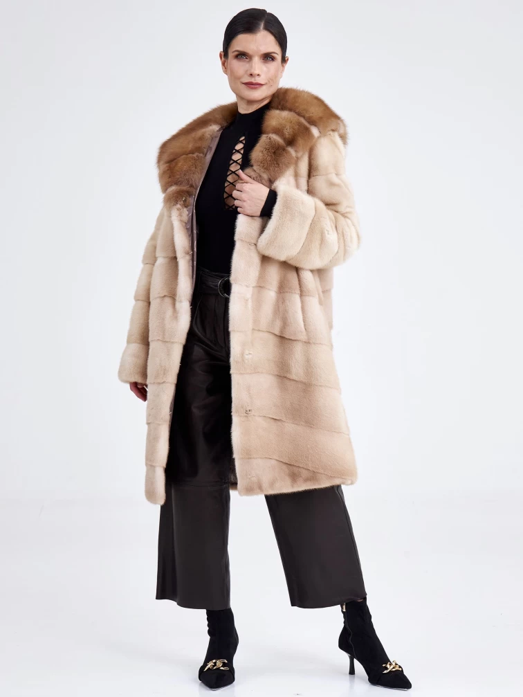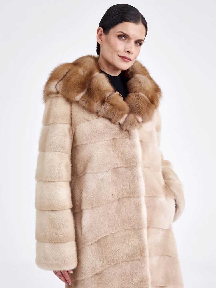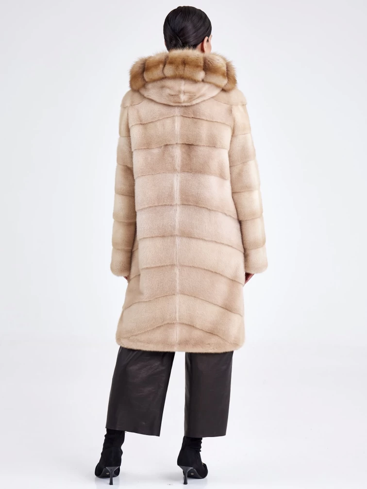 Шуба из меха норки с отделкой капюшона из меха куницы для женщин 2а(кк), бежевая, размер 46, артикул 33240