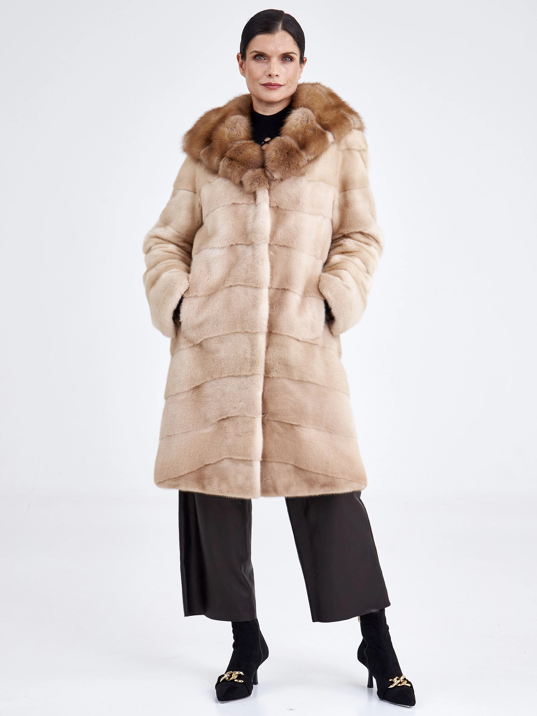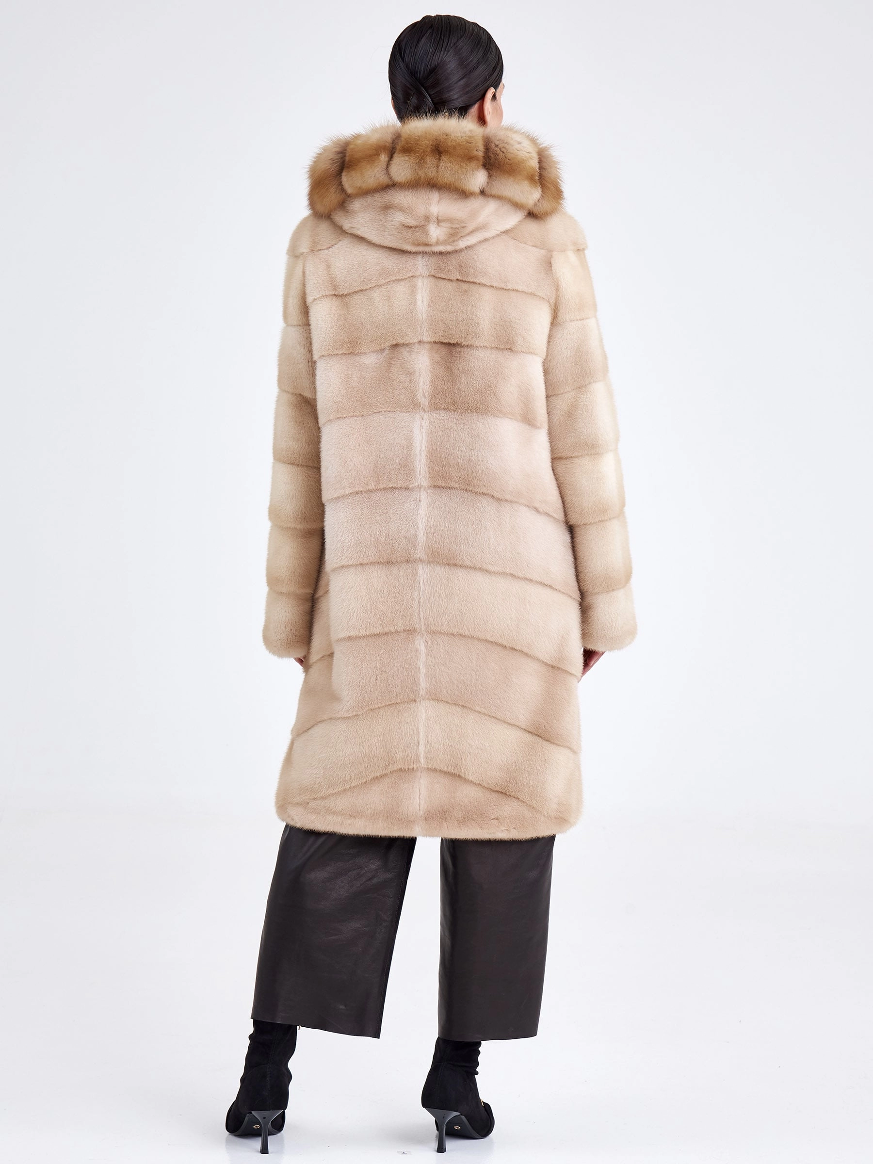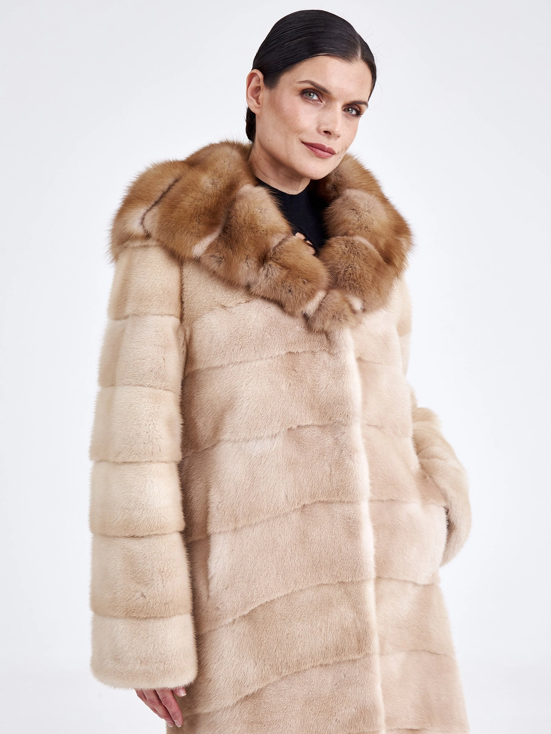 Удобное и комфортное пальто из нежной низковорсовой светло-коричневой норки станет отличным решением для холодной зимы. Прямой крой, поперечная раскладка меха. Модель дополнили глубоким капюшоном в сочетании с шелковистым мехом куницы. Изделие получилось не только легким, но и очень теплым.
