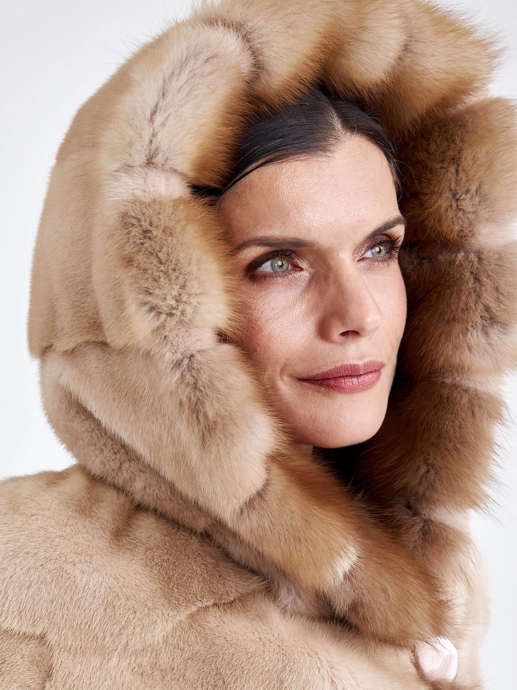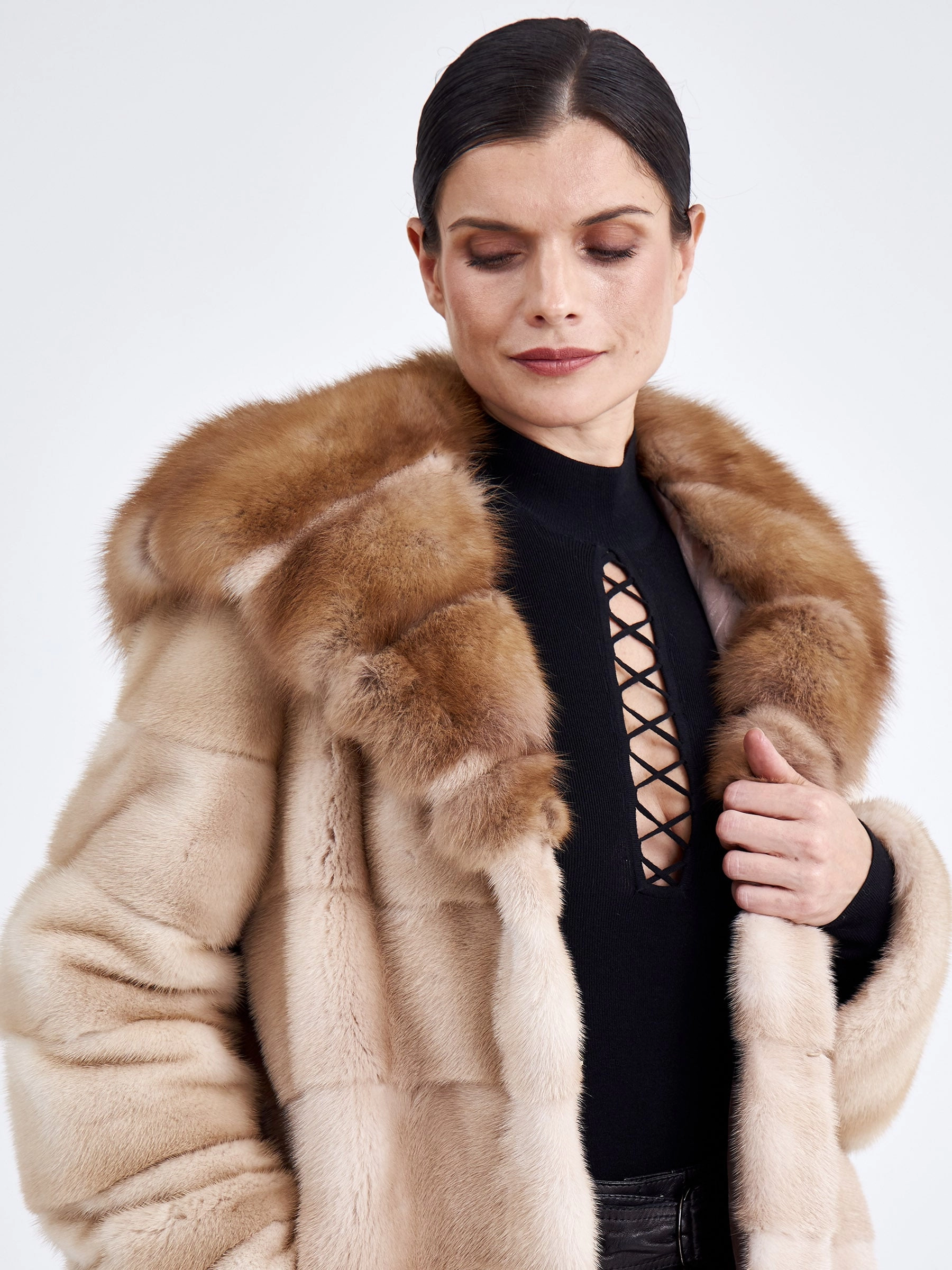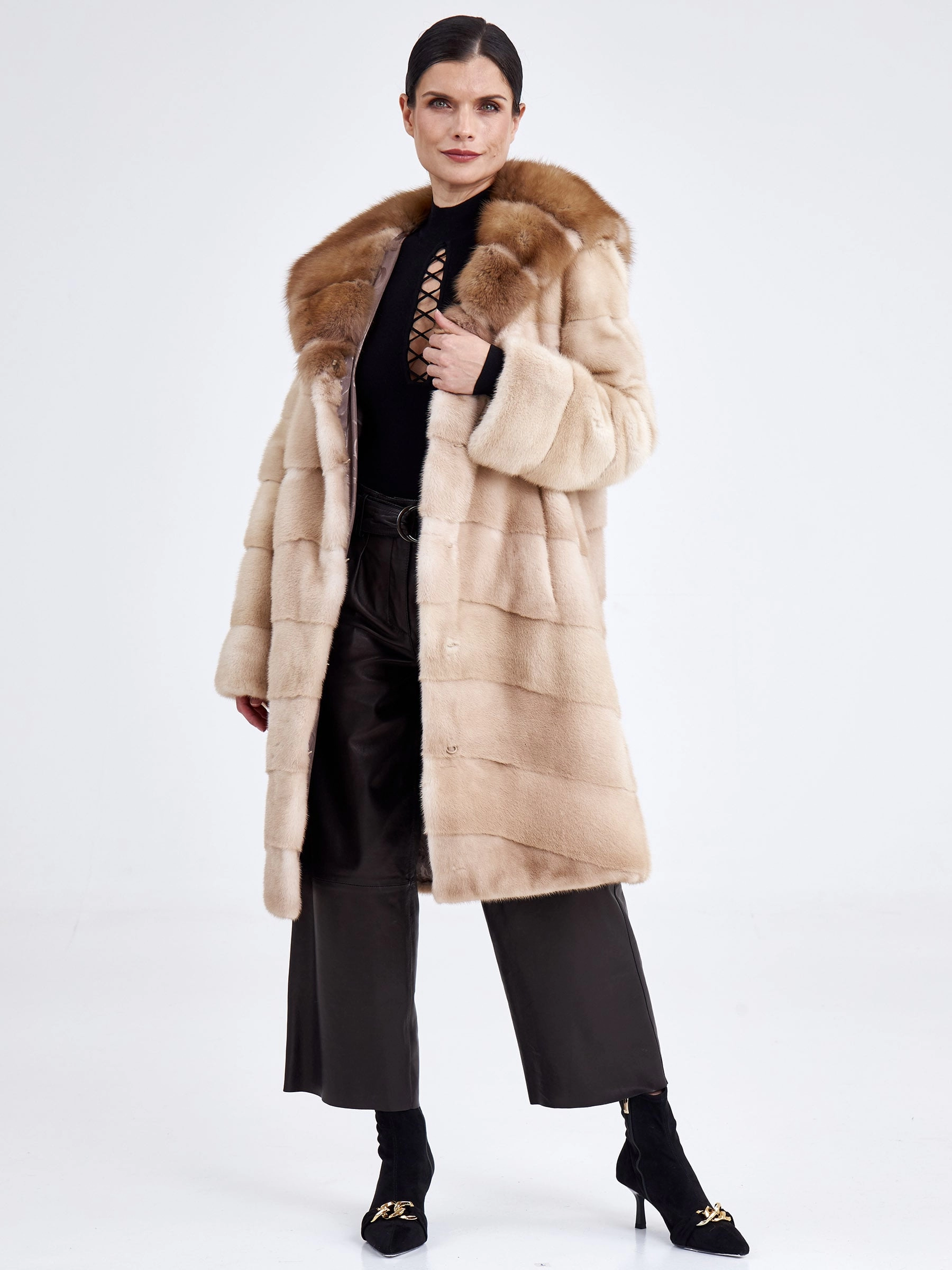 Удобное и комфортное пальто из нежной низковорсовой светло-коричневой норки станет отличным решением для холодной зимы. Прямой крой, поперечная раскладка меха. Модель дополнили глубоким капюшоном в сочетании с шелковистым мехом куницы. Изделие получилось не только легким, но и очень теплым.