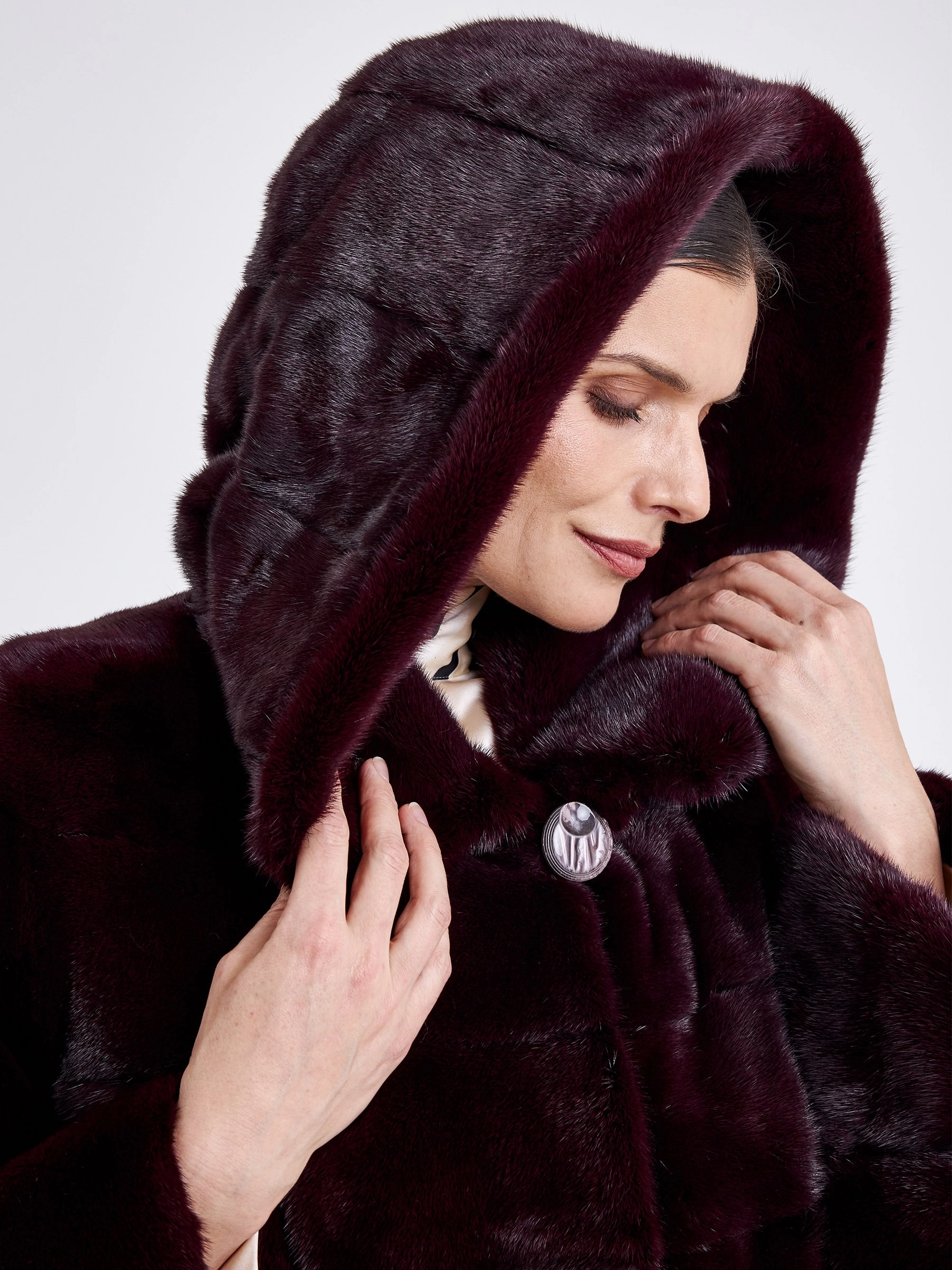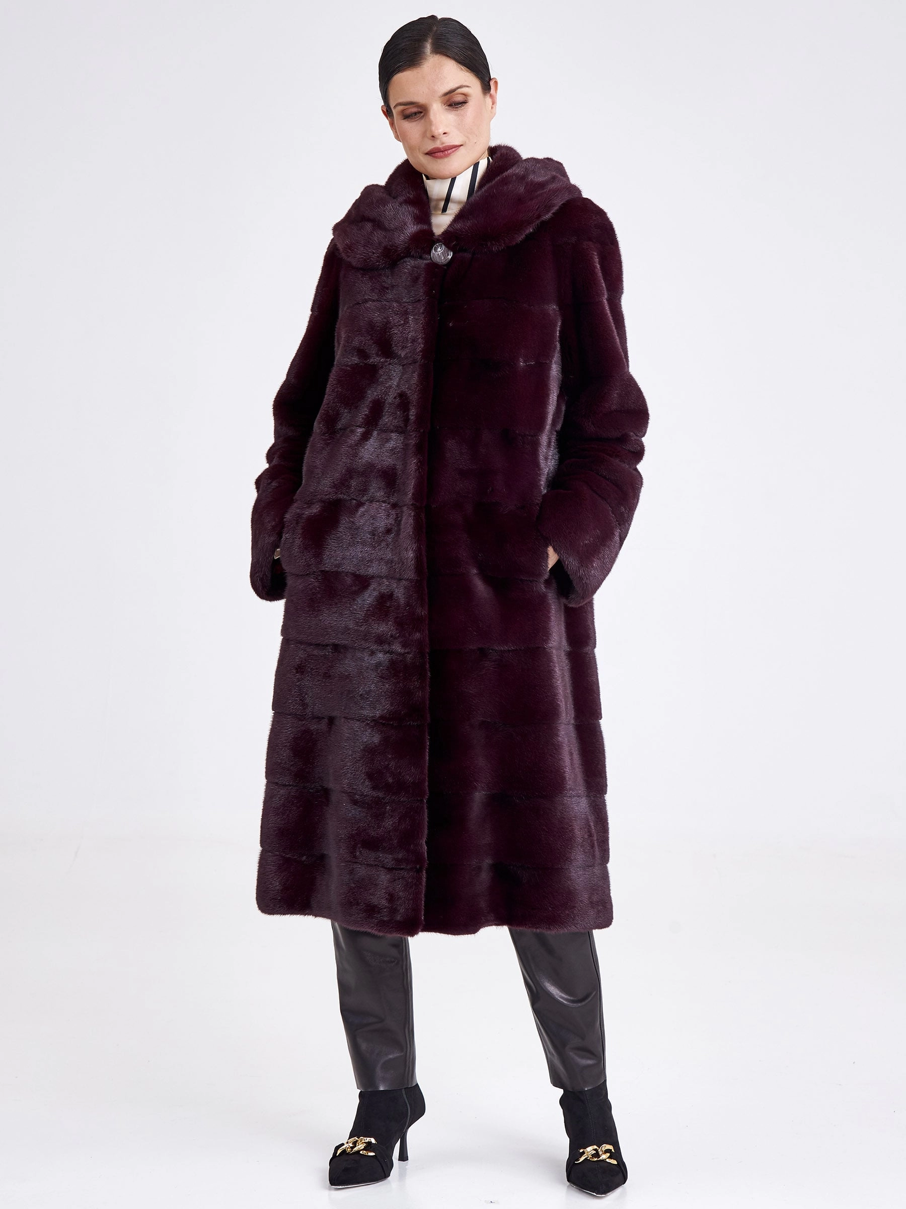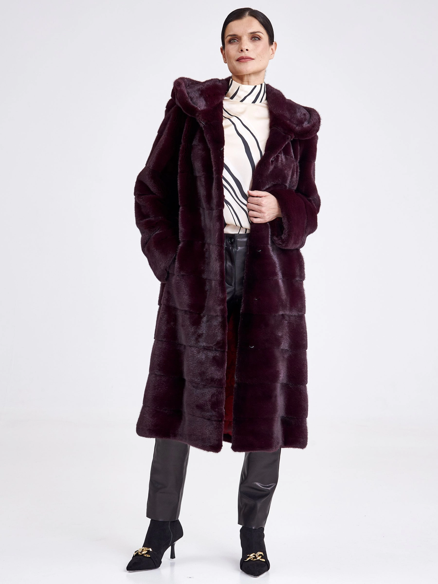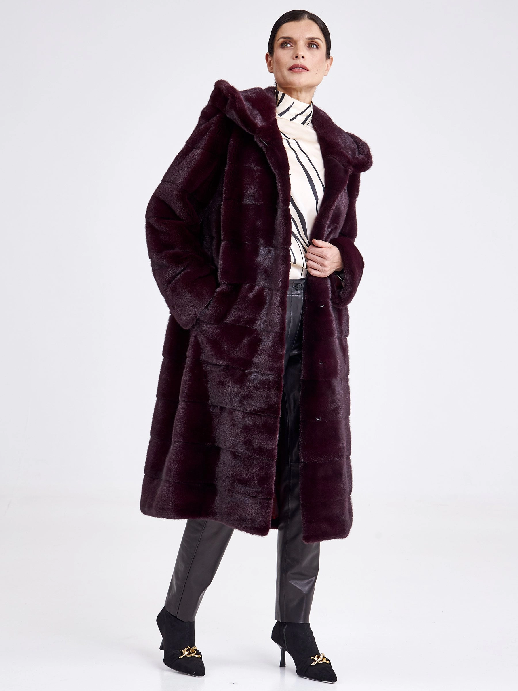 Товар длинная шуба из меха норки с капюшоном для женщин 2а(кд), бордовая, размер 52, артикул 33230 выполнен из норка крашенной с застежкой клипсы. Рассчитан на сезон: зима. Длина изделия свыше 90 см, силуэт прямой.