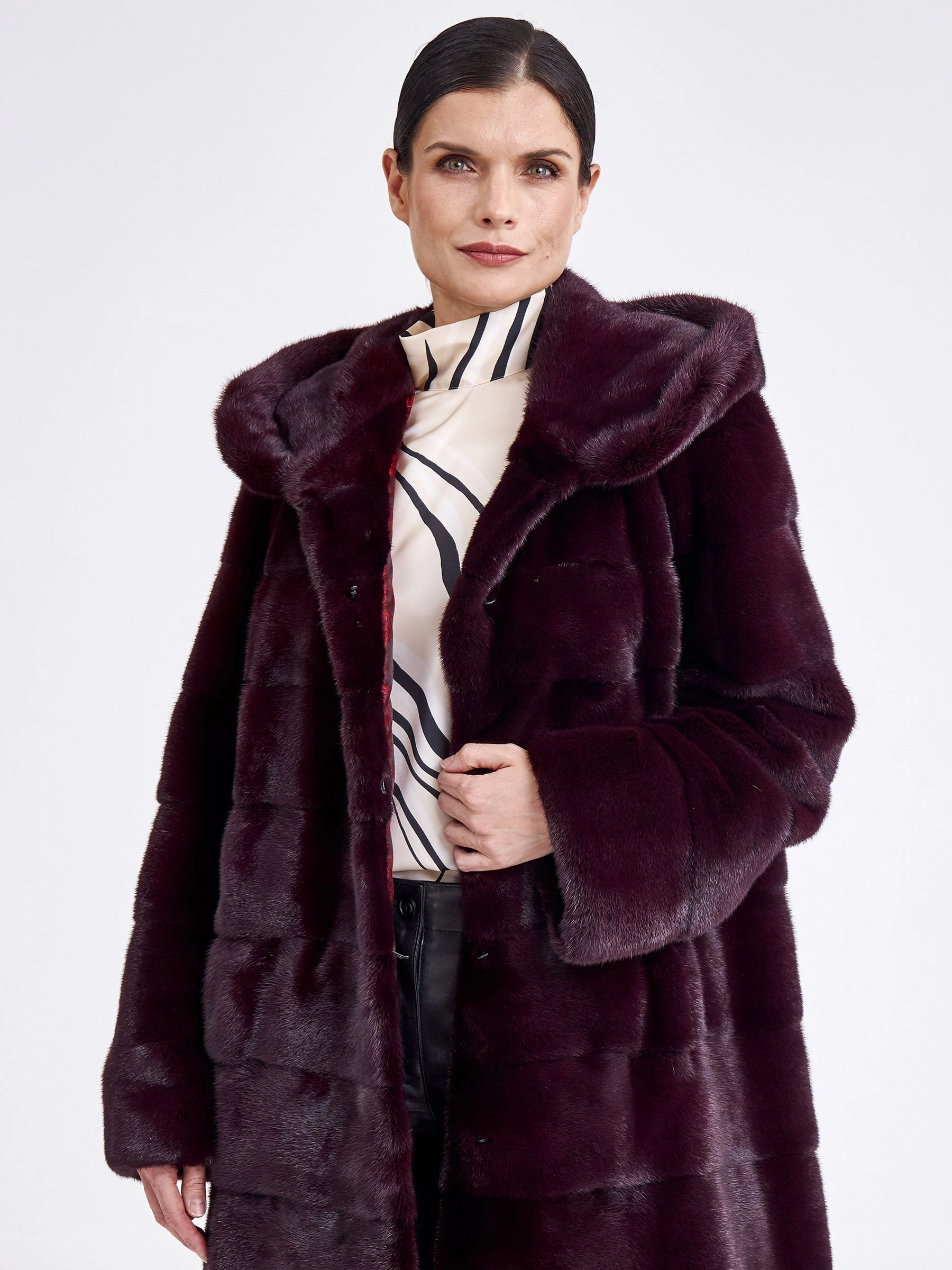 Длинная шуба из меха норки с капюшоном для женщин 2а(кд), бордовая, размер 52, артикул 33230
