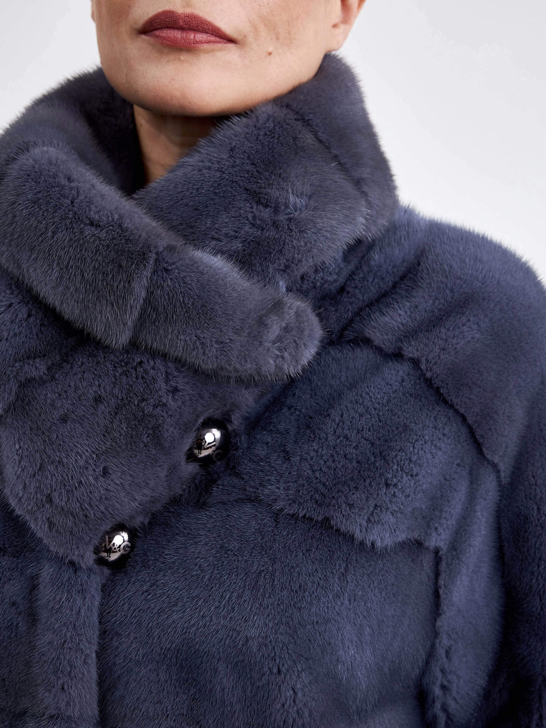Изысканной альтернативой для суровой зимы станет длинная шуба из крашеной норки в сером цвете. Модель прямого кроя с поперечной раскладкой меха создаёт стройный вертикальный силуэт, а рукав реглан и глубокий воротник-апаш придают образу непринуждённую элегантность. Застёжка на клипсы обеспечивает удобство, а длина свыше 90 см гарантирует исключительное тепло и царственную пластику движений. Совет стилиста: эта шуба — готовый statement-образ, который не требует сложных комбинаций. Носите её как платье, подобрав тонкое водолазное платье-чехол и высокие сапоги-ботфорты, чтобы подчеркнуть её роскошную длину и фактуру. Добавьте объёмные кожаные перчатки и минималистичную сумку-кроссбоди для создания безупречного баланса между уютом, теплом и современной лаконичностью.