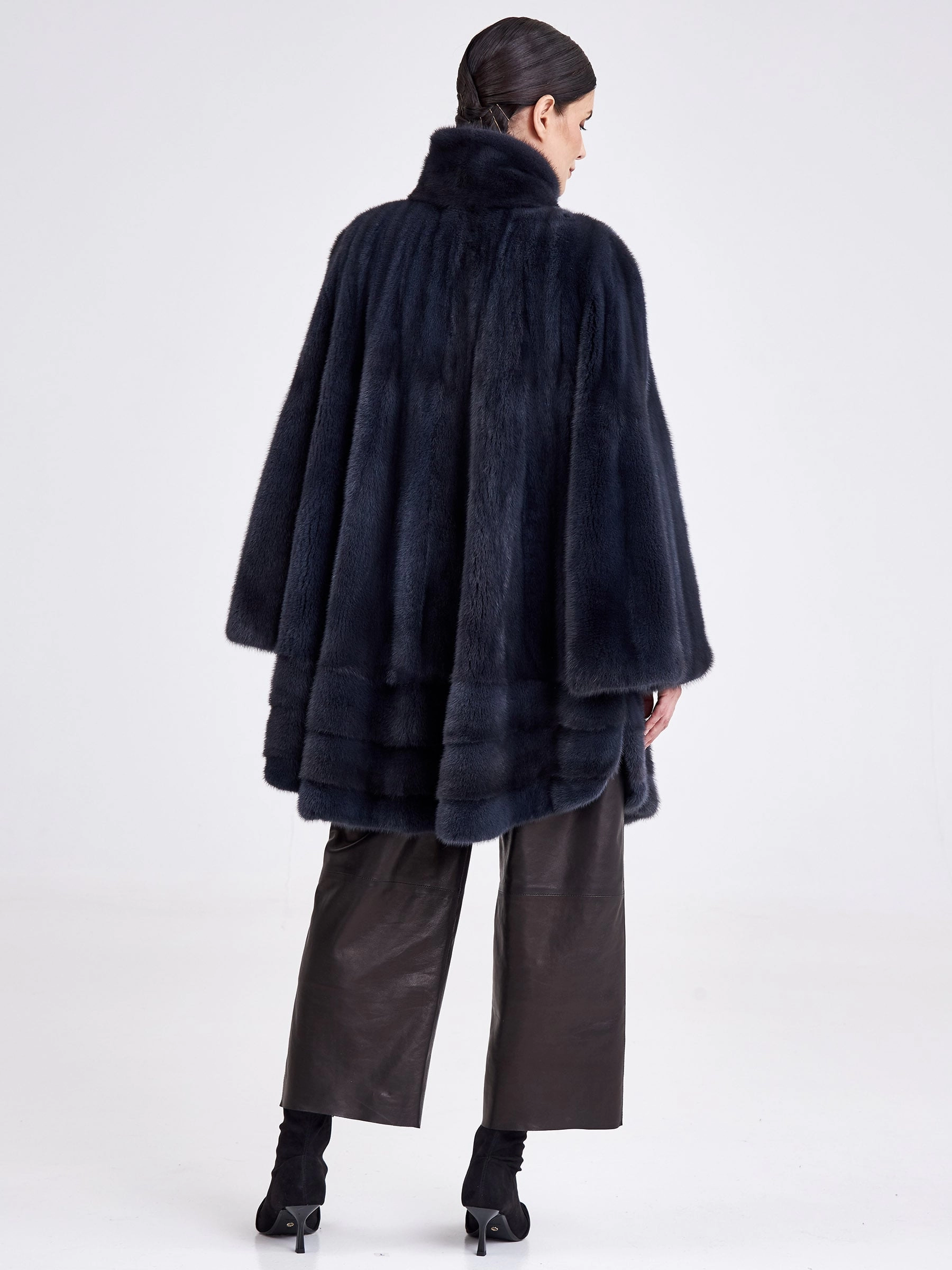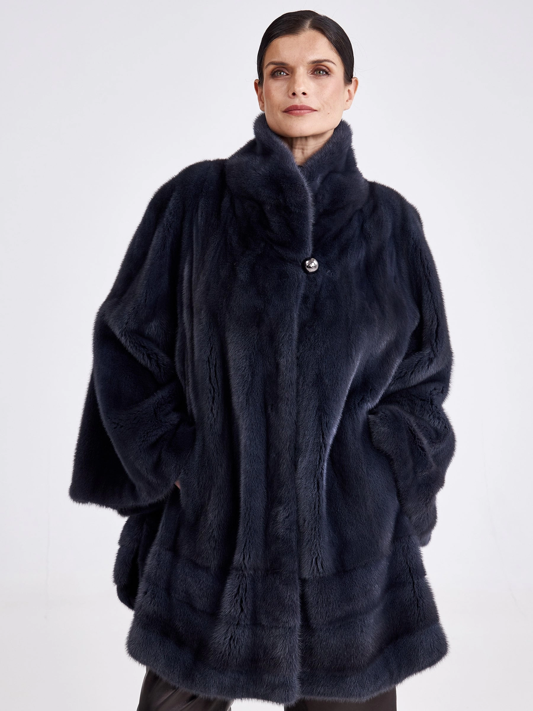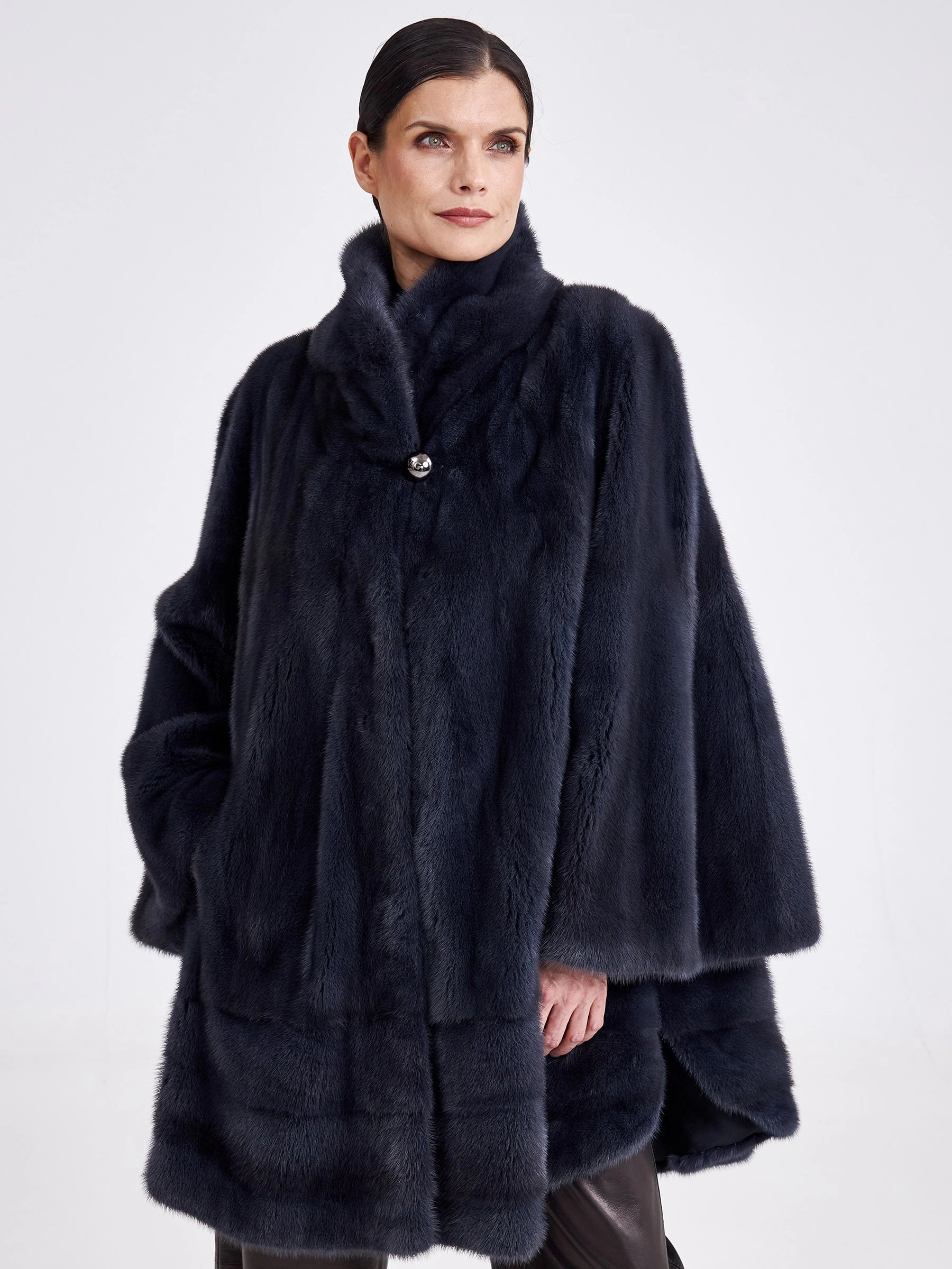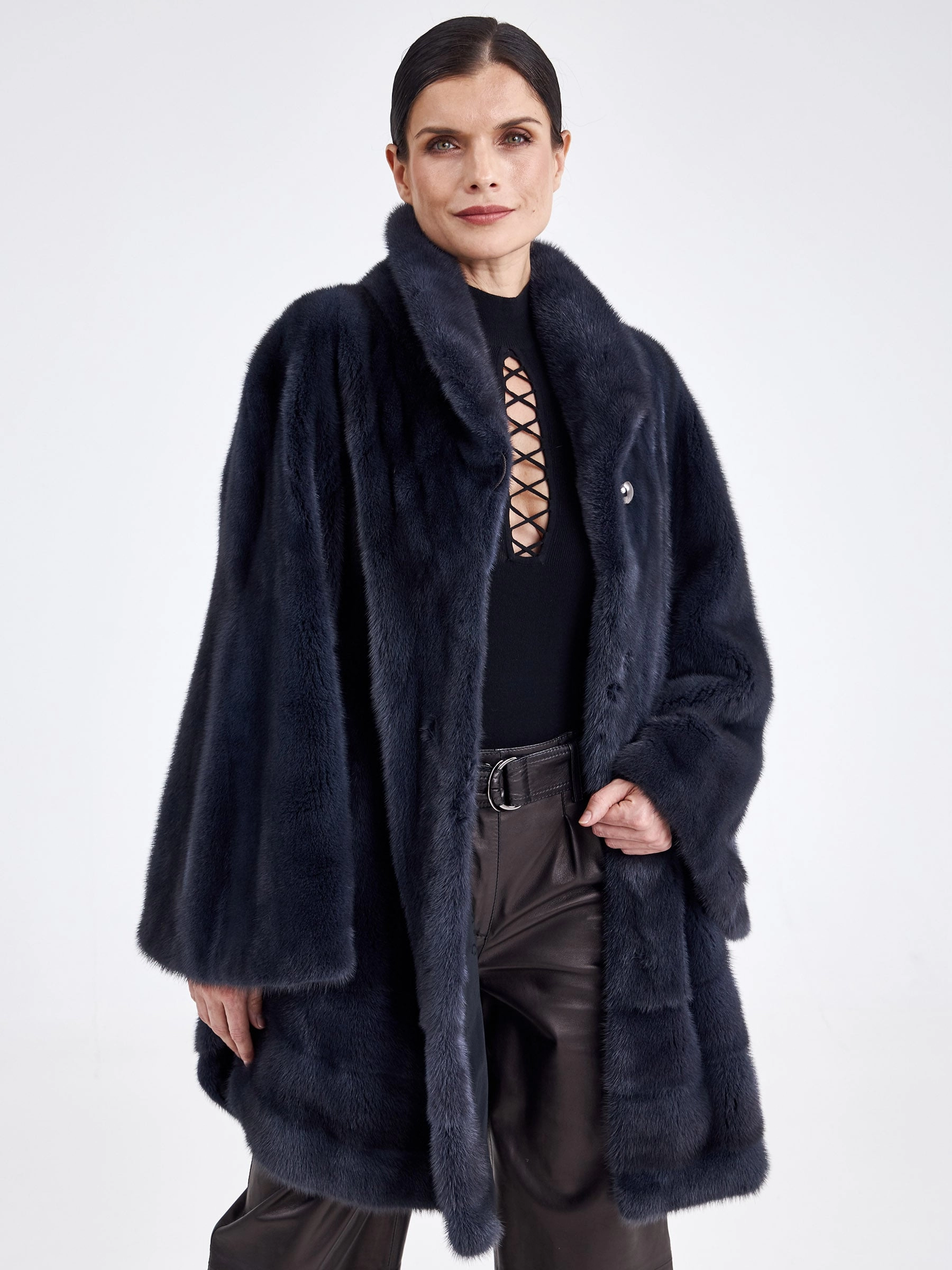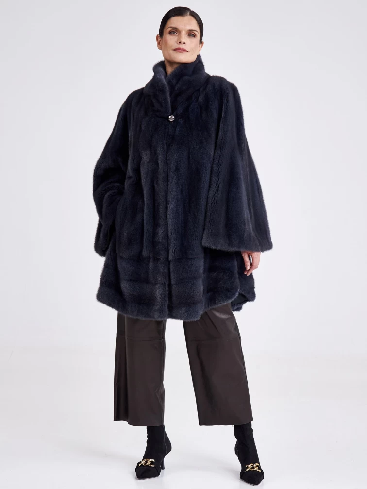 Невероятно стильная модель свободного кроя выполнена из низковорсовой шелковистой норки. Создавая это полупальто, мастера использовали два вида выкладки меха: низ-поперечный, верх- пластины в роспуск.Изделие получилось пластичным и теплым. Широкие рукава не стесняют движения. Воротник -апаш, застежка-клипсы. В такой шубке любая дама будет всегда выглядеть безупречно и комфортно