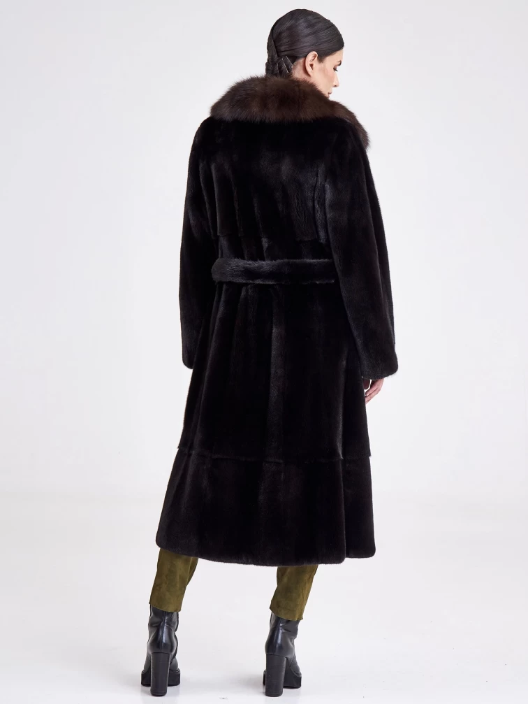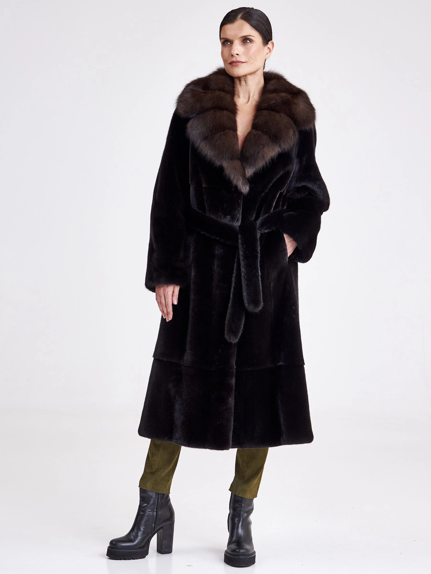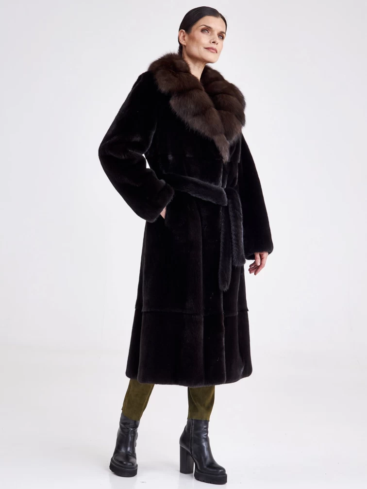 Эта модель не нуждается в коментариях и лишнем декоре- не стареющая классика. Густая шелковистая норка великолепно сохраняет тепло, мех нежно переливается под лучами солнца. Полуприлегающий силуэт с длинным поясом удачно подчеркнет фигуру, а английский воротник из нежного соболя добавит элегантности и шика в ваш образ.