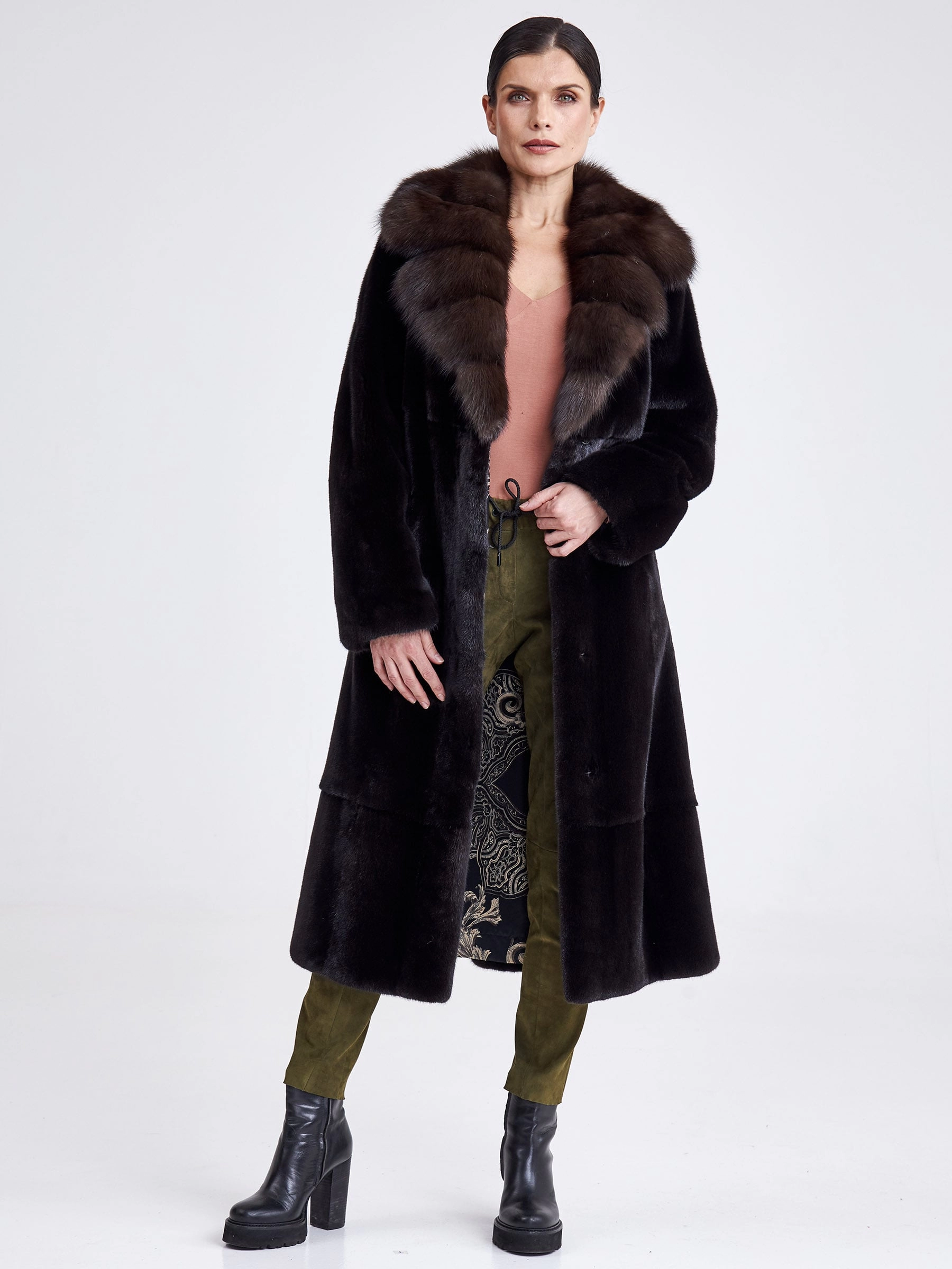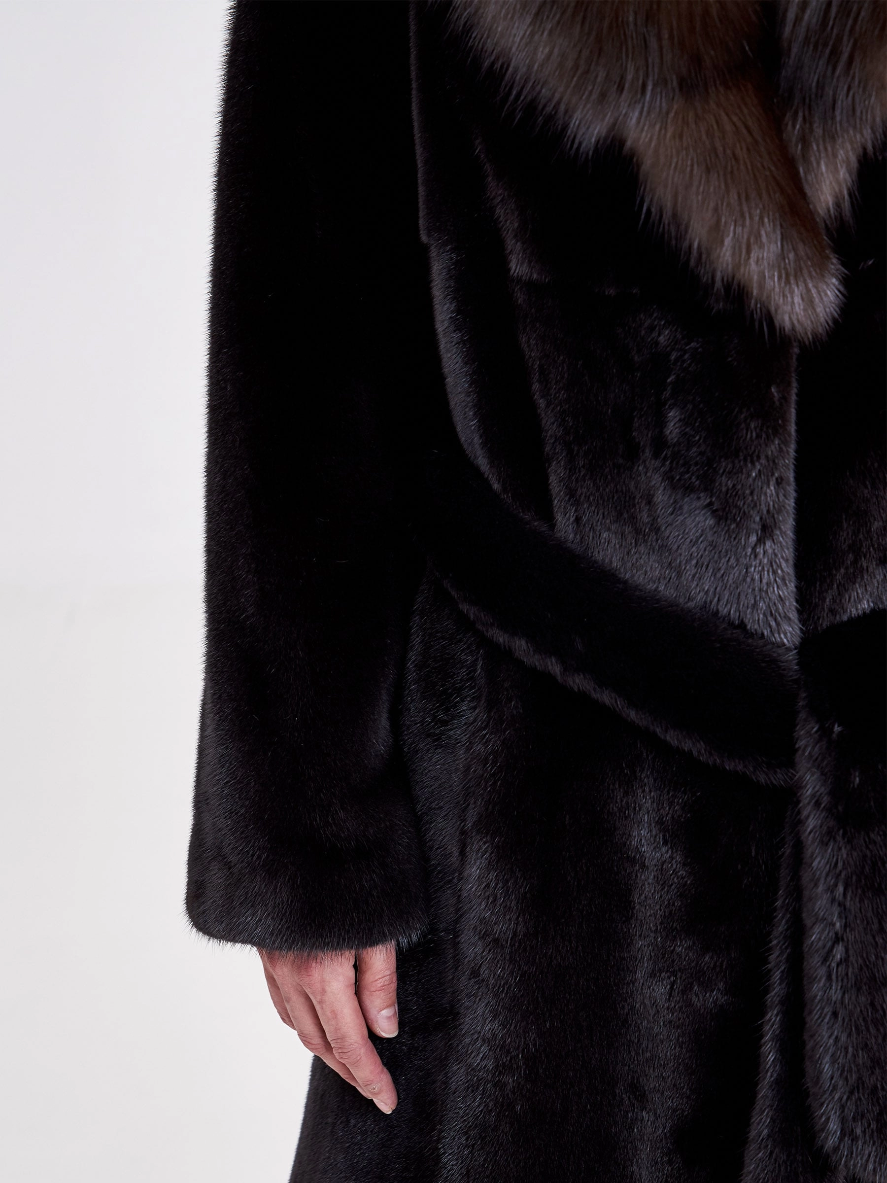 Товар женская длинная шуба из меха норки с воротником из меха соболя 17231(ав), черная, размер 48, артикул 33270 выполнен из норка крашенной с застежкой клипсы. Рассчитан на сезон: зима. Длина изделия свыше 90 см, силуэт полуприлегающий.