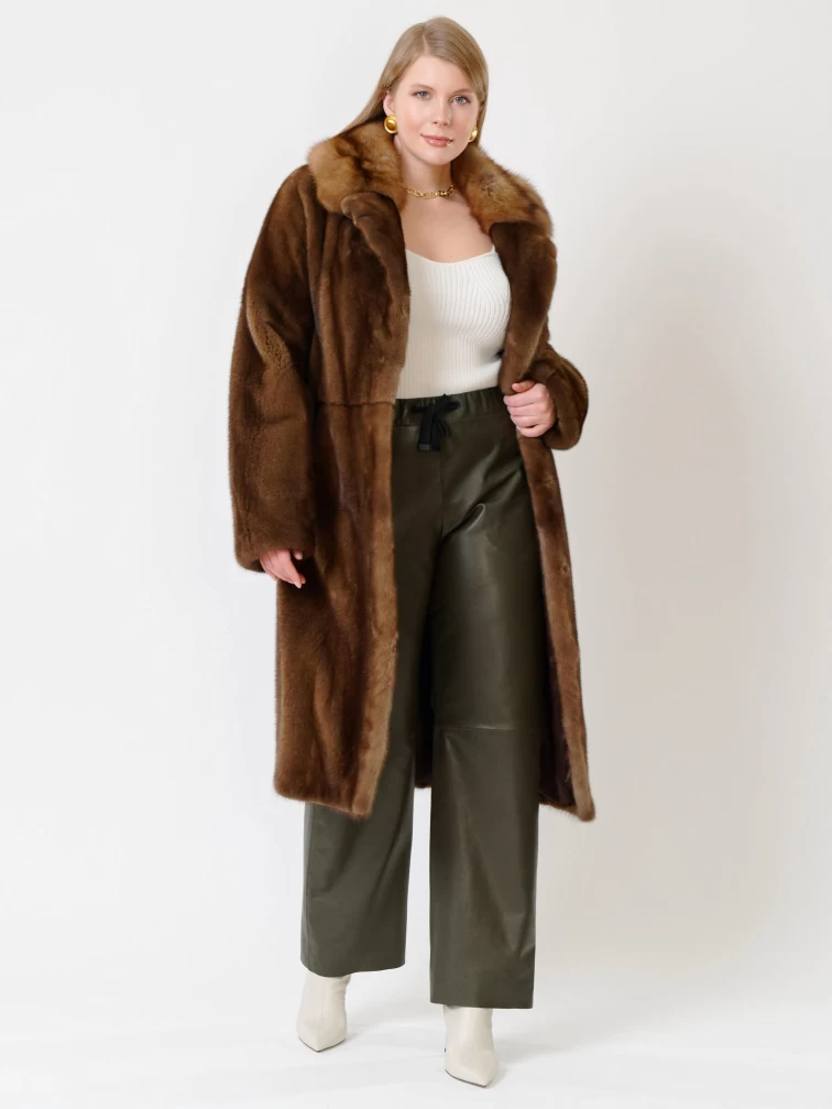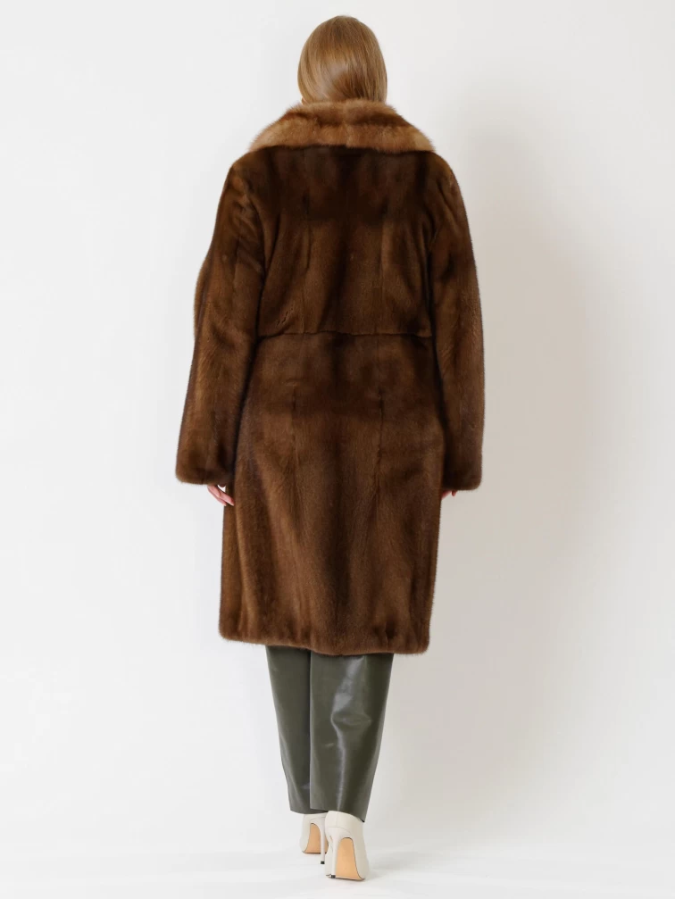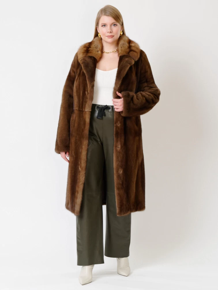 Товар норковая женская шуба с английским воротником из меха соболя 17417(ав), коричневая, размер 48, артикул 33470 выполнен из норка крашенной с застежкой клипсы. Рассчитан на сезон: осень-зима. Длина изделия свыше 90 см, силуэт прямой.