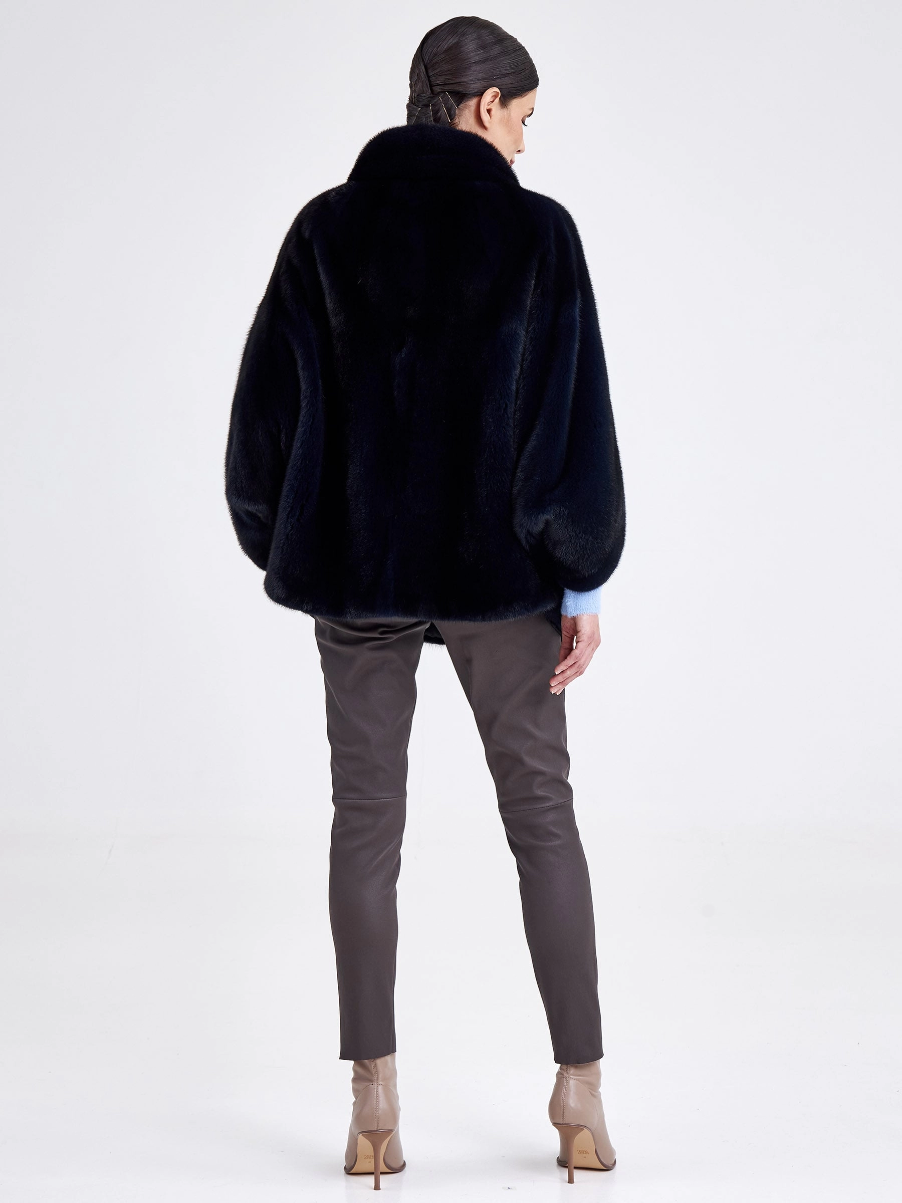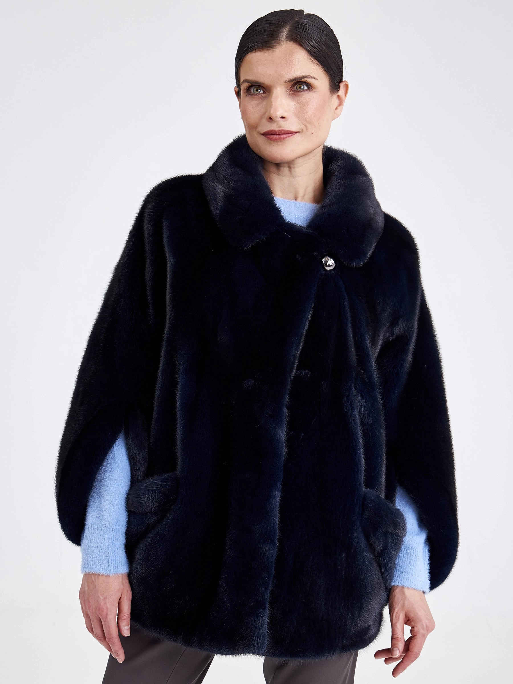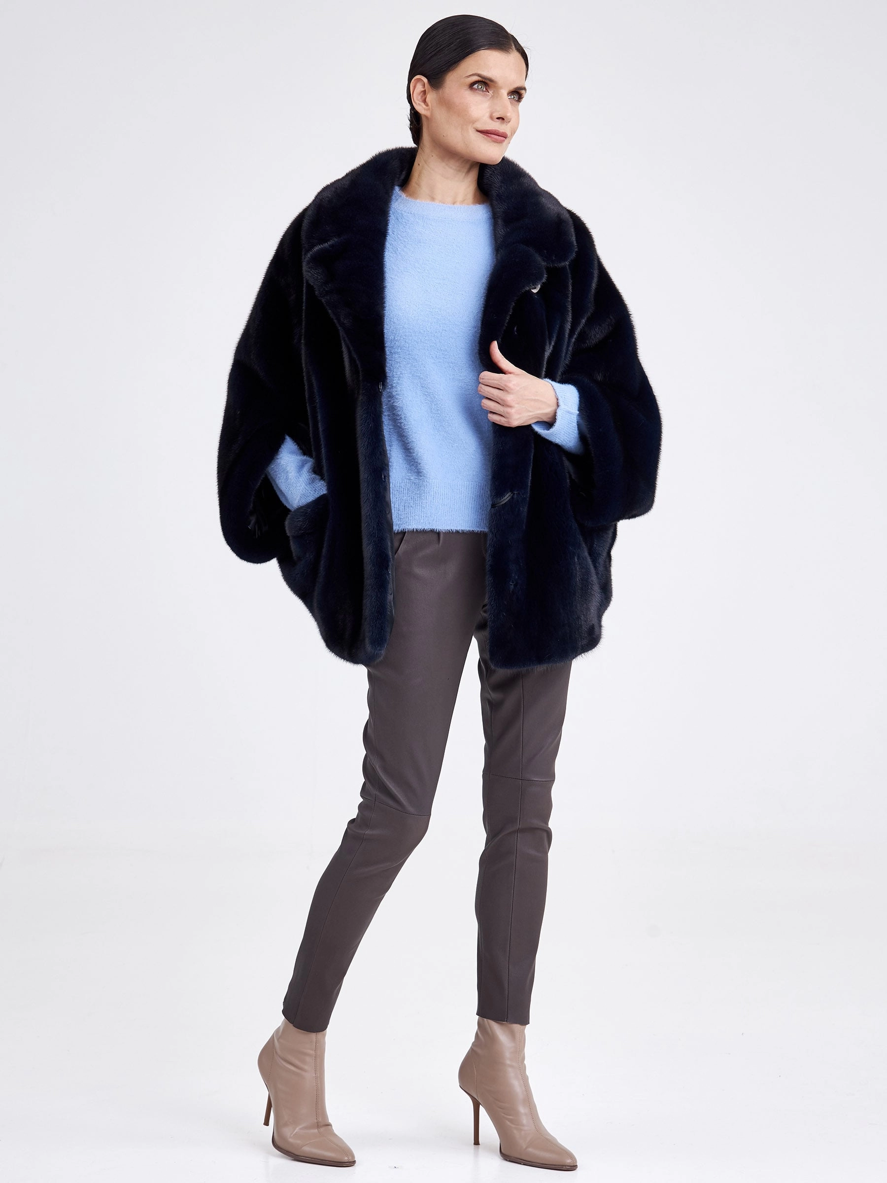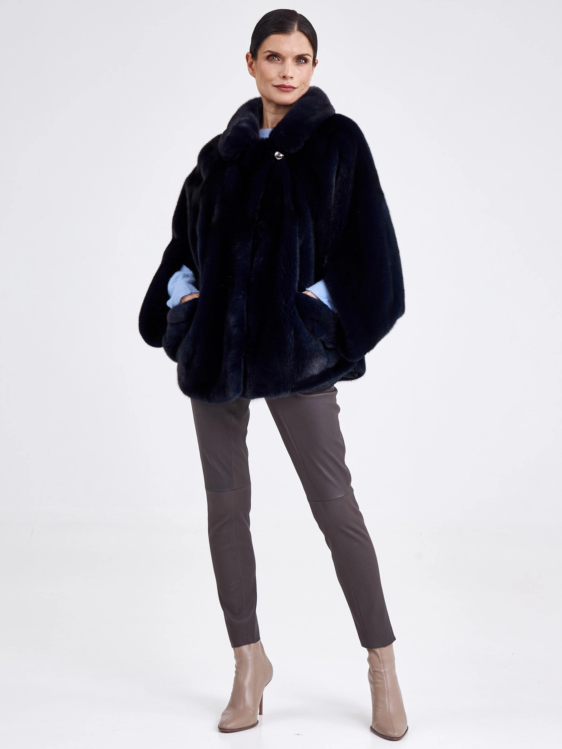 Куртку с английским воротником свободного кроя выполнили из шелковистой низковорсовой норки, покрасив ее в насыщенный темно синий цвет. Изделие получилось легким и очень теплым. Мастера не стали перегружать модель дополнительным декором, добавили лишь два боковых кармана с отворотами. Застежка-клипсы. Рукав - укороченный. Удачно сочетается как с джинсами, так и юбкой.