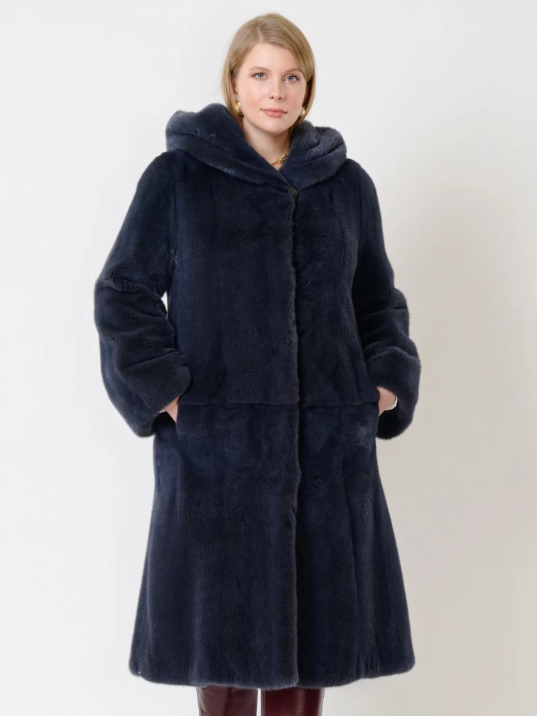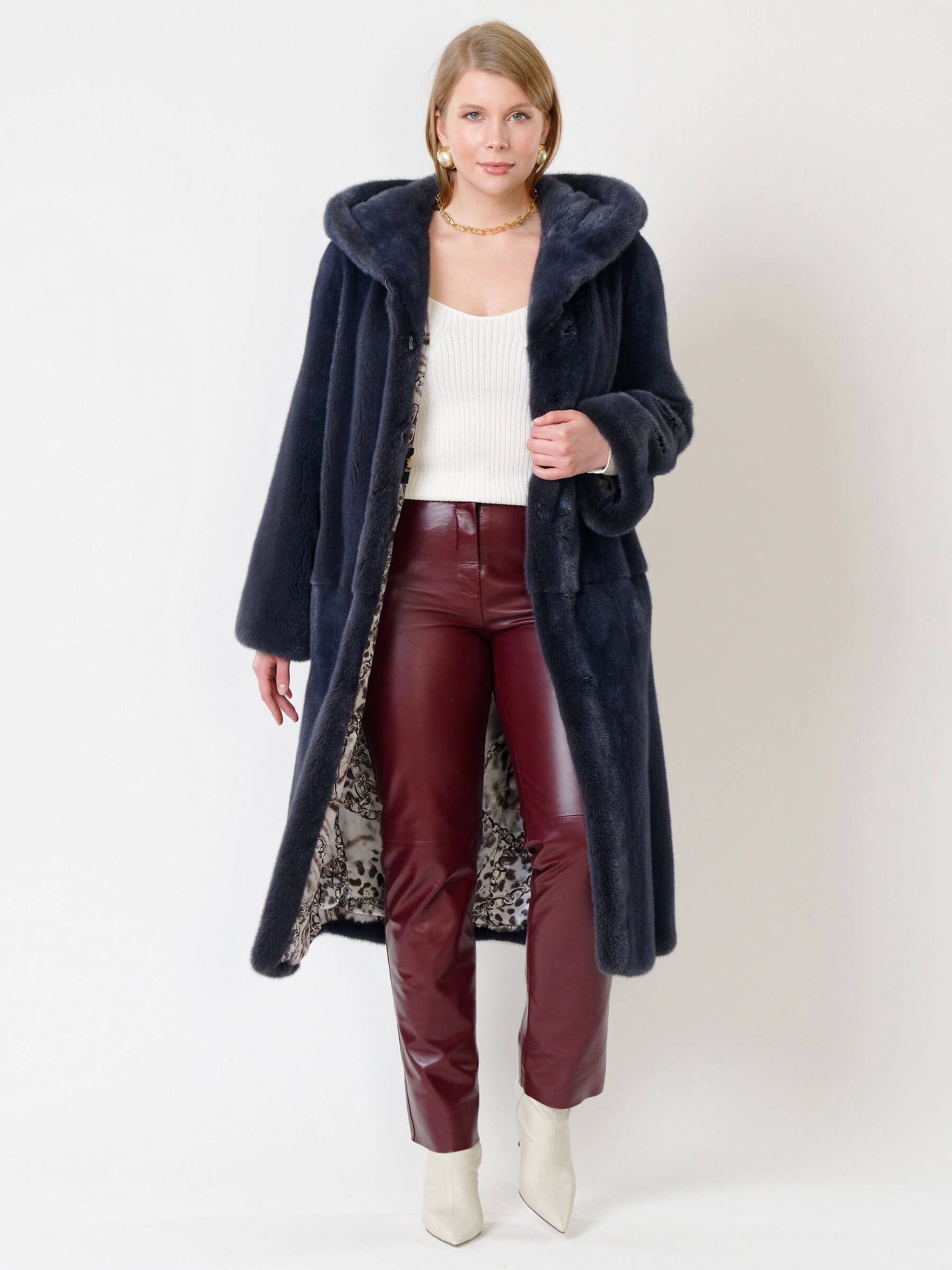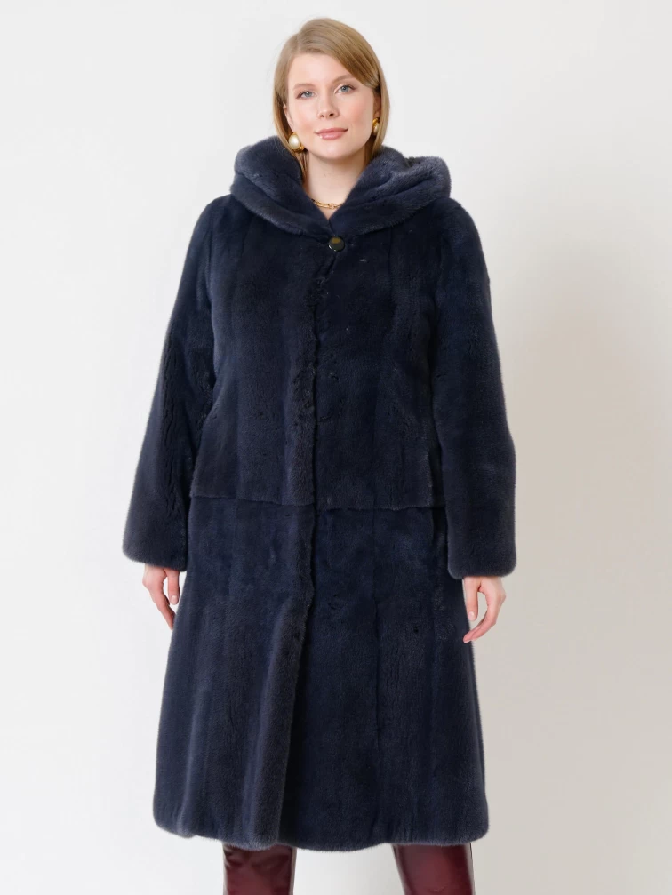 Товар длинная норковая женская шуба с капюшоном под пояс 216(к), графитовая, размер 46, артикул 33430 выполнен из норка крашенной с застежкой клипсы. Рассчитан на сезон: осень-зима. Длина изделия свыше 90 см, силуэт прямой.