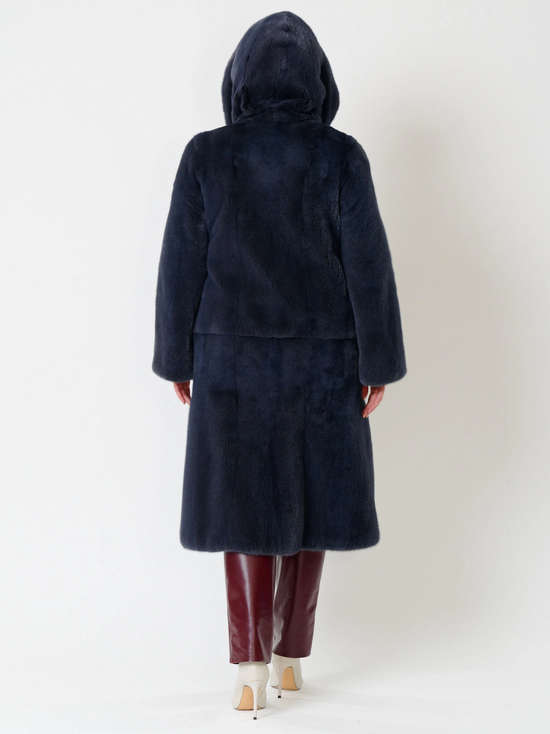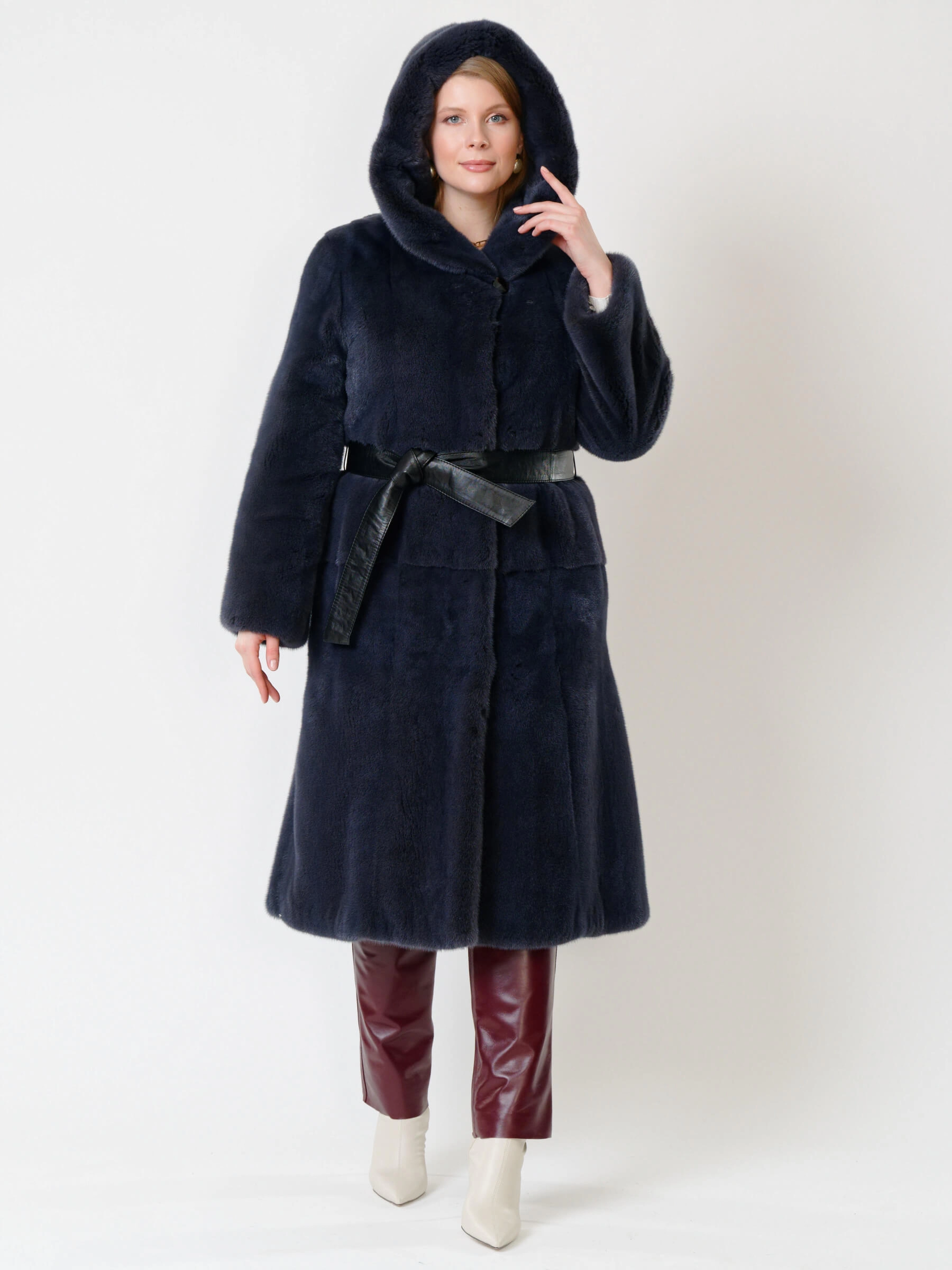Длинная норковая женская шуба с капюшоном под пояс 216(к), графитовая, размер 46, артикул 33430