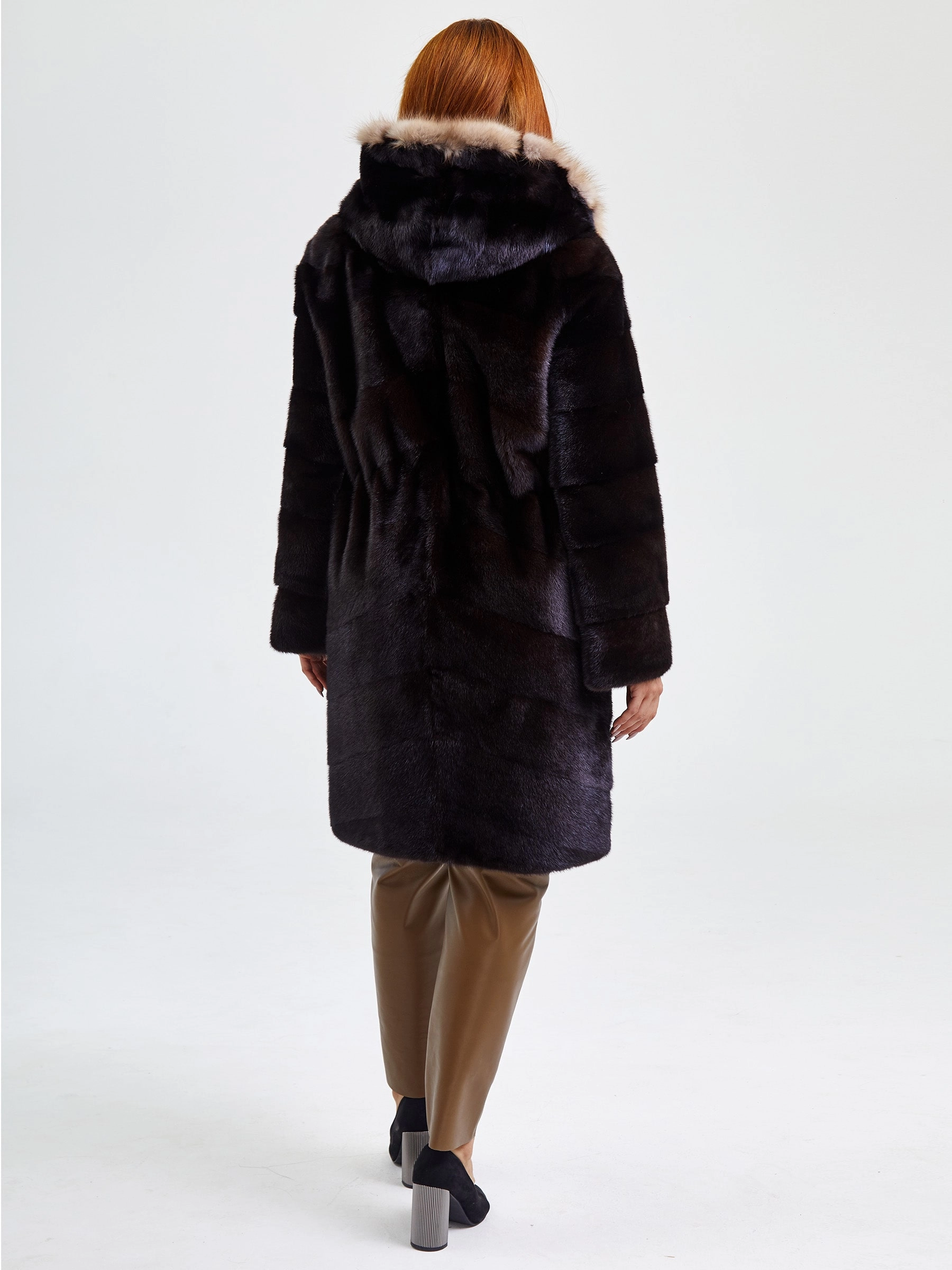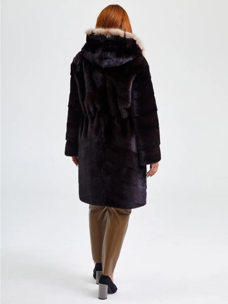 Элегантная женская шуба с идеальной посадкой по фигуре. Прямой силуэт и утягивающие кулиски расположены на линии талии. Раскладка меха пластин-поперечная. Глубокий капюшон, отделанный мехом куницы, легко заменит головной убор.