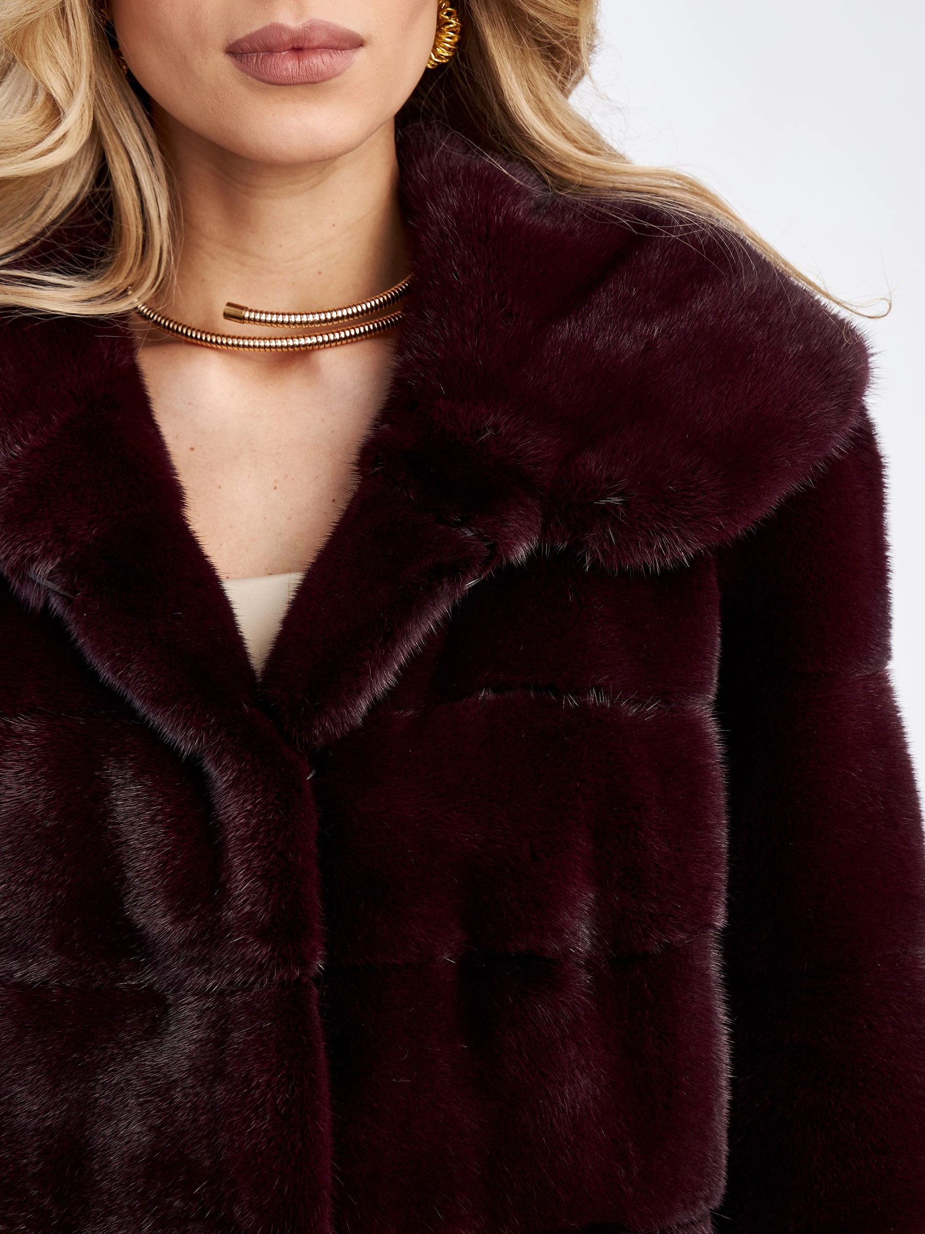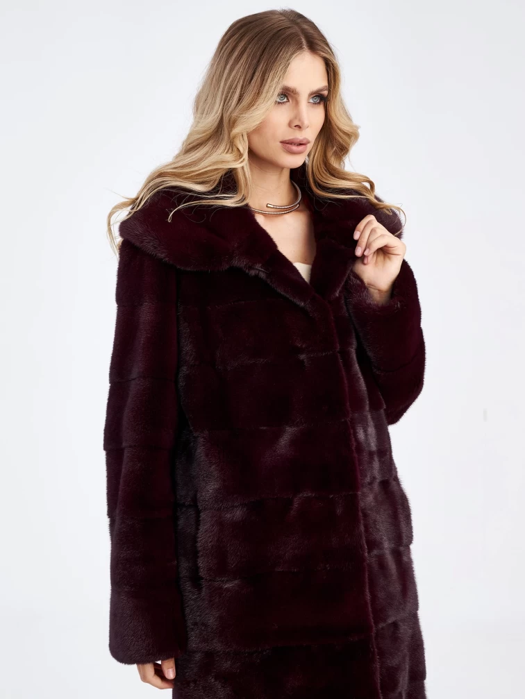 Длинная поперечная шуба из меха норки с капюшоном для женщин 2а(к), бордовая, размер 52, артикул 33850