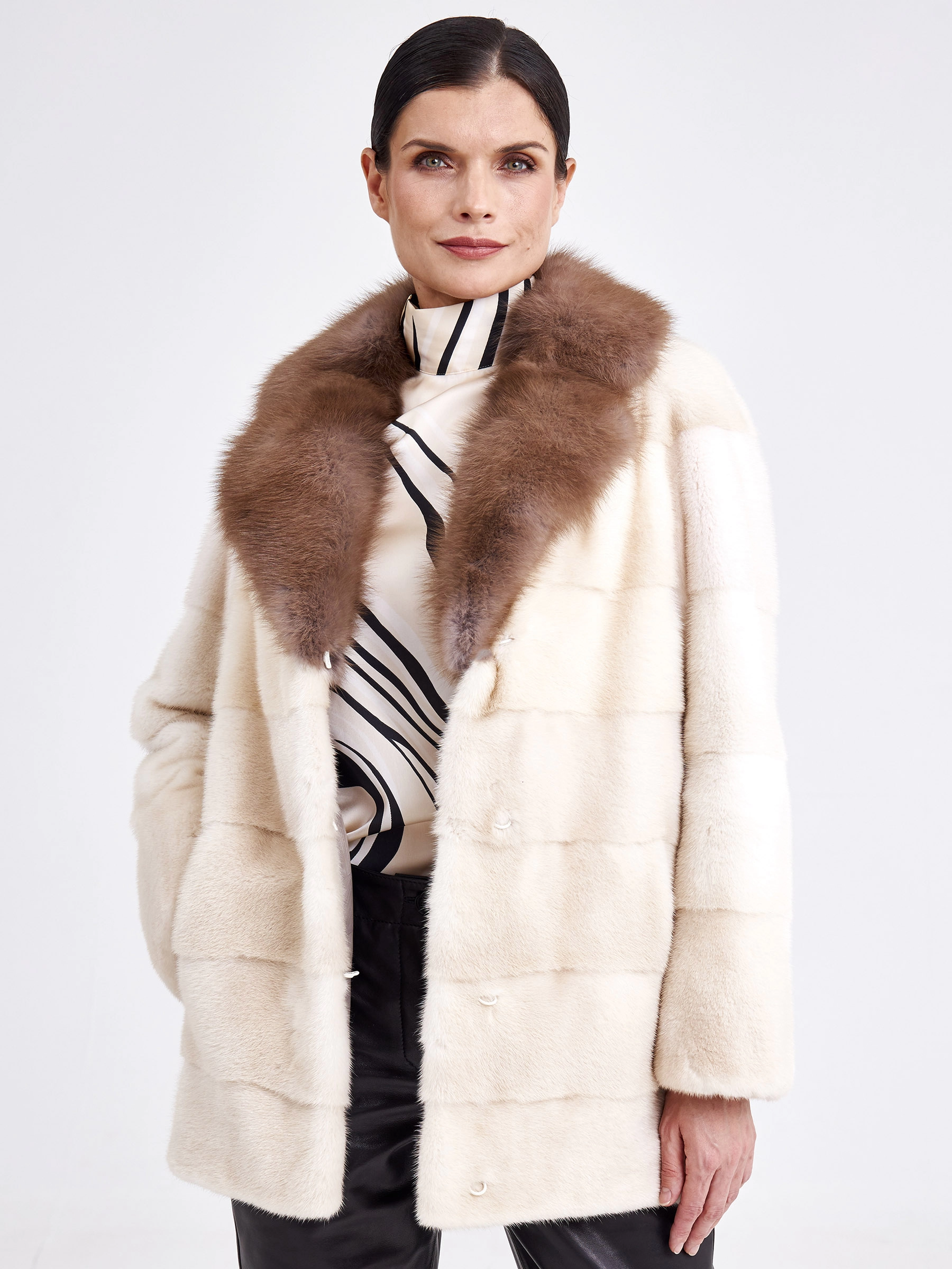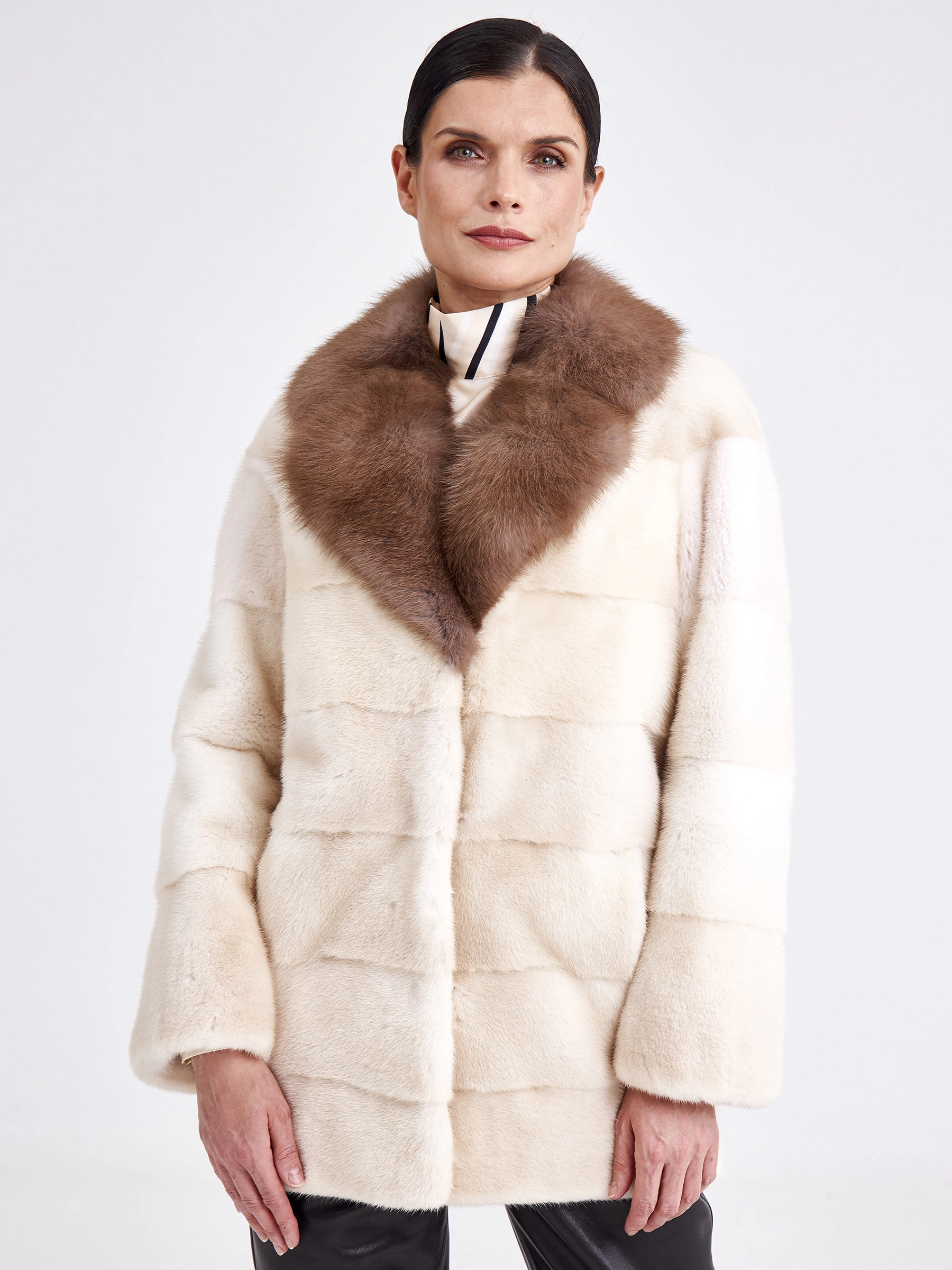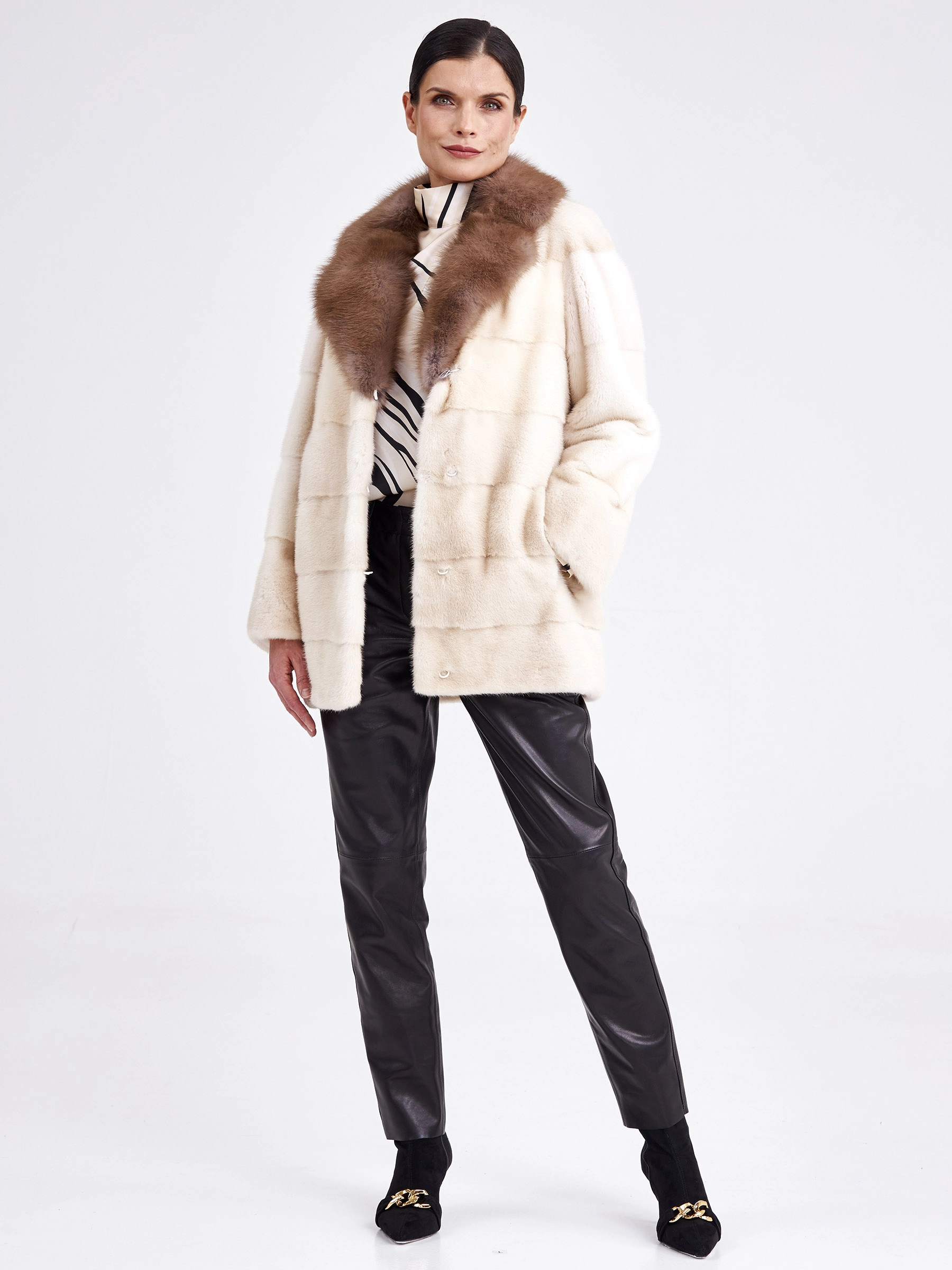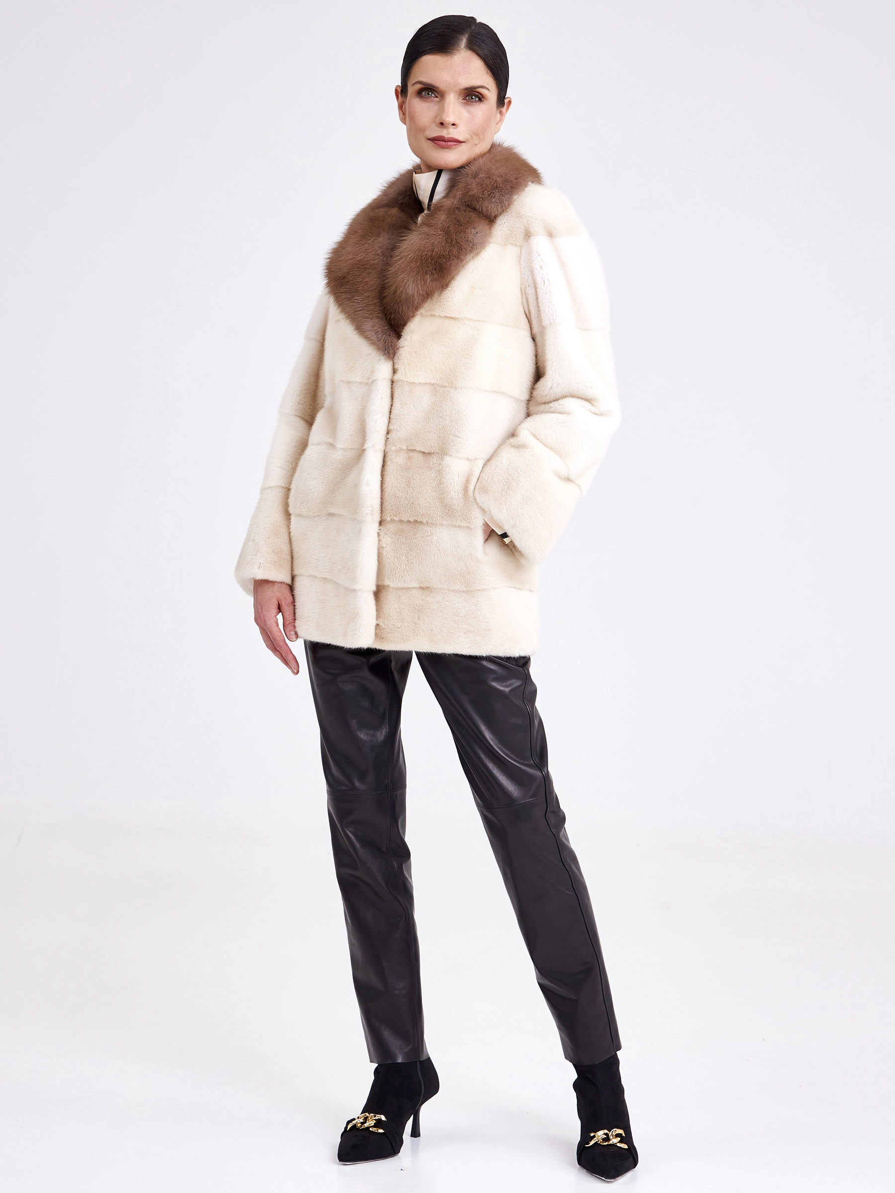 Ничто так не освежает внешность и не дополняет элегантность к образу, как короткая лаконичная куртка из густой стриженой норки в цвете жемчуг, в сочетании с нежной шелковистой куницей дымчатого оттенка. Прямой крой, поперечная раскладка меха,застежка -клипсы. Статус и комфорт послужило дополнением к изделию.