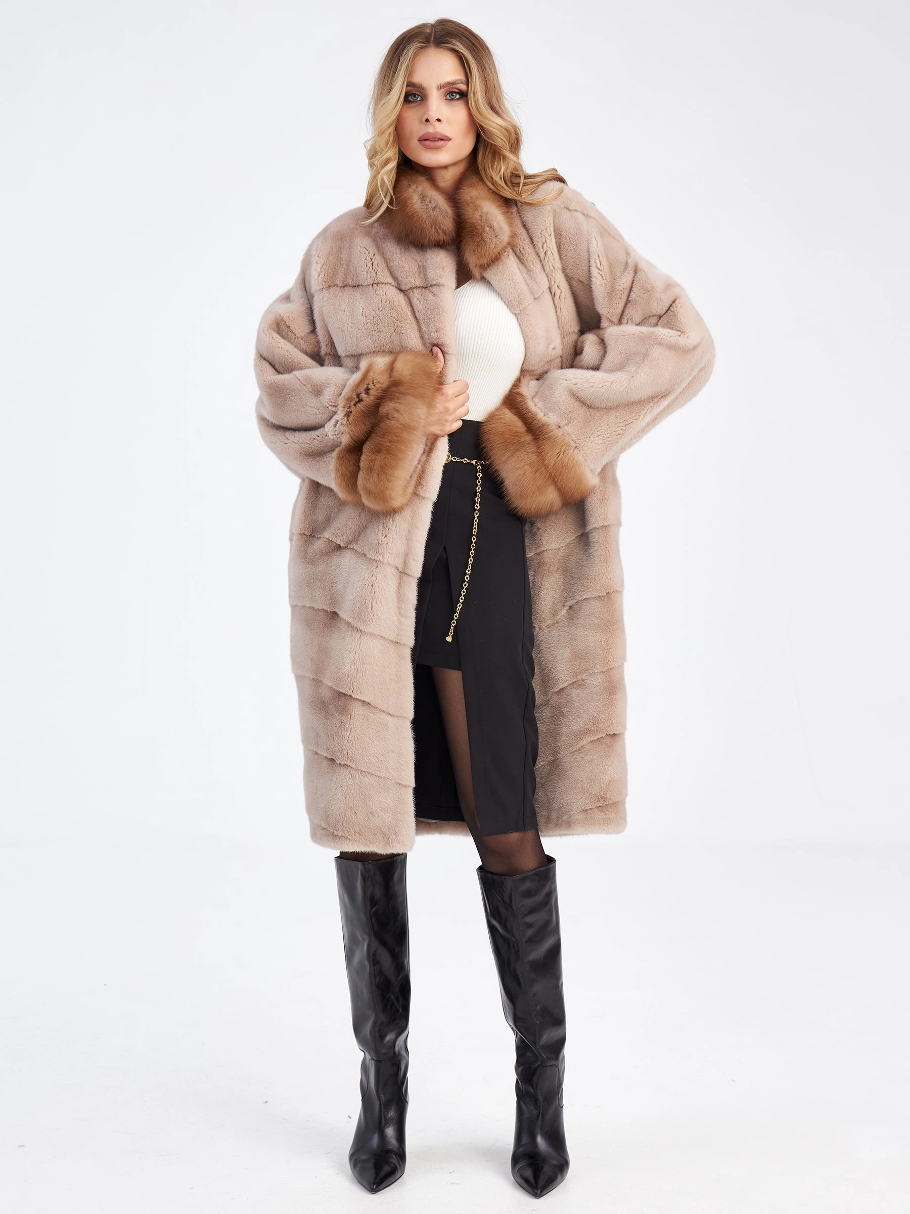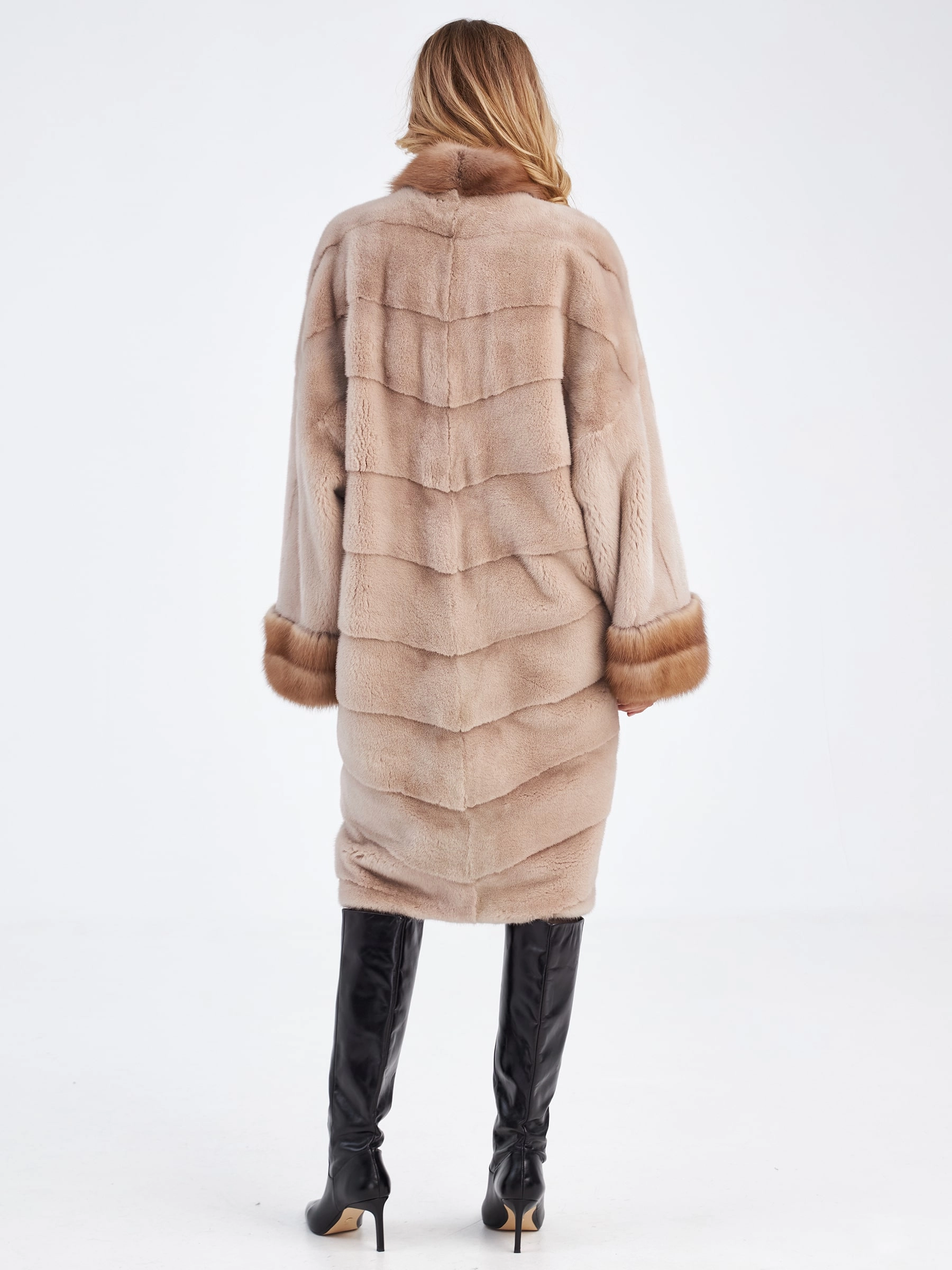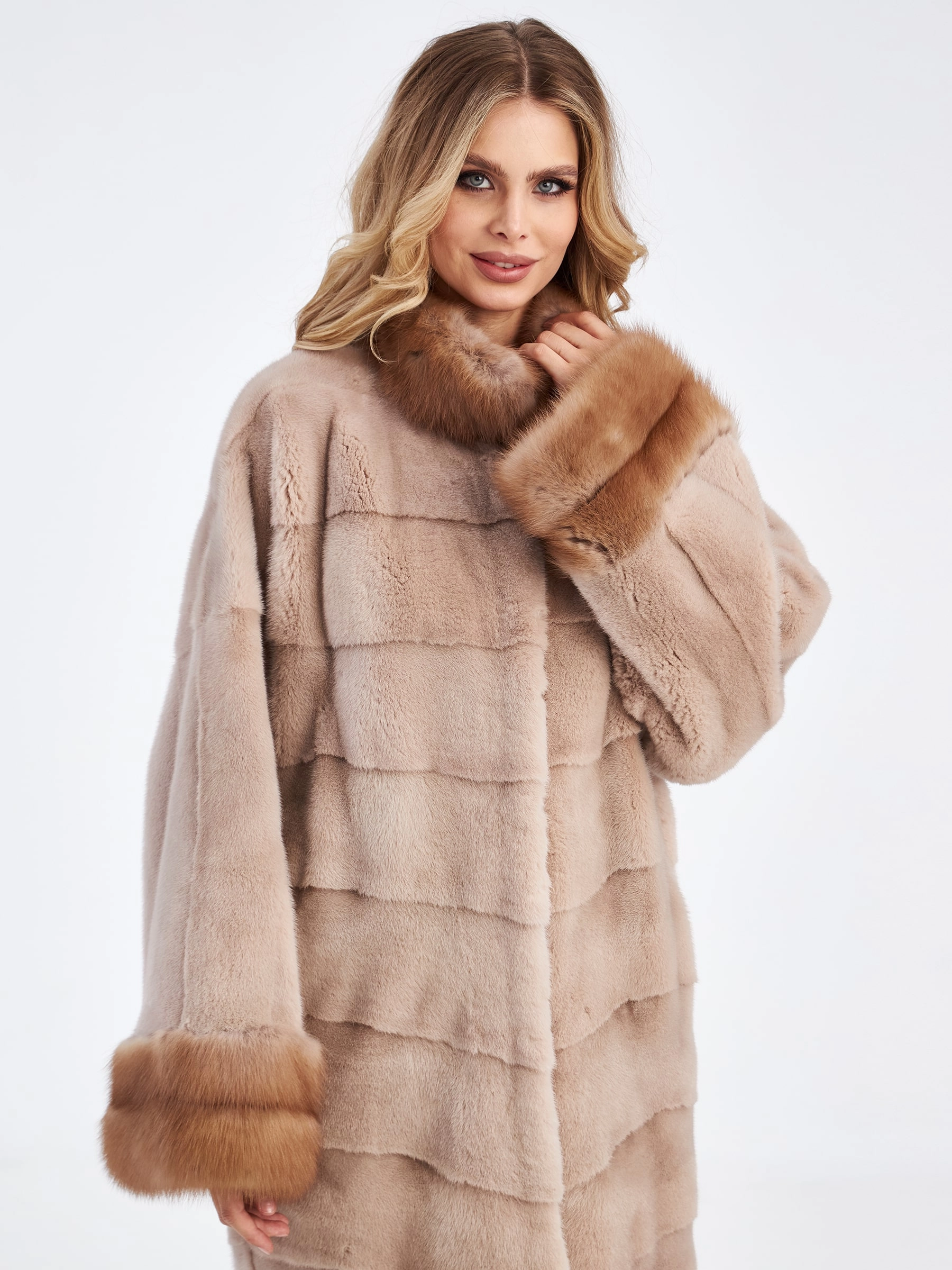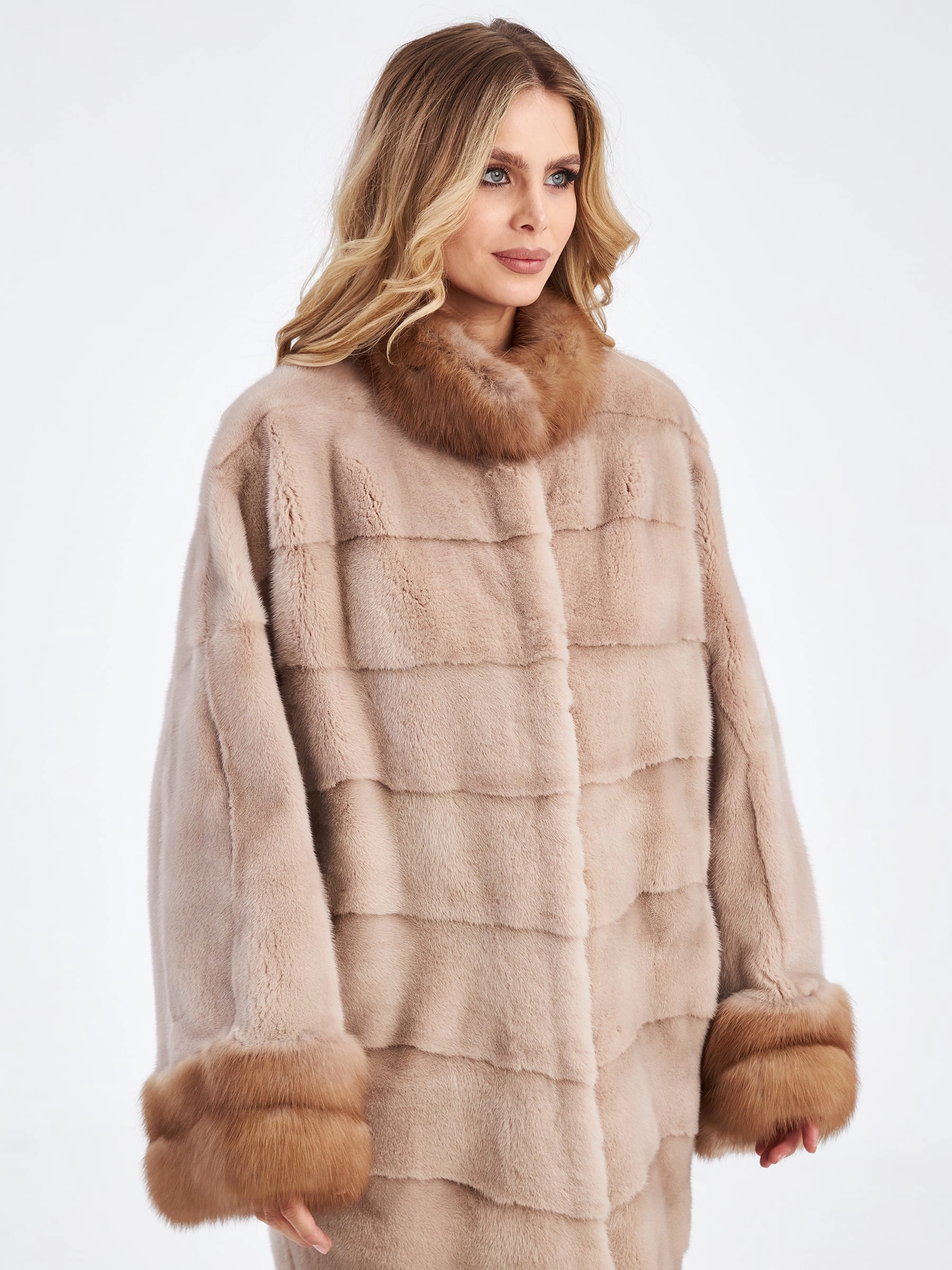 Поперечная длинная женская шуба из меха норки нежного пудрового цвета («жемчуг») с густым мягким ворсом, который дарит ощущение невесомости и роскоши: модель свободного прямого кроя длиной 105 см, выполненная в диагональной раскладке меха с фиксацией на шубные клипсы, не сковывает движений и создает элегантный струящийся силуэт. Главные акценты модели — воротник-стойка и манжеты из шелковистой куницы, которые деликатно обрамляют изделие, добавляя благородный контраст фактур и подчеркивая женственность. Рукав покроя кимоно обеспечивает безупречную свободу и посадку, а смесовая подкладка и лаконичный фасон без единой лишней детали позволяют раскрыться чистоте линий и статусности натурального меха. Это идеальный выбор для холодной зимы: легкая, теплая и невероятно комфортная шуба подарит вам тепло и уверенность в любой ситуации. Совет стилиста: нежный жемчужный оттенок норки эффектно сочетается с фактурным трикотажем крупной вязки, молочной замшей и серым кашемиром — дополните образ объемным свитером и перчаткам