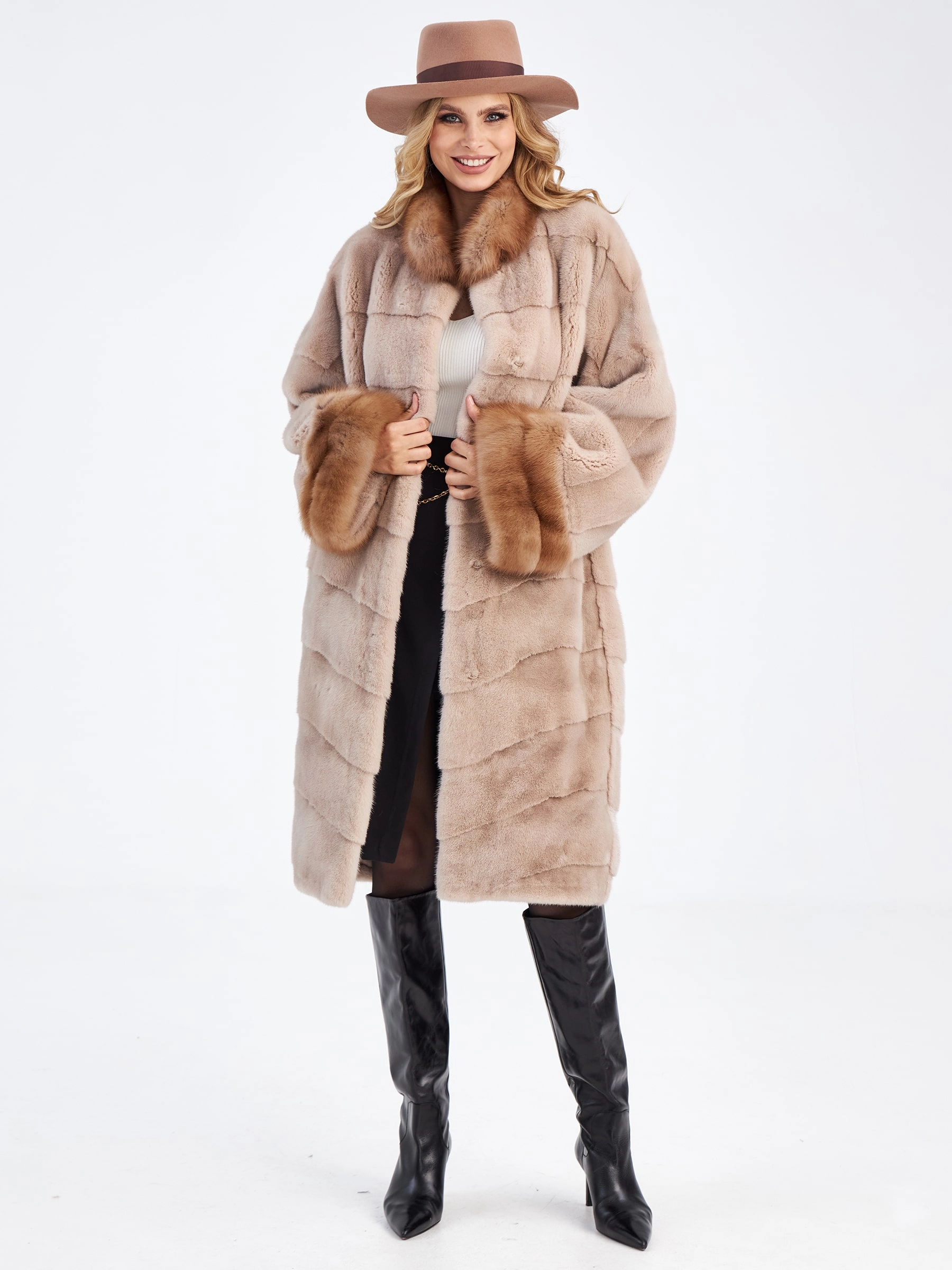Поперечная длинная женская шуба из меха норки с отделкой из меха куницы Анастасия(ск), пудровая, размер 38, артикул 33700