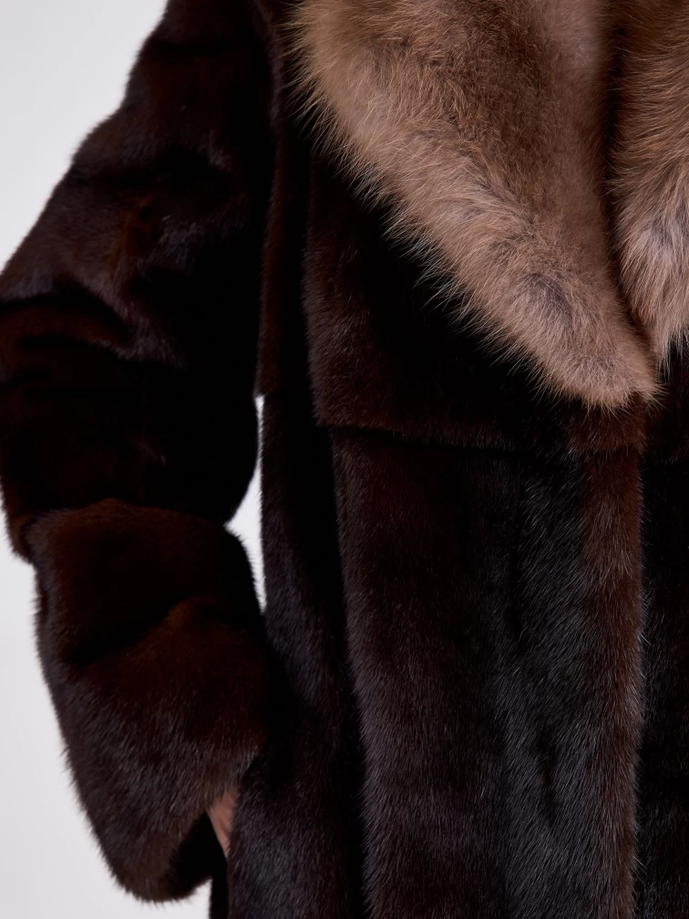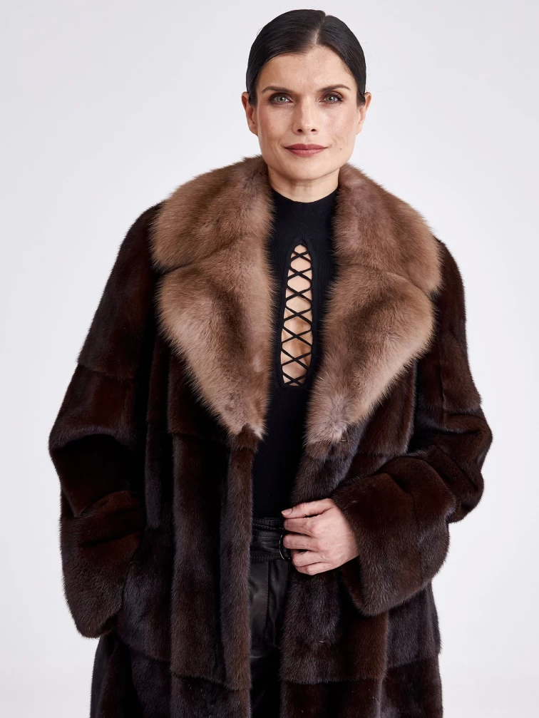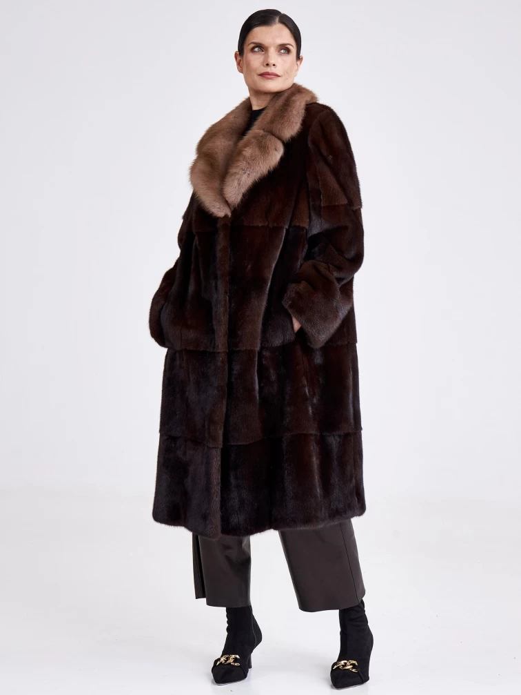 Шуба из меха норки женская Лола(вк), длинная, с воротником из меха куницы, темно-коричневая, размер 54, артикул 33300