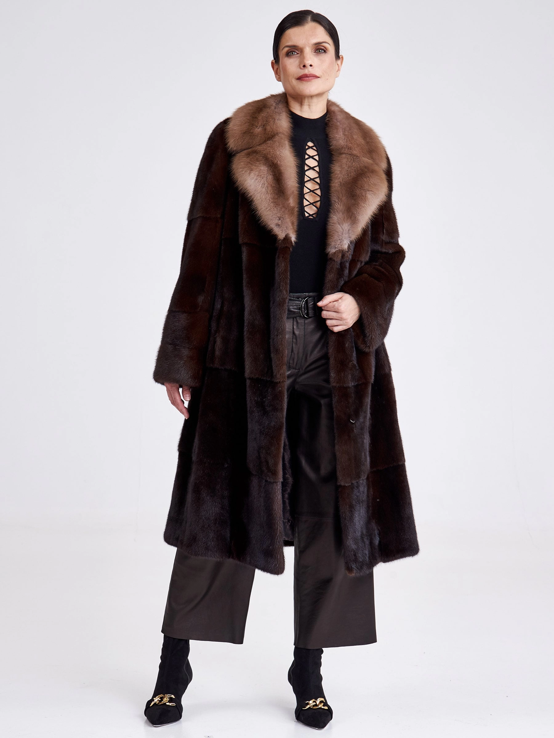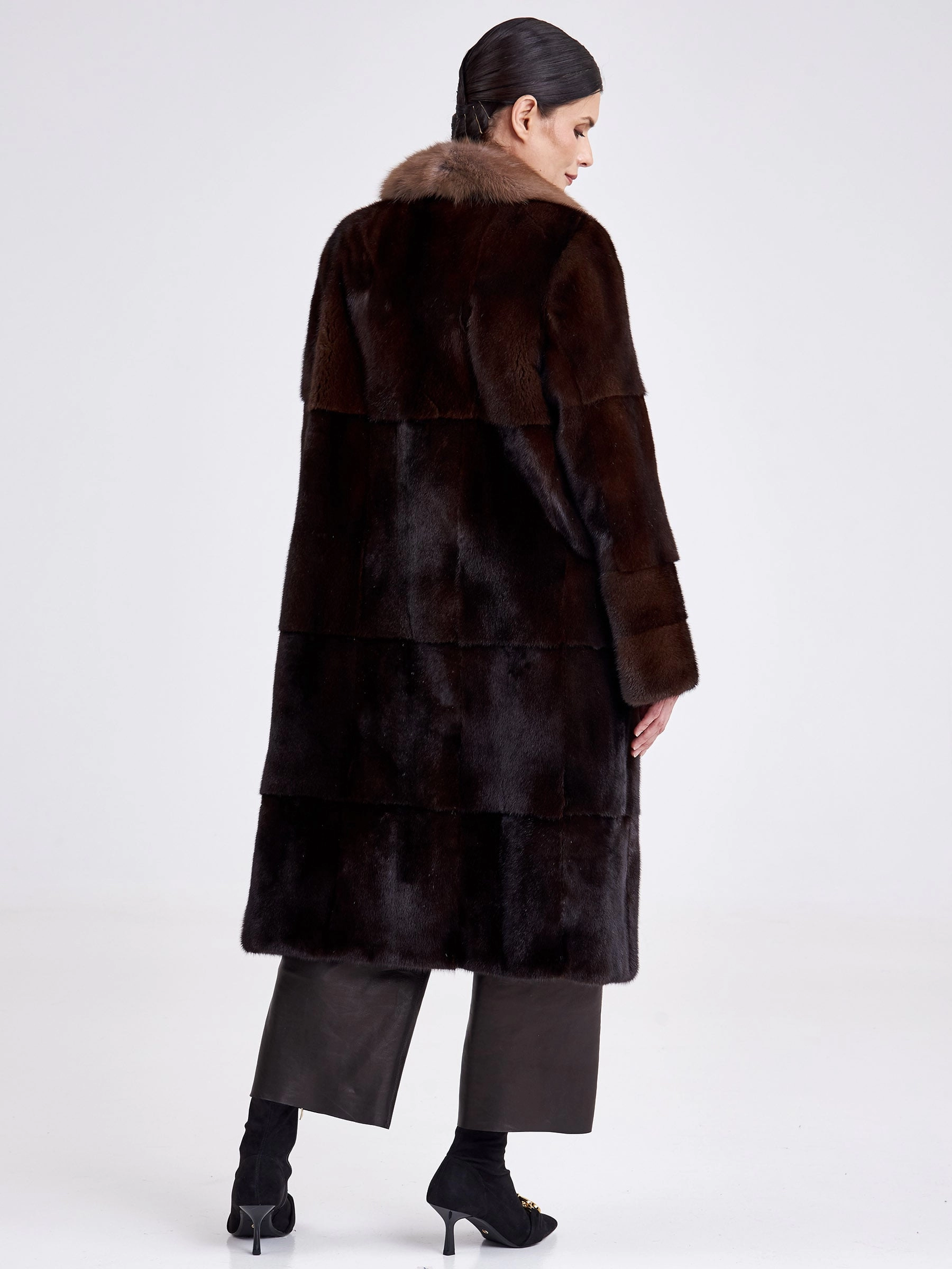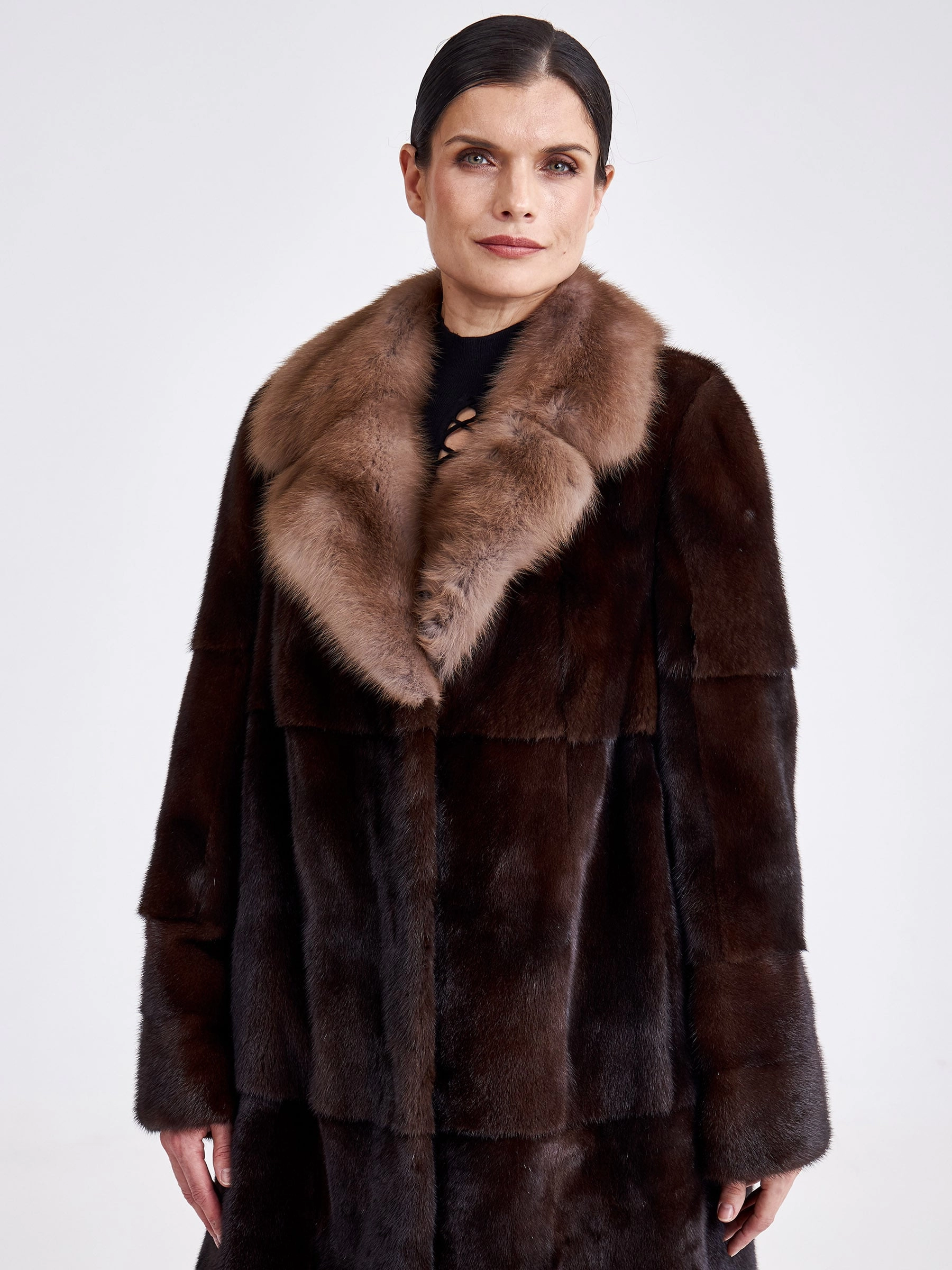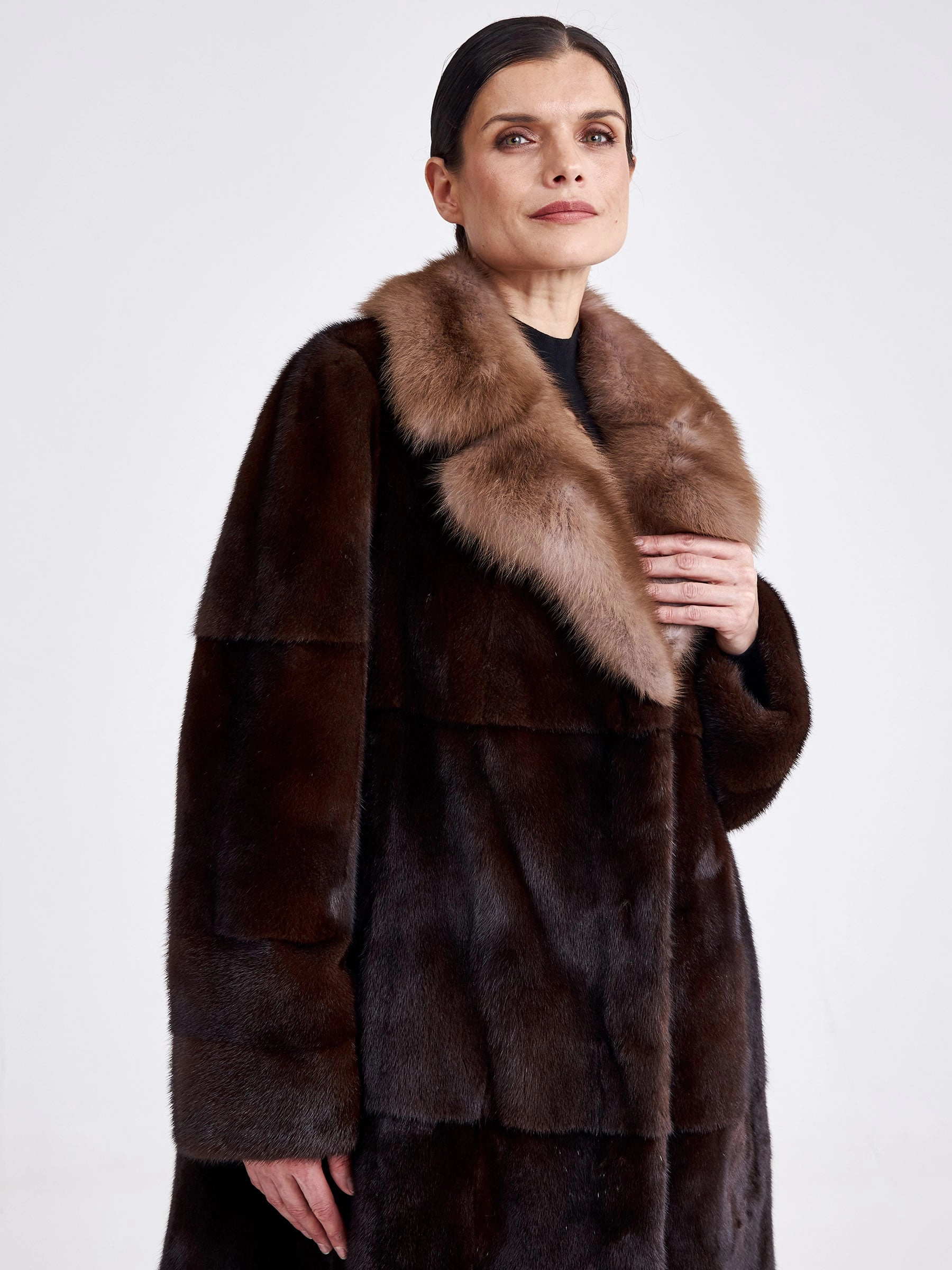 Товар шуба из меха норки женская лола(вк), длинная, с воротником из меха куницы, темно-коричневая, размер 54, артикул 33300 выполнен из норка крашенной с застежкой клипсы. Рассчитан на сезон: зима. Длина изделия свыше 90 см, силуэт прямой.