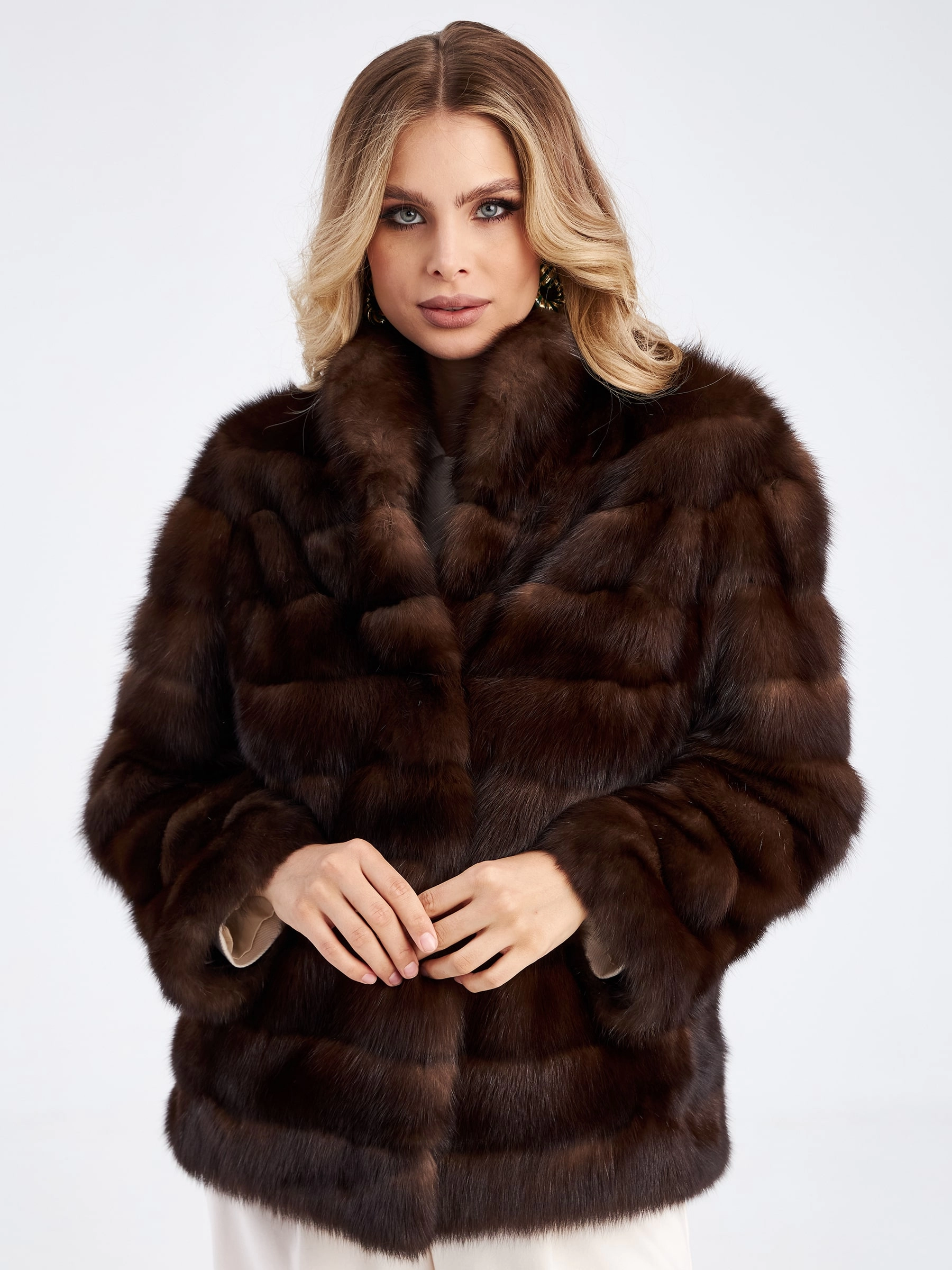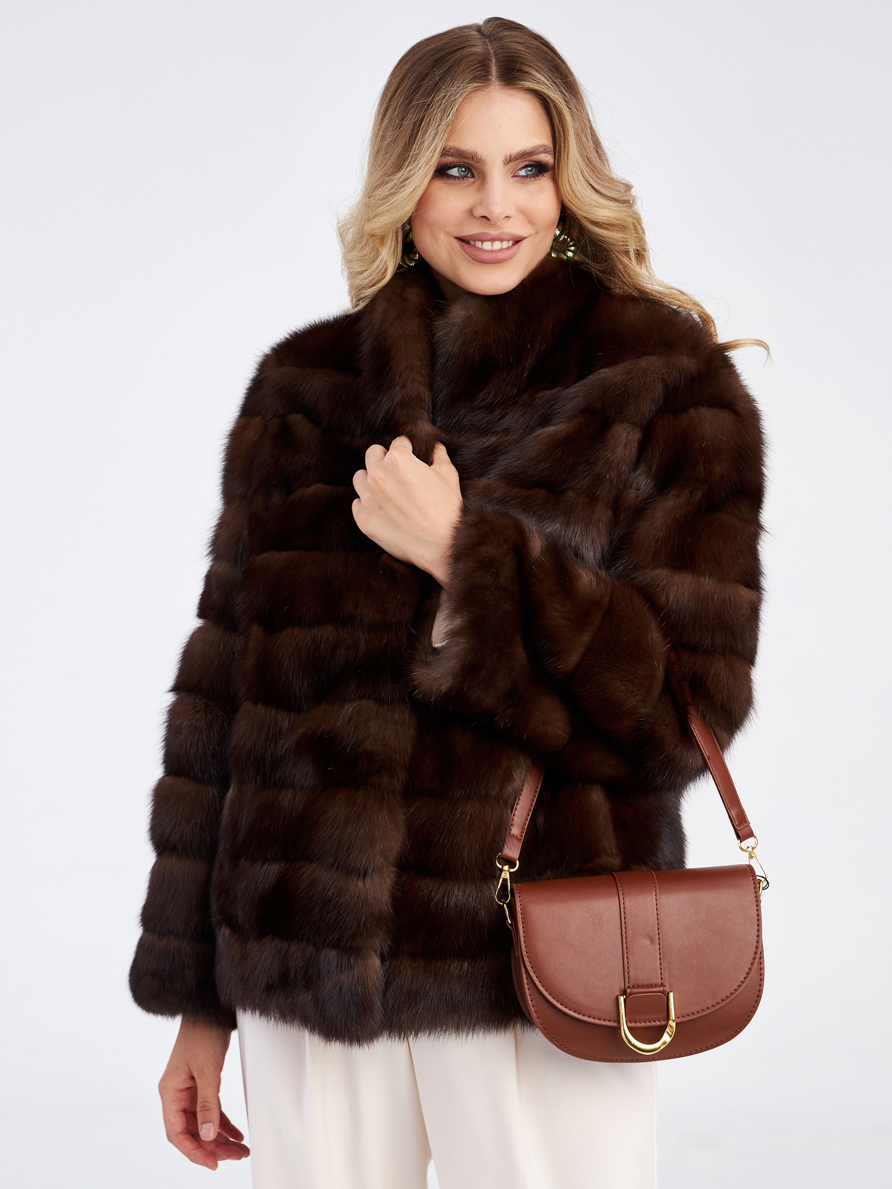 Соболиная шуба автоледи для женщин премиум-класса — воплощение исключительной роскоши и непревзойденного комфорта: мастера создали эту короткую модель из драгоценного меха соболя с естественным темно-коричневым оттенком, который искрится благородным блеском и дарит ощущение невесомой легкости при каждом движении. Густая подпушь делает мех невероятно приятным на ощупь и обеспечивает надежное сохранение тепла даже в самые холодные зимы. Модель классического прямого кроя длиной 65 см с втачным рукавом и воротником-стойкой выполнена в горизонтальной раскладке меха с фиксацией на клипсы, что гарантирует безупречную посадку и полную свободу движений за рулем. Лаконичный фасон без лишней отделки, смесовая подкладка и безупречный подбор меха подчеркивают статусность и премиальное качество изделия. Совет стилиста: благородный темно-коричневый соболь эффектно сочетается с фактурным трикотажем верблюжьих и молочных оттенков, мягкой замшей и кашемиром — добавьте объемный свитер и перчатки цвета графита или топленого моло