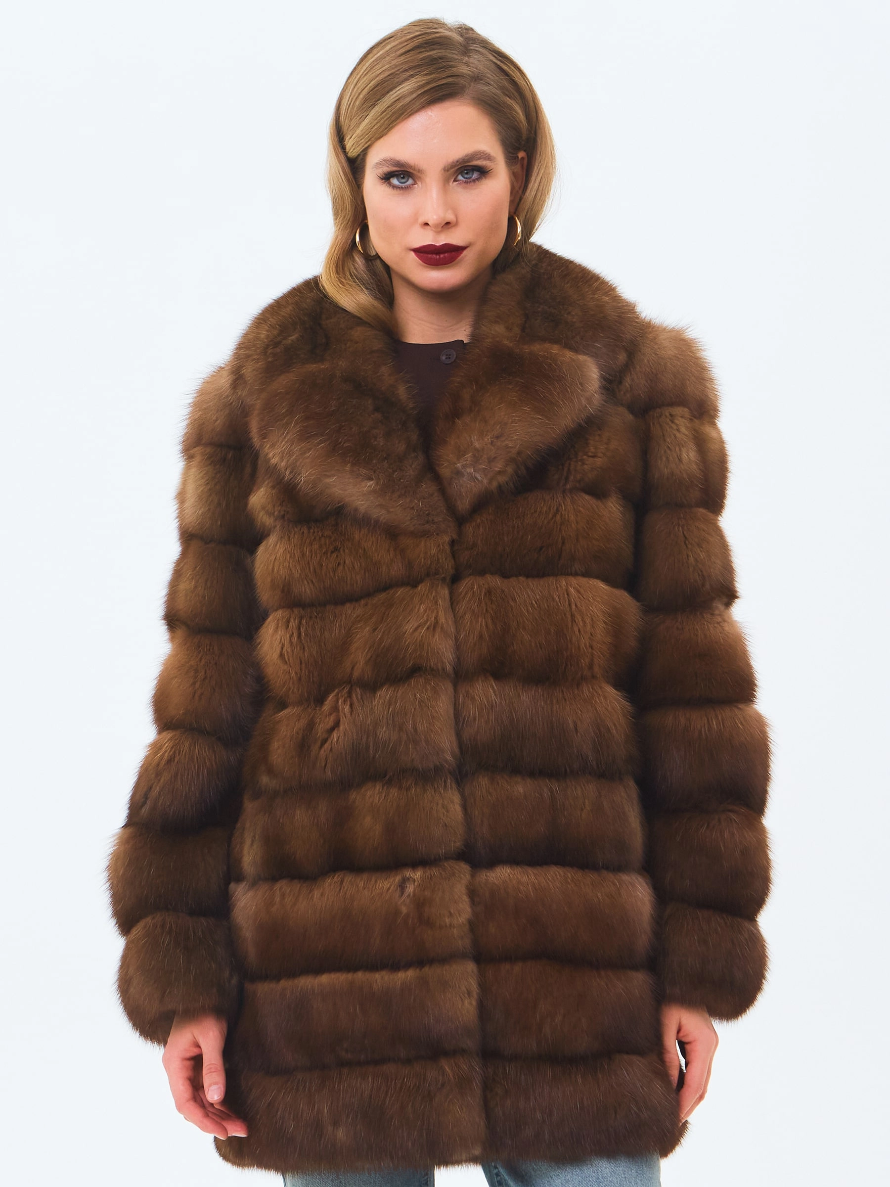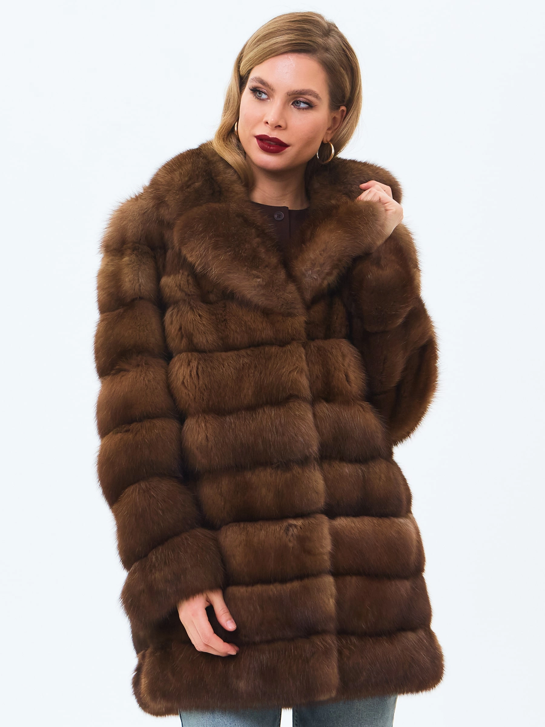 Товар шуба из меха соболя женская премиум класса 2а, темно-коричневая, размер 46, артикул 34210 выполнен из соболь с застежкой клипсы. Рассчитан на сезон: зима. Длина изделия 77 см, силуэт прямой.
