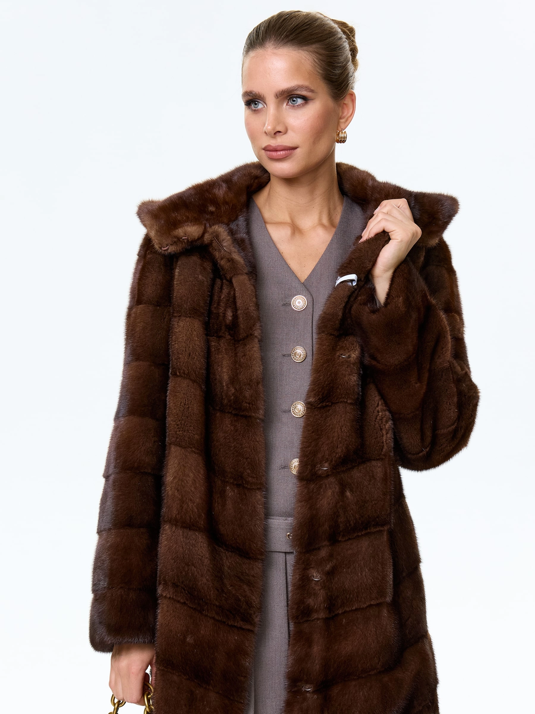 Товар норковая женская шуба с капюшоном галя(к), коричневая, размер 50, артикул 34070 выполнен из норка с застежкой клипсы. Рассчитан на сезон: зима. Длина изделия 100 см, силуэт прямой.