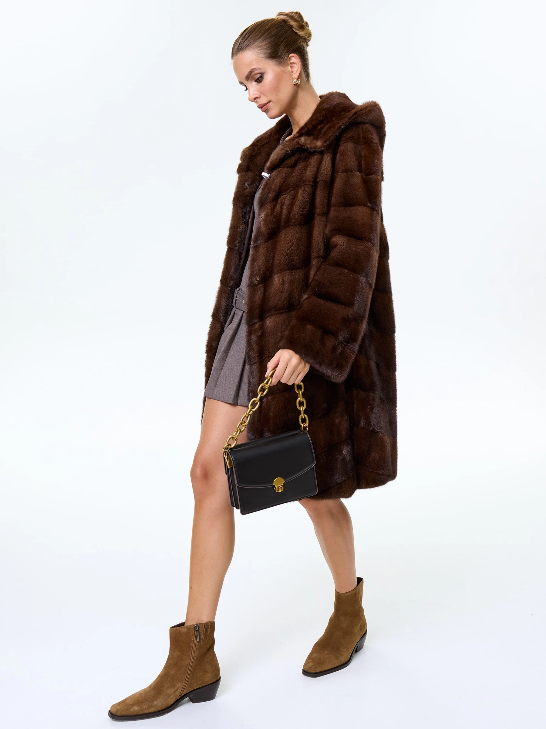 Для пошива шубы прямого кроя использовали шелковистый мех норки. Модель дополнили двумя боковыми карманами и объемным капюшоном. Изделие застегивается клипсами.
