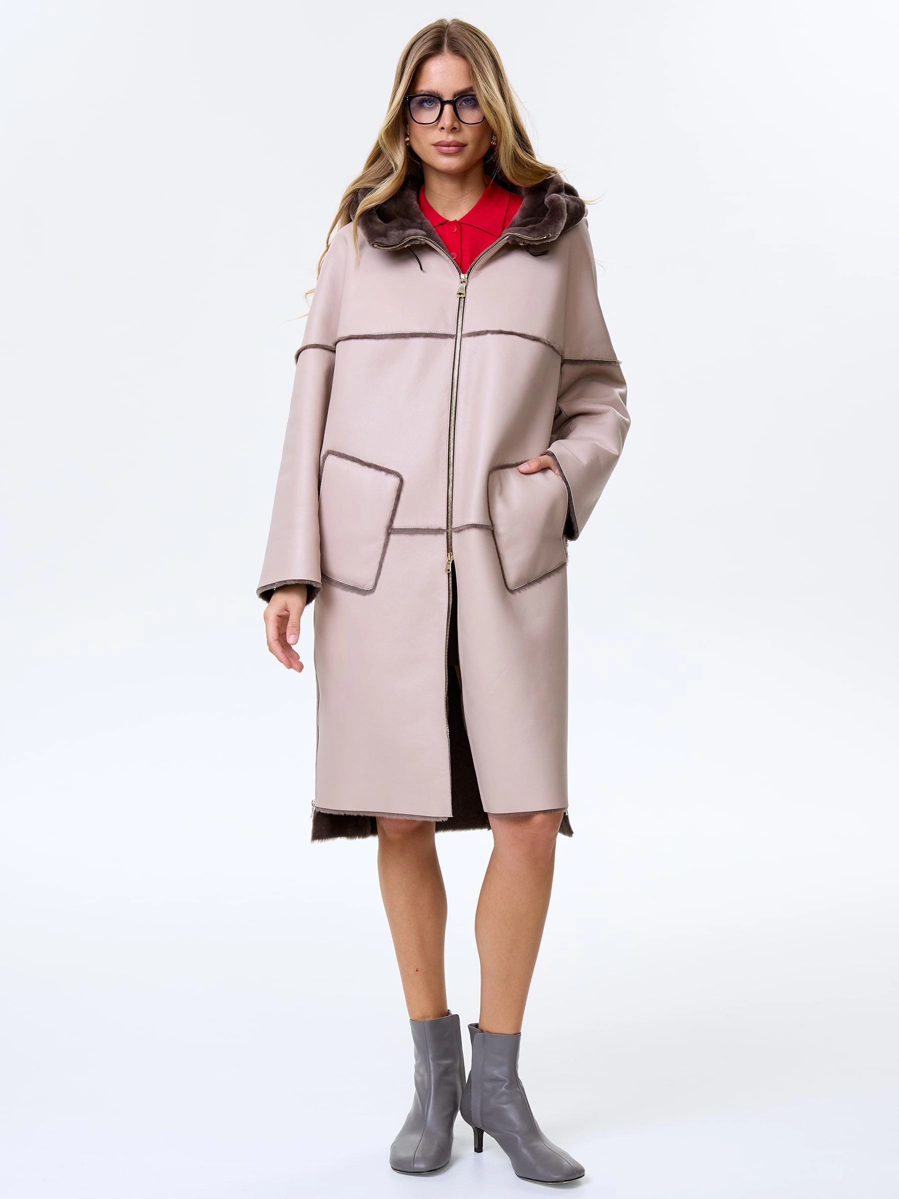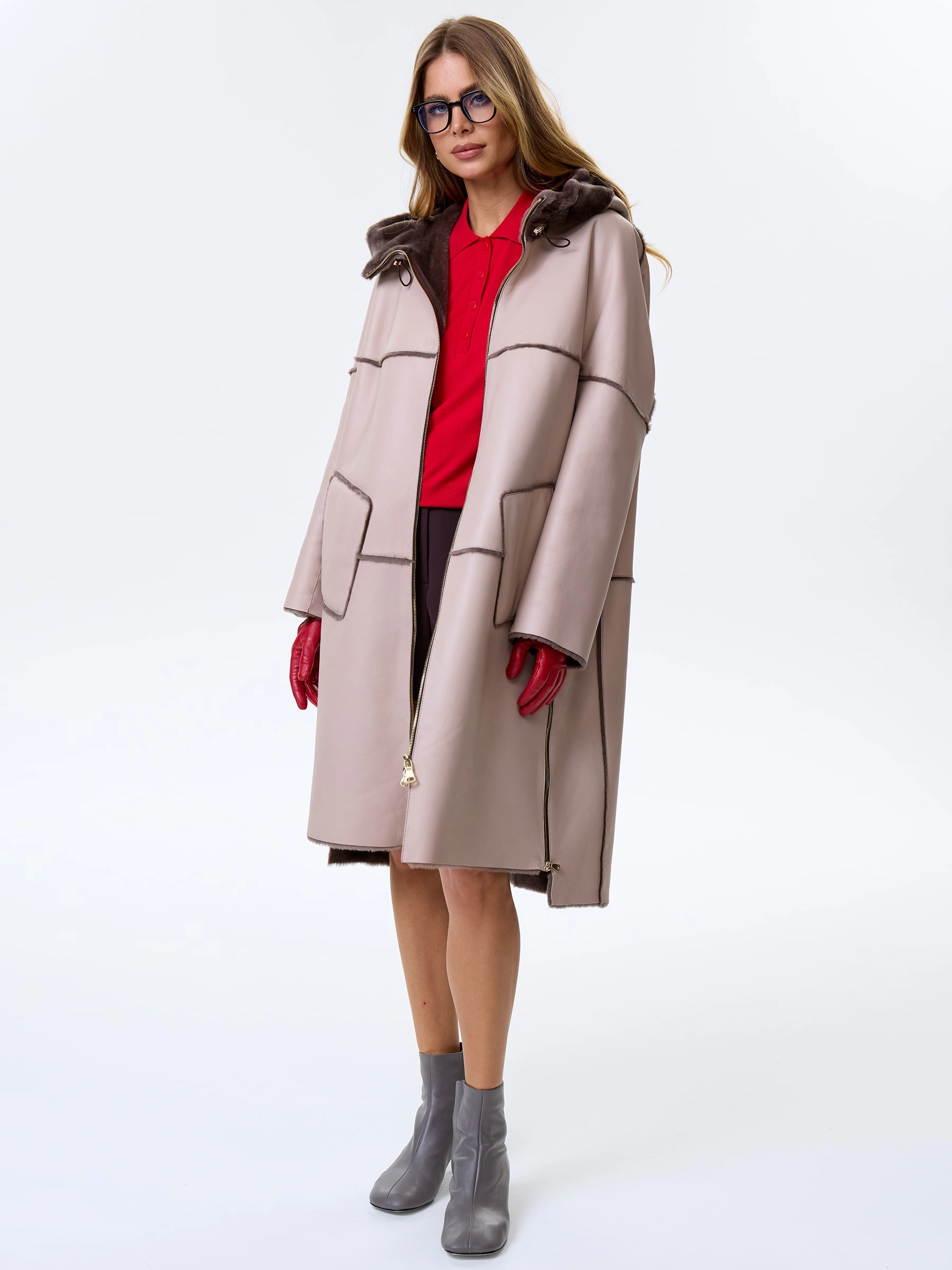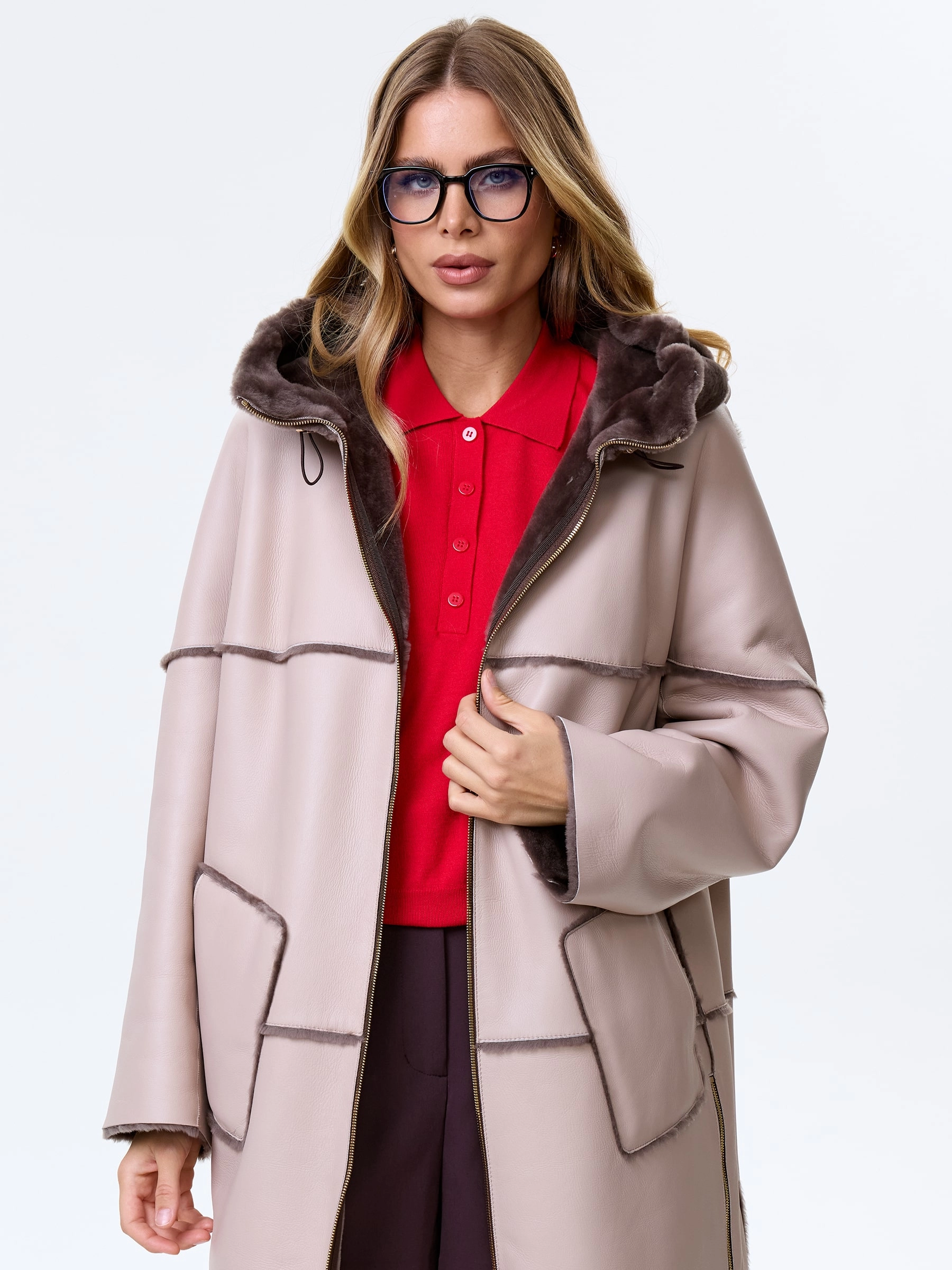Товар стильная женская дубленка оверсайз с капюшоном премиум класса 2052, бежевая, размер 46, артикул 62460 выполнен из овчина "мерино" с застежкой молния. Рассчитан на сезон: осень-зима. Длина изделия 105 см, силуэт свободный.