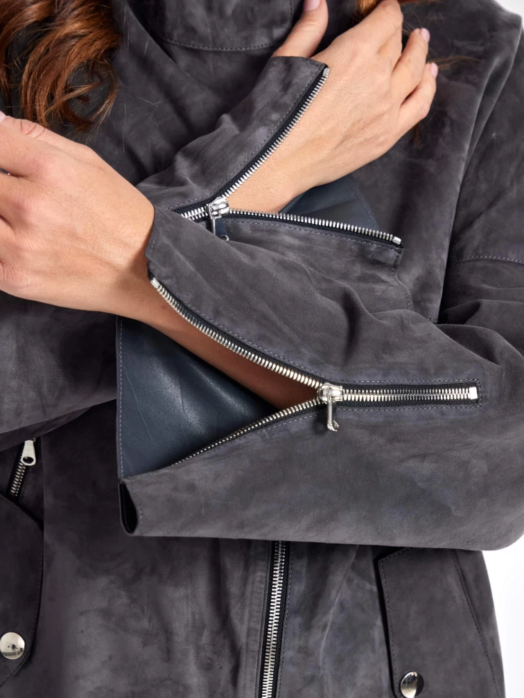 Товар стильное замшевое пальто оверсайз для женщин премиум класса 3041з, серое, размер 54, артикул 64100 выполнен из натуральной замши с застежкой молния. Рассчитан на сезон: весна-лето. Длина изделия 105 см, силуэт оверсайз.