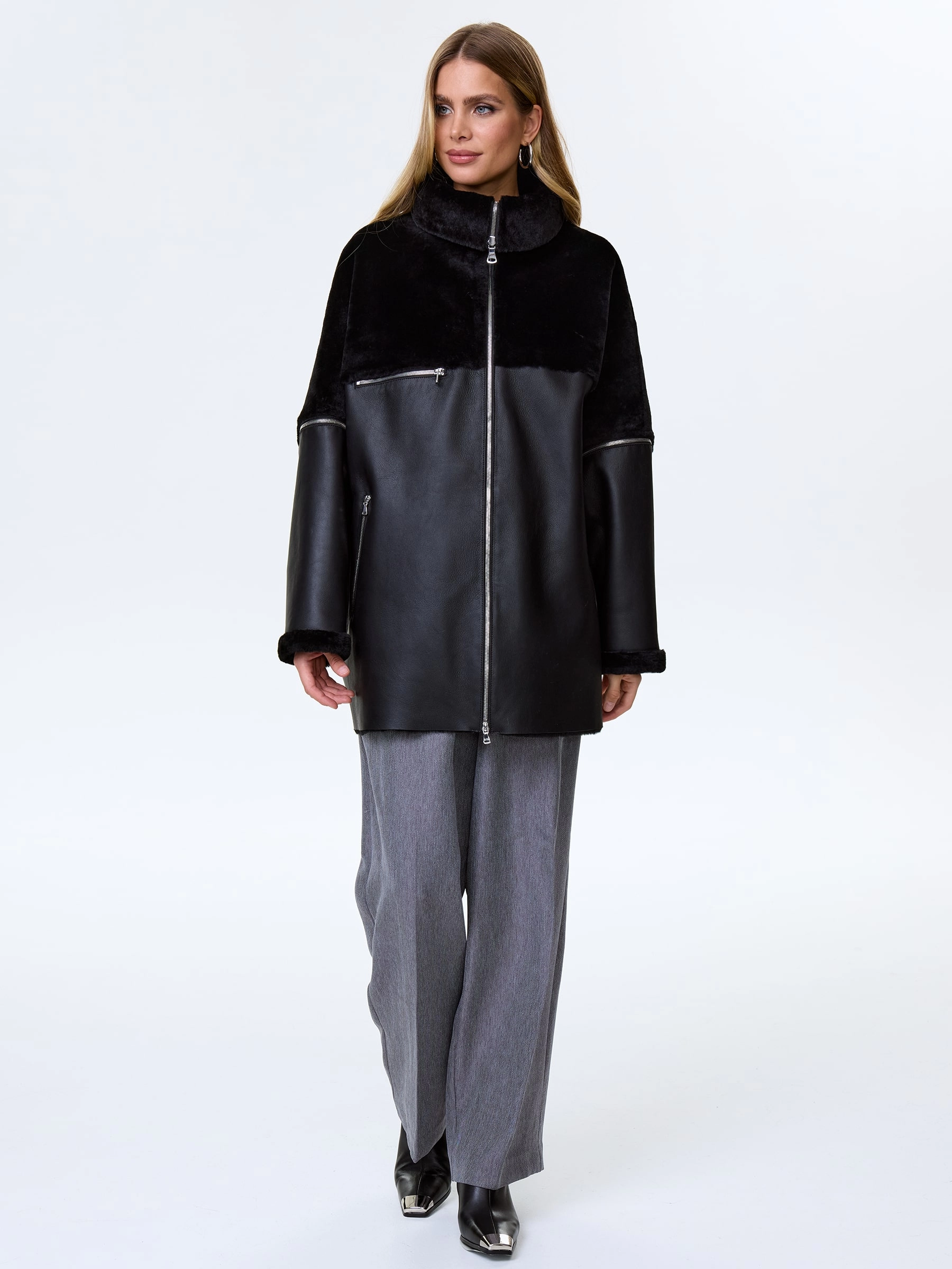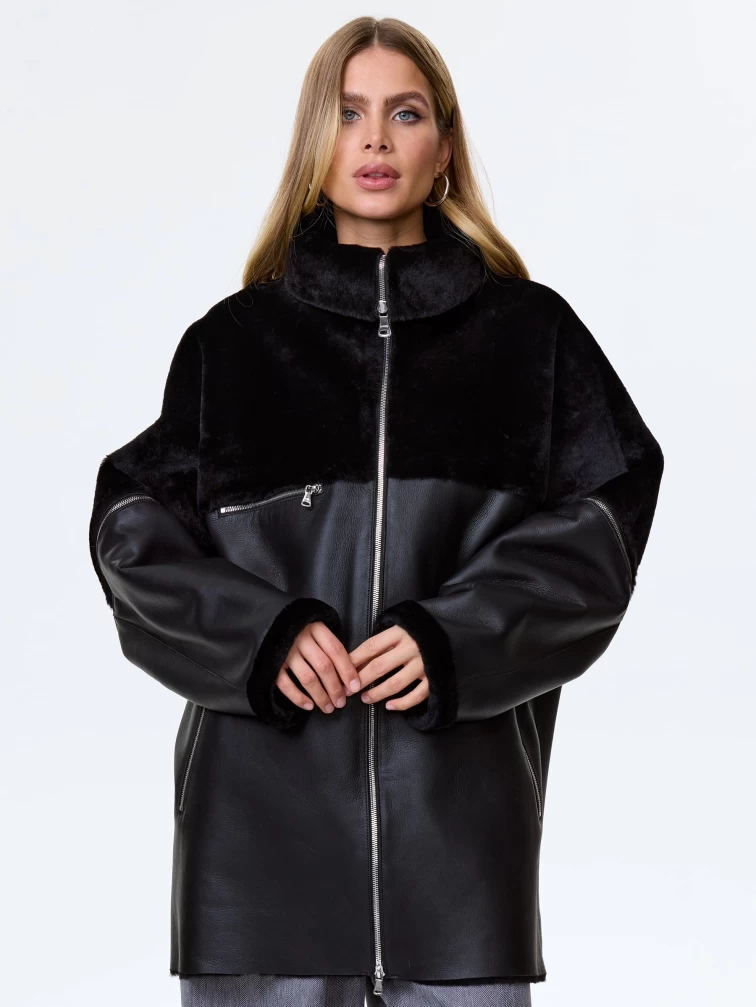 Товар стильное женское полупальто из натуральной овчины премиум класса 2051, черное, размер 48, артикул 64380 выполнен из овчина "мерино" с застежкой молния. Рассчитан на сезон: осень-зима. Длина изделия 80 см, силуэт свободный.