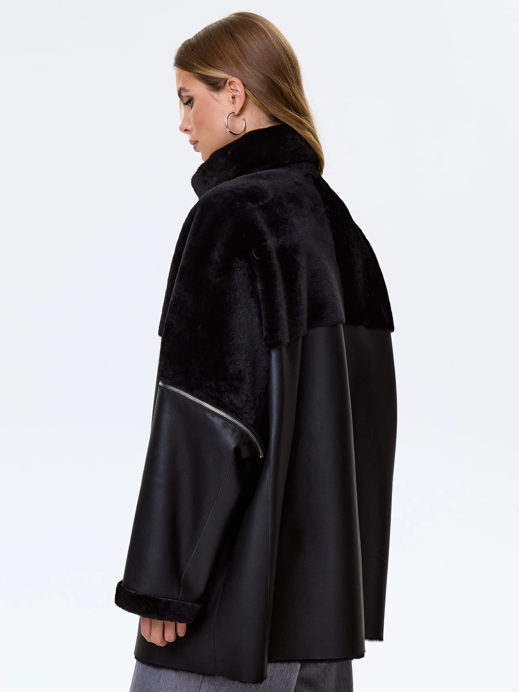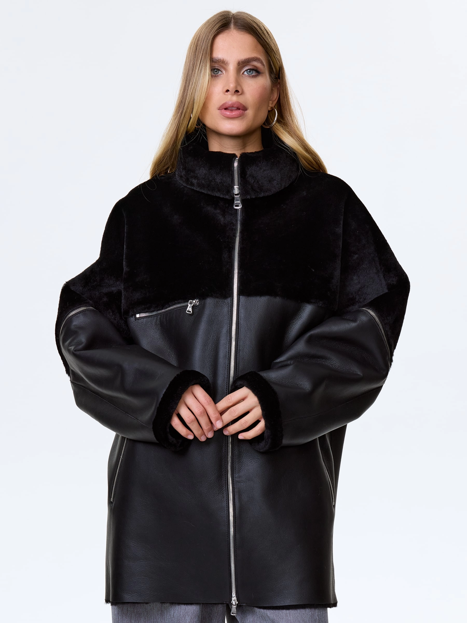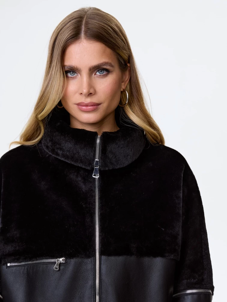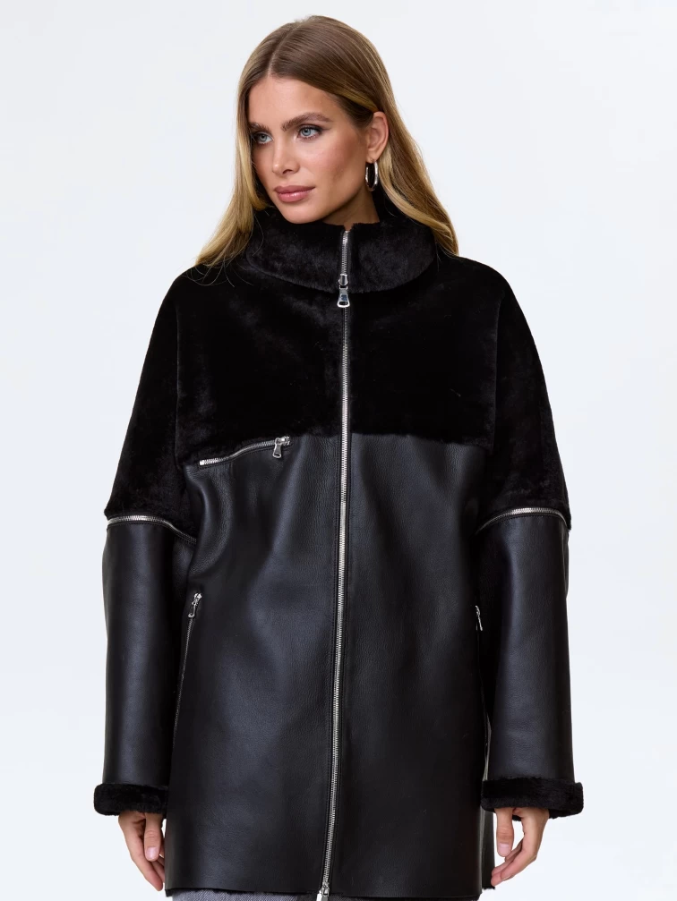 Это полупальто выполнили из натуральной стриженной овчины. Свободный крой, высокий воротник-стойка легко трансформируется в отложной. Изменить модель можно при помощи отстегивающихся рукавов. Карманы как и само изделие застегиваются молниями.