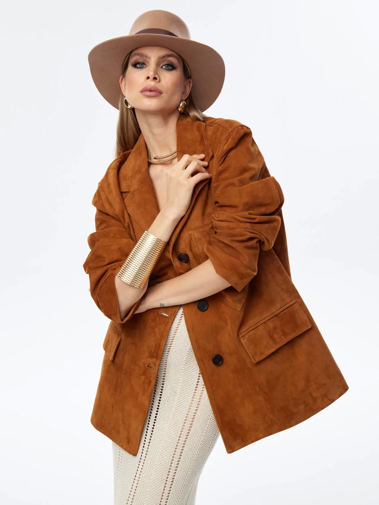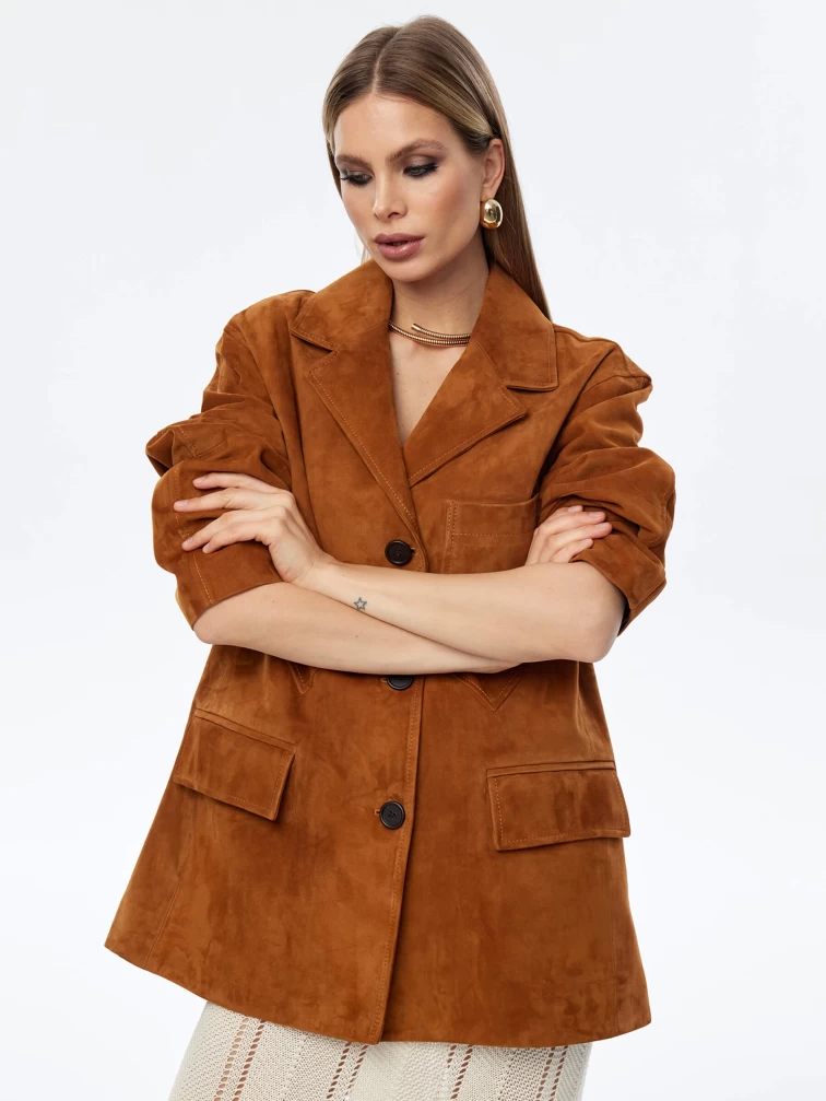 Стильный удлиненный замшевый женский пиджак премиум класса 3069з, виски, размер 44, артикул 23840
