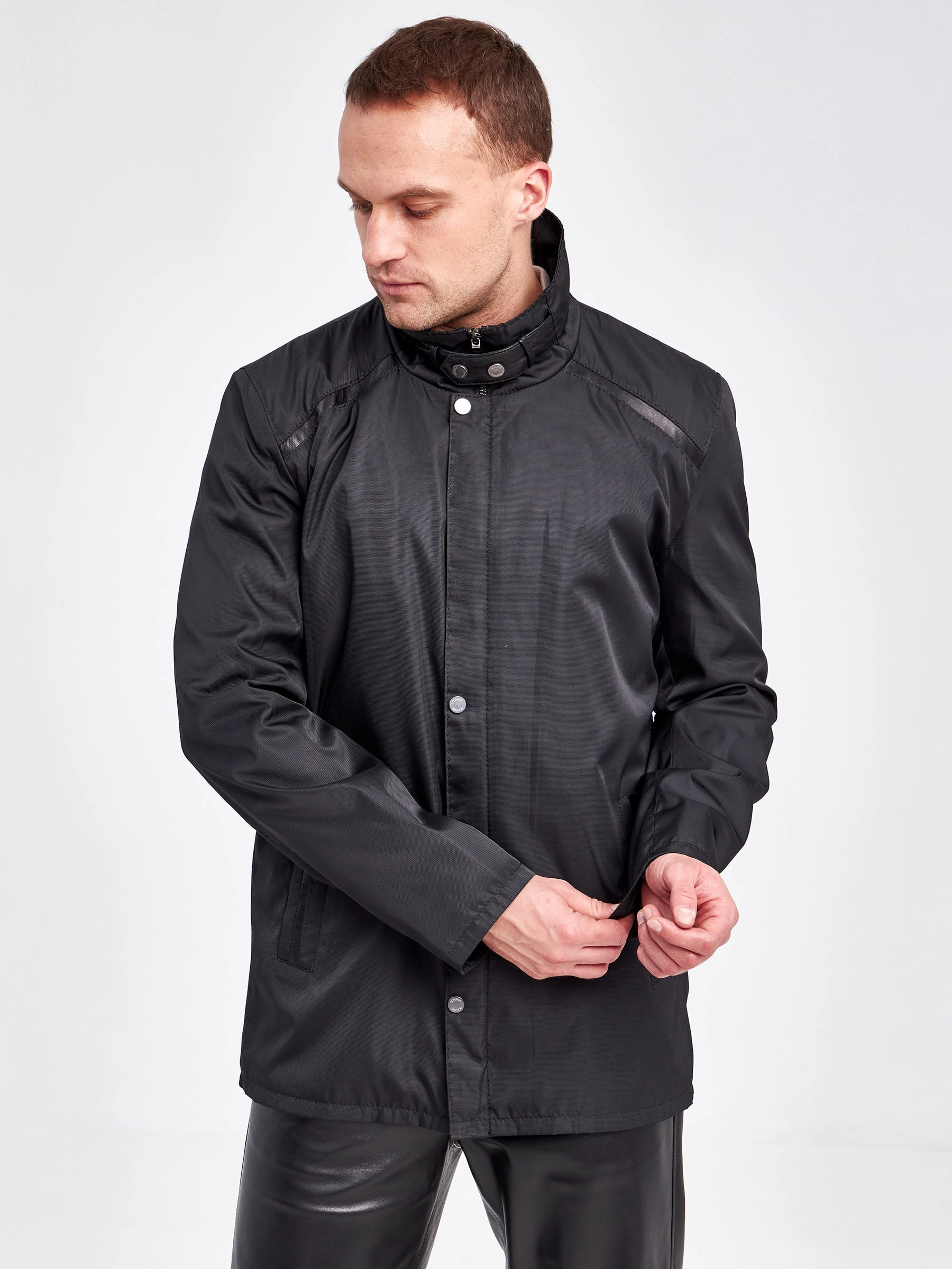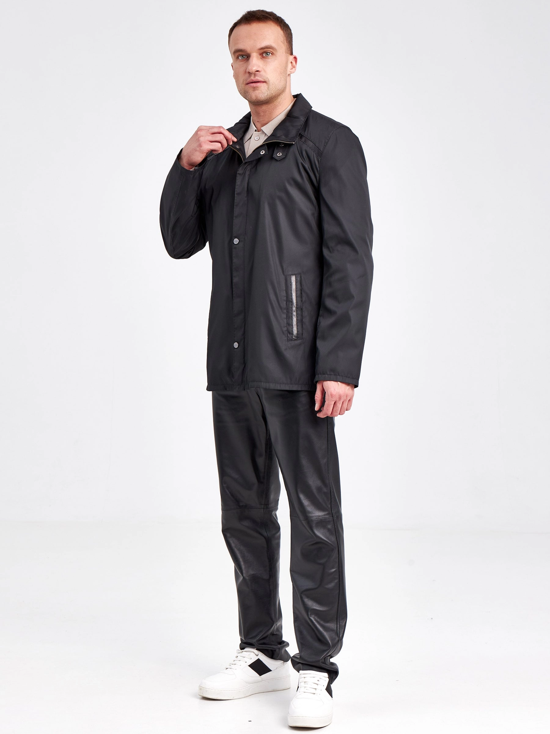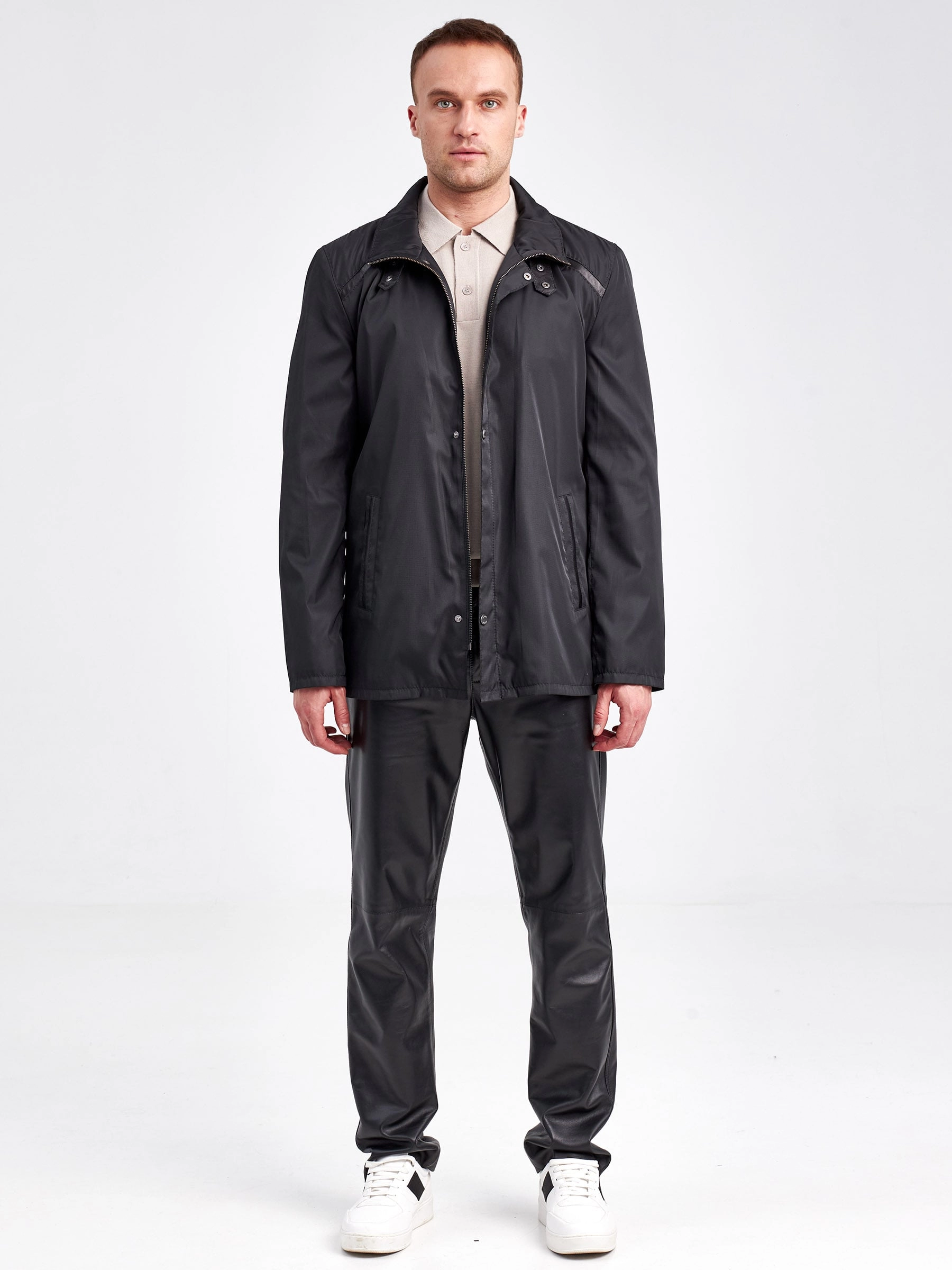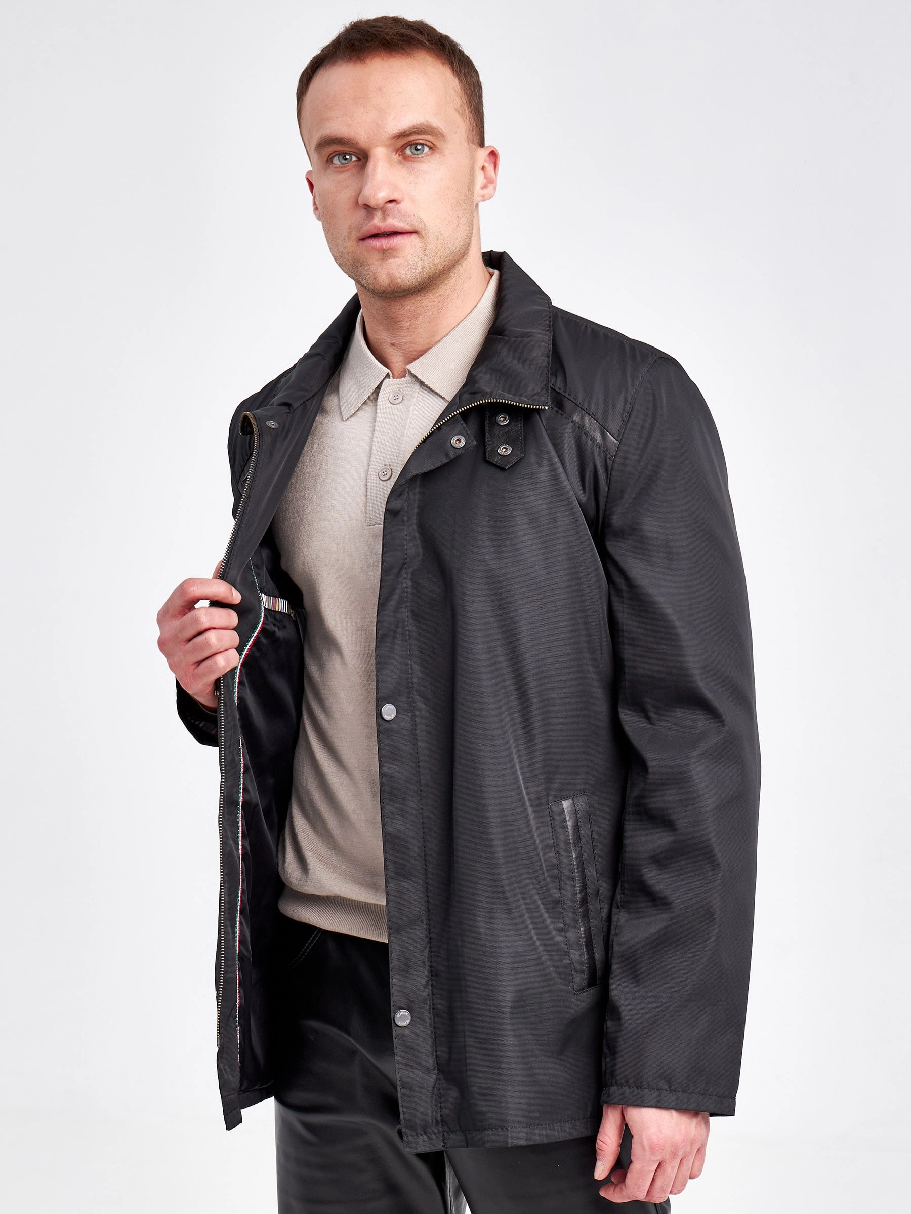 Современная мужская демисезонная куртка с отделками из натуральной кожи.